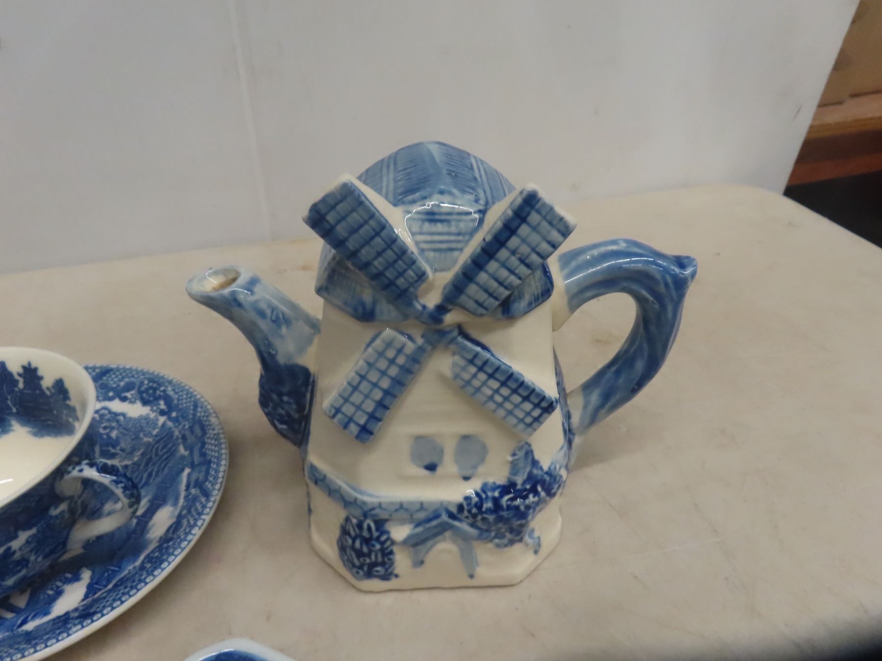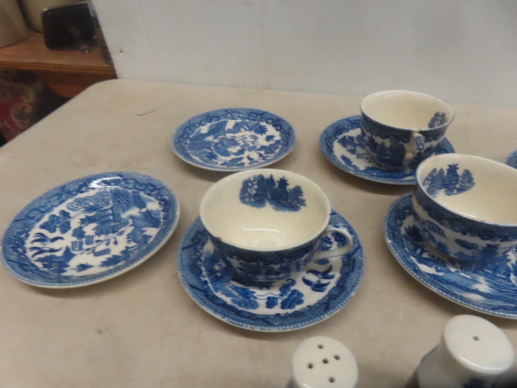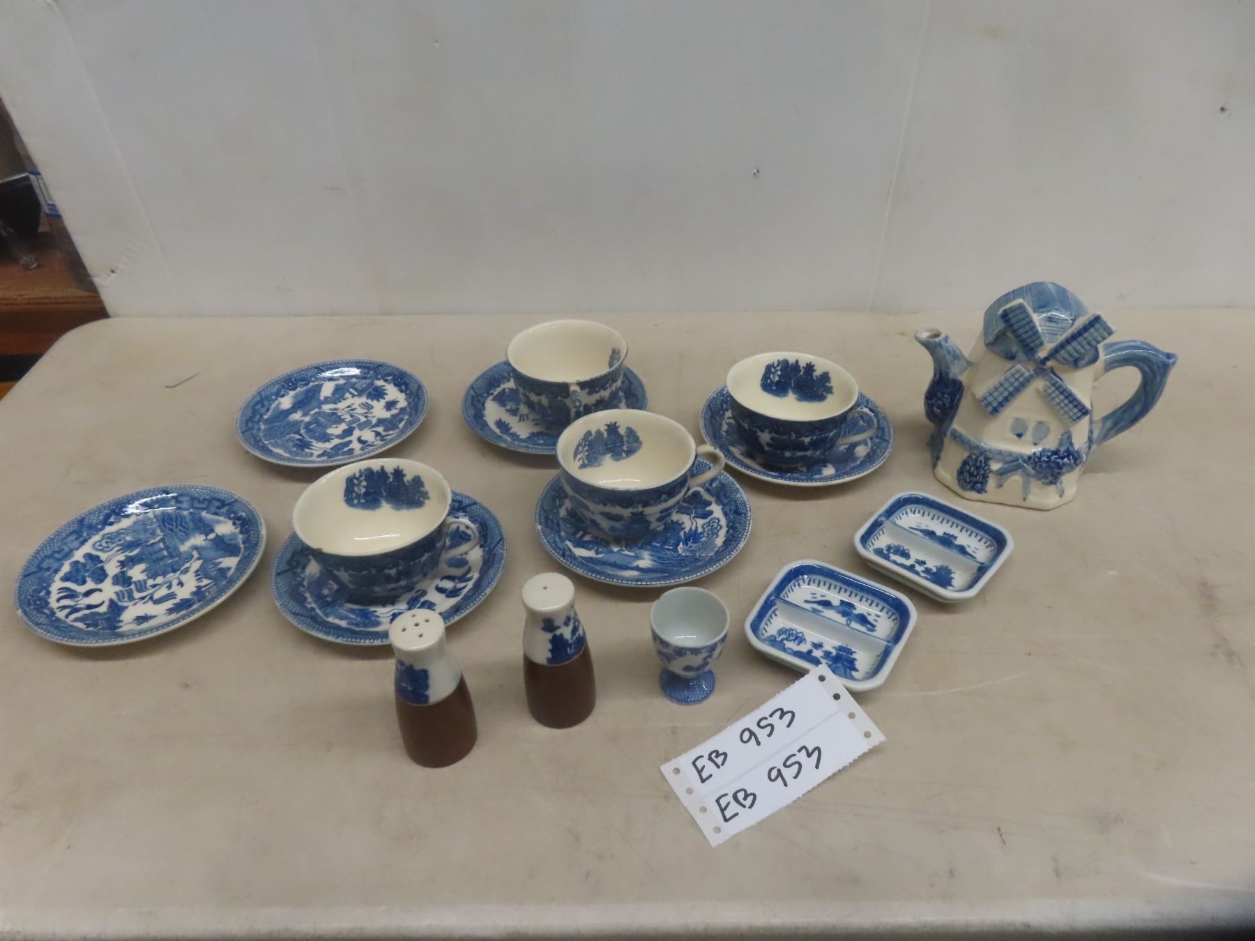 Blue Willow Cream + Sugar Teapot, Salt + Pepper +
