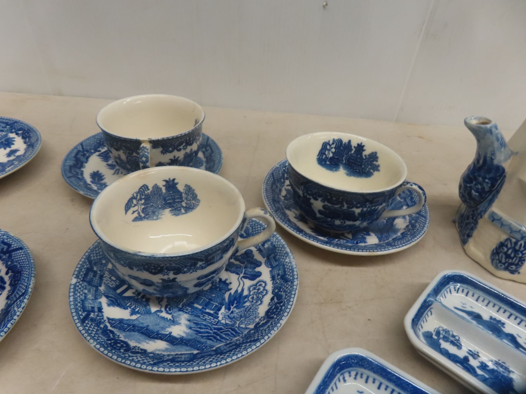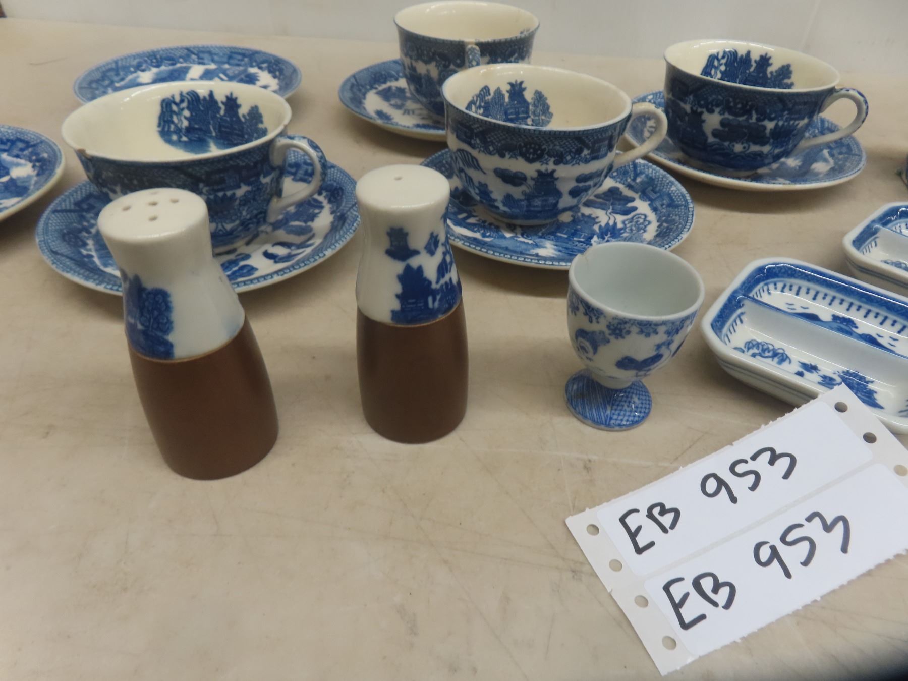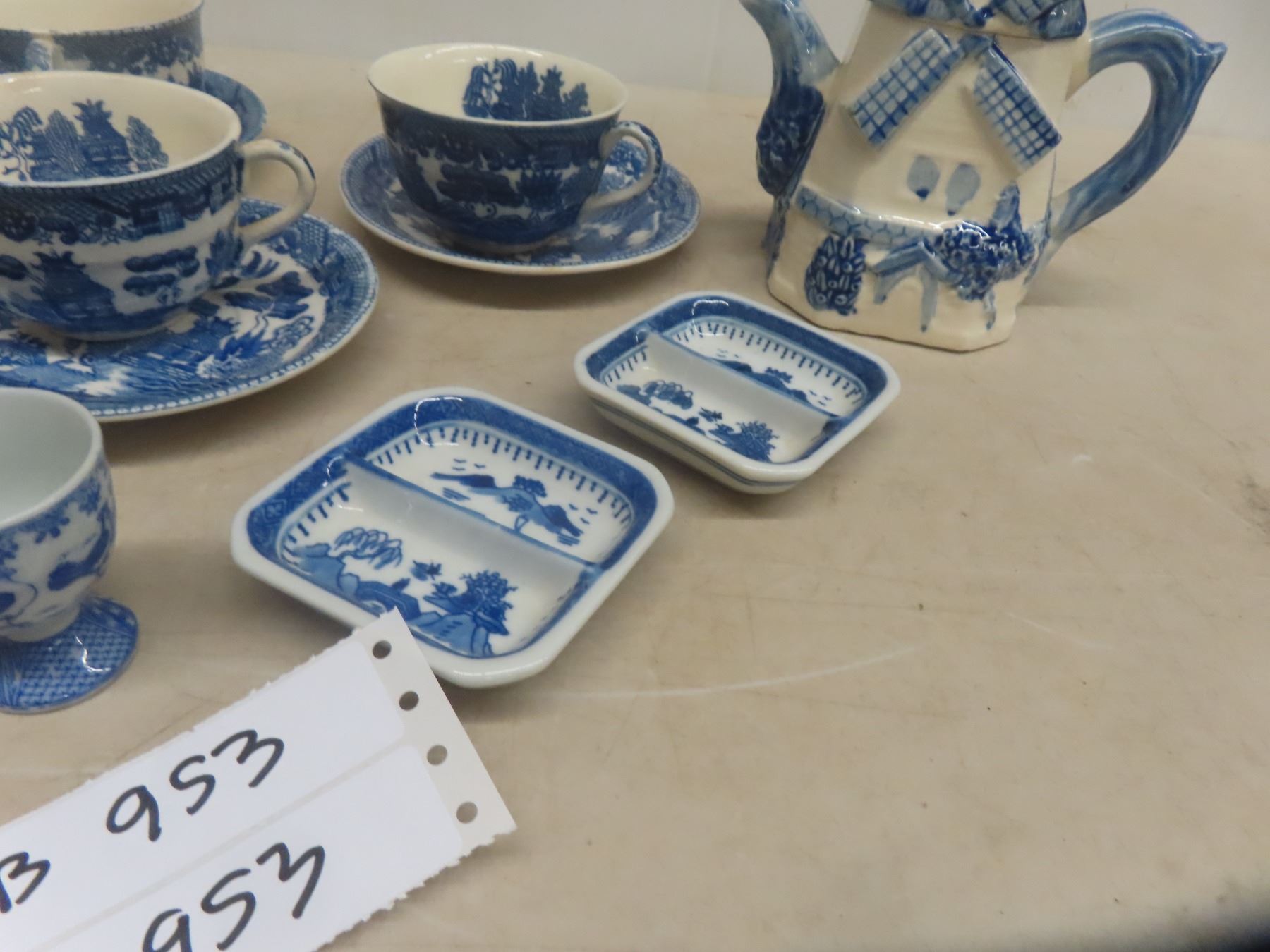 Blue Willow Cream + Sugar Teapot, Salt + Pepper +