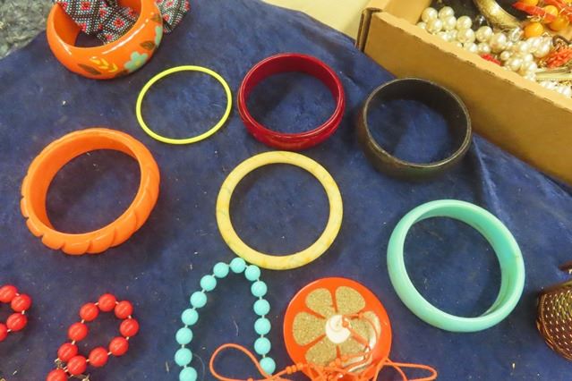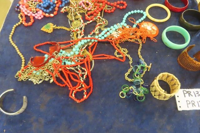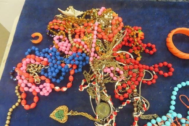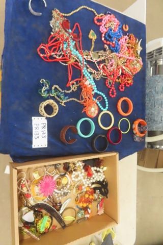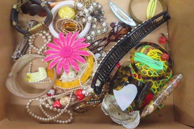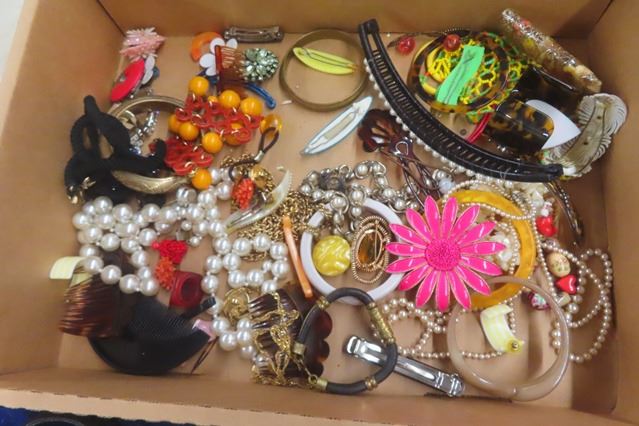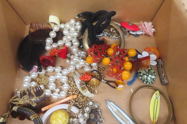 Box Lot of Assorted Costume Jewelry ; Necklaces, Brooches, Bracelets, Hair Clips, Earrings