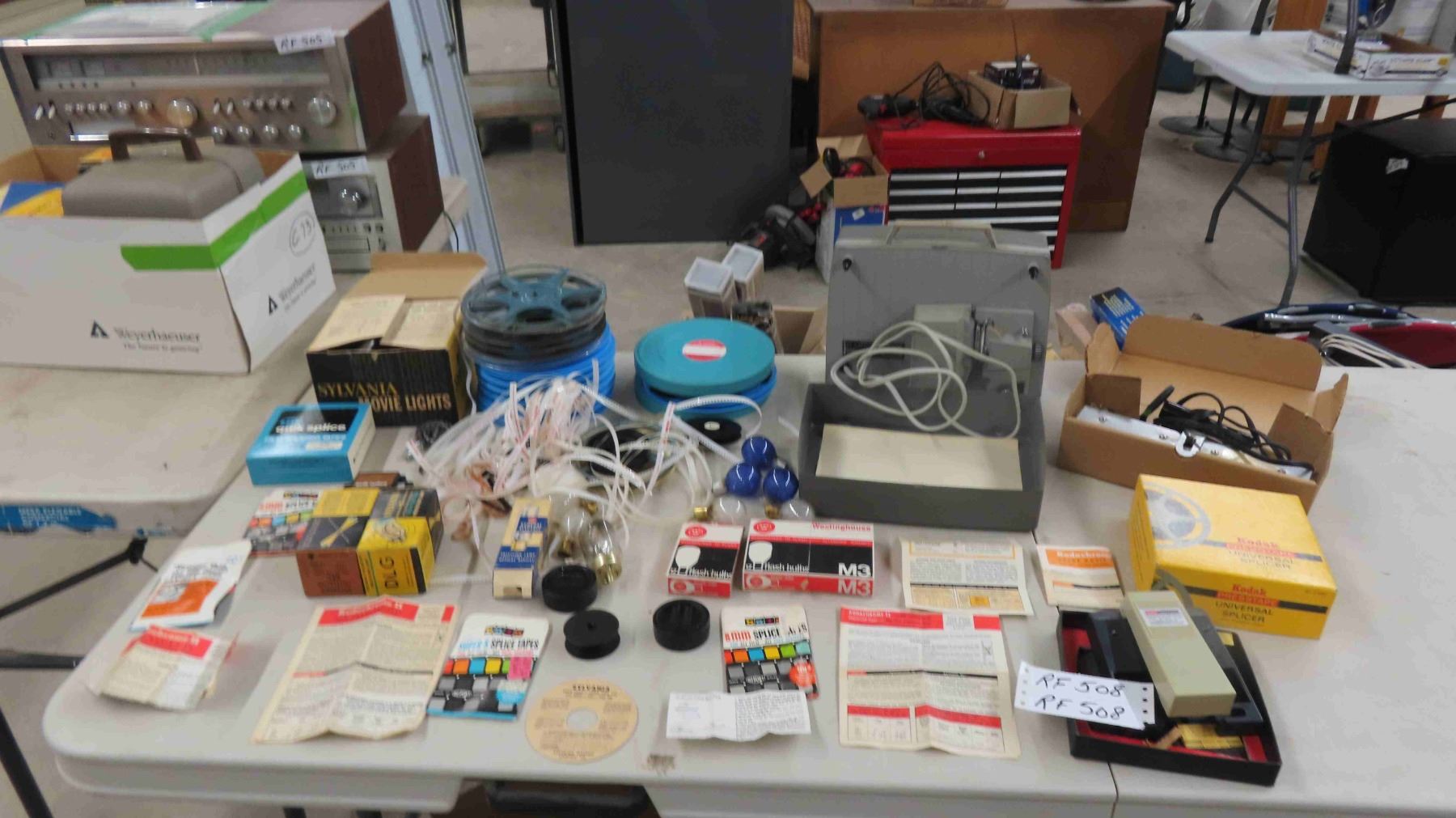 Box of 8mm Movie Projector Parts + Accessories, Splicer, Reels