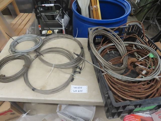 Box of Braided Steel Cable; (5) 5/16" with Hooks, 1/4" + 3/16" + 1/8" New Cable