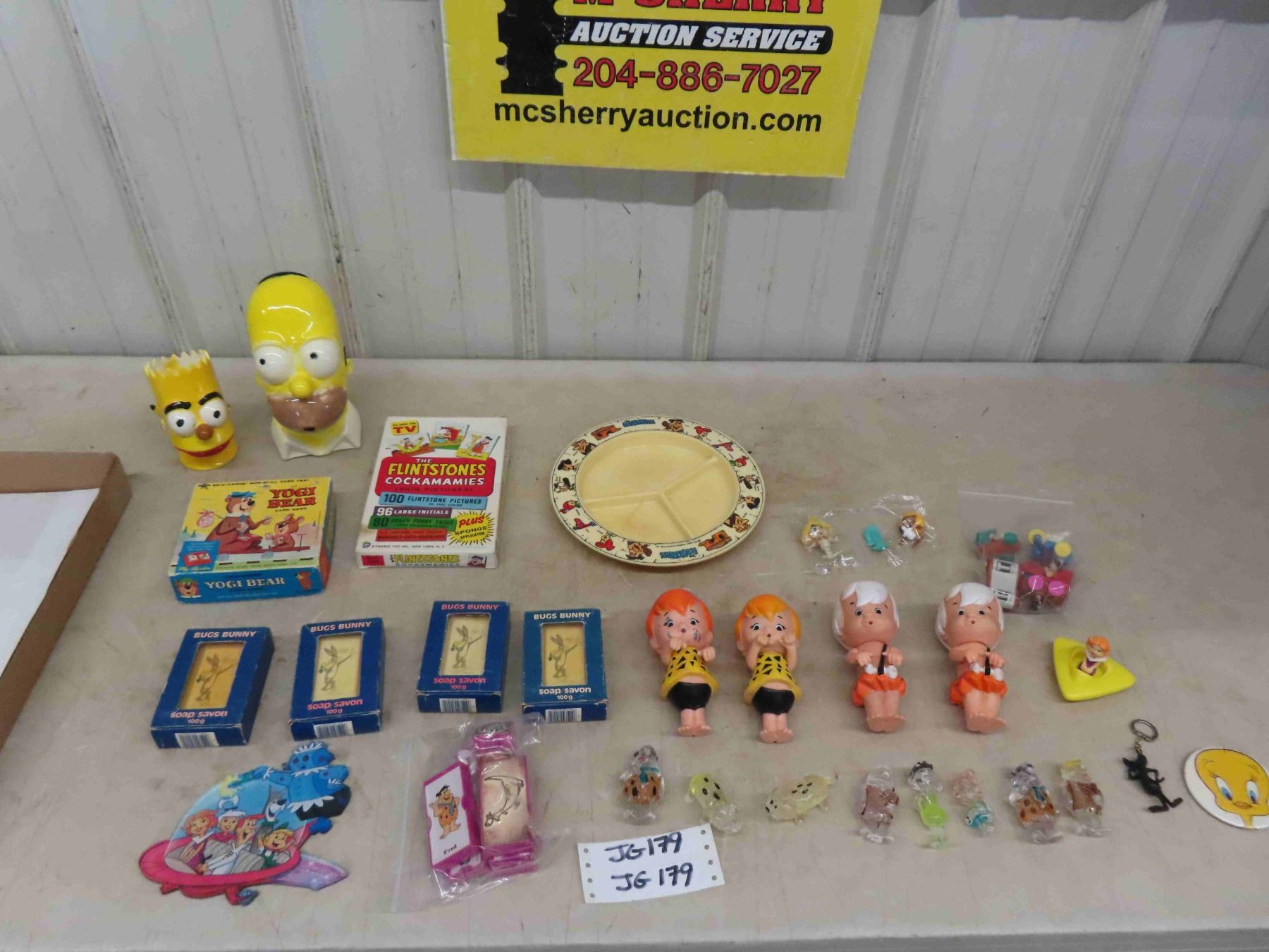 Box of Comic Character Items ; Flintstones, Yogi Bear Card Game, Jetsons, Bugs Bunny Soaps in Bos, Large Homer Simpson Bank, Bart Figure