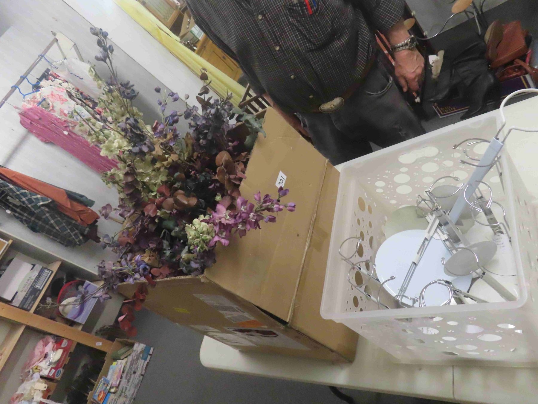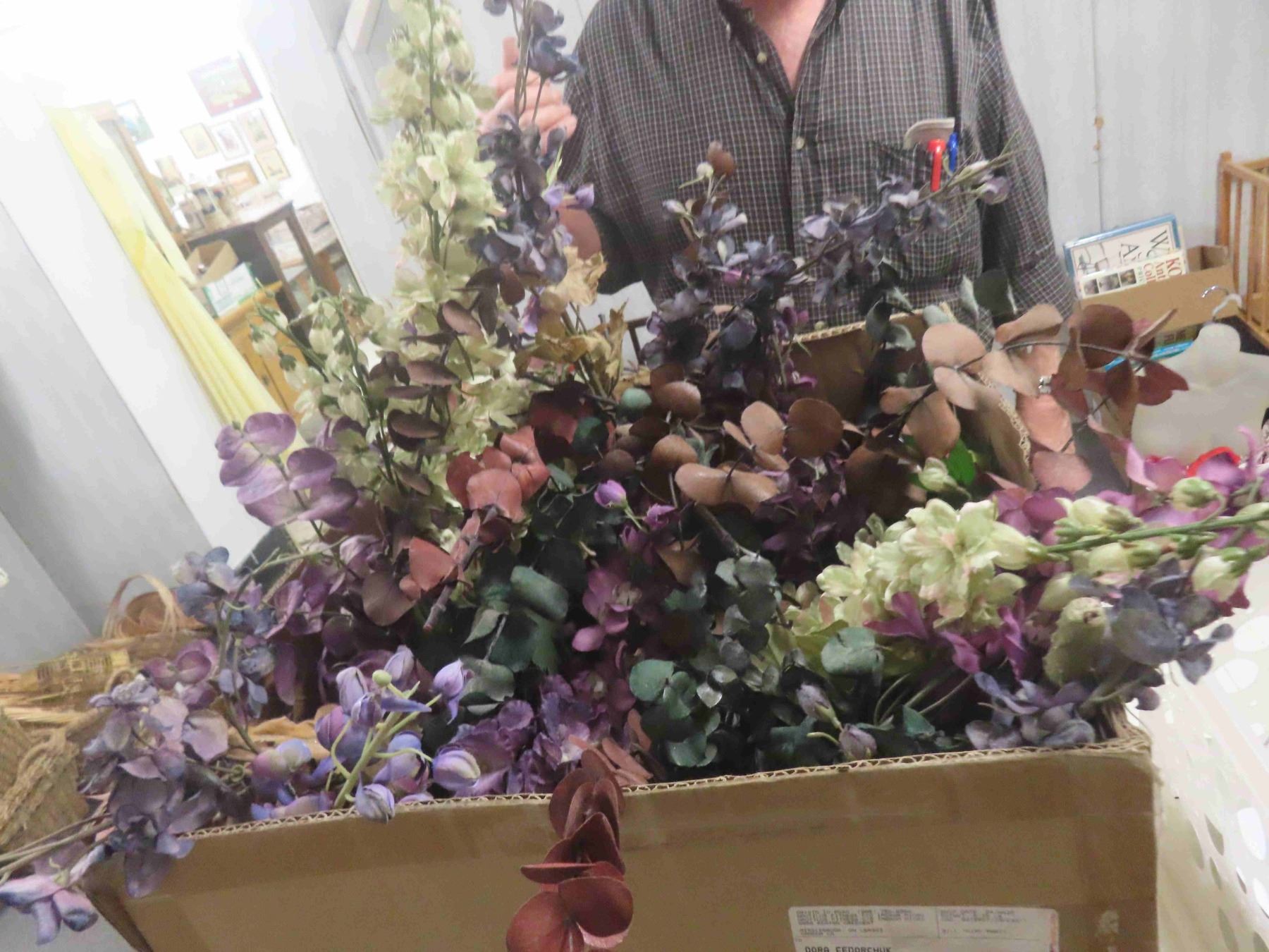 Box of Silk Flowers ; Eucalyptus & 9 Doll Holders