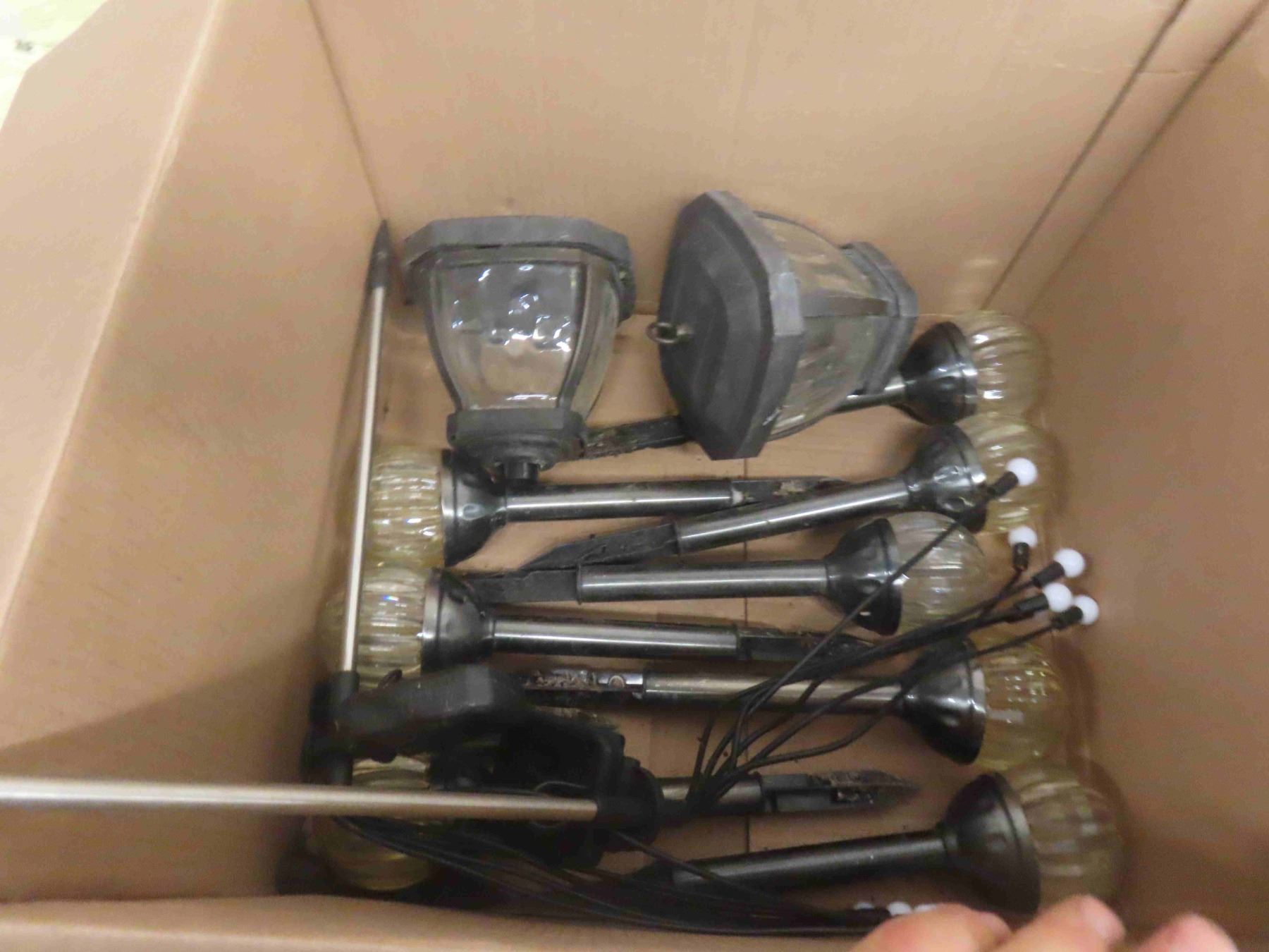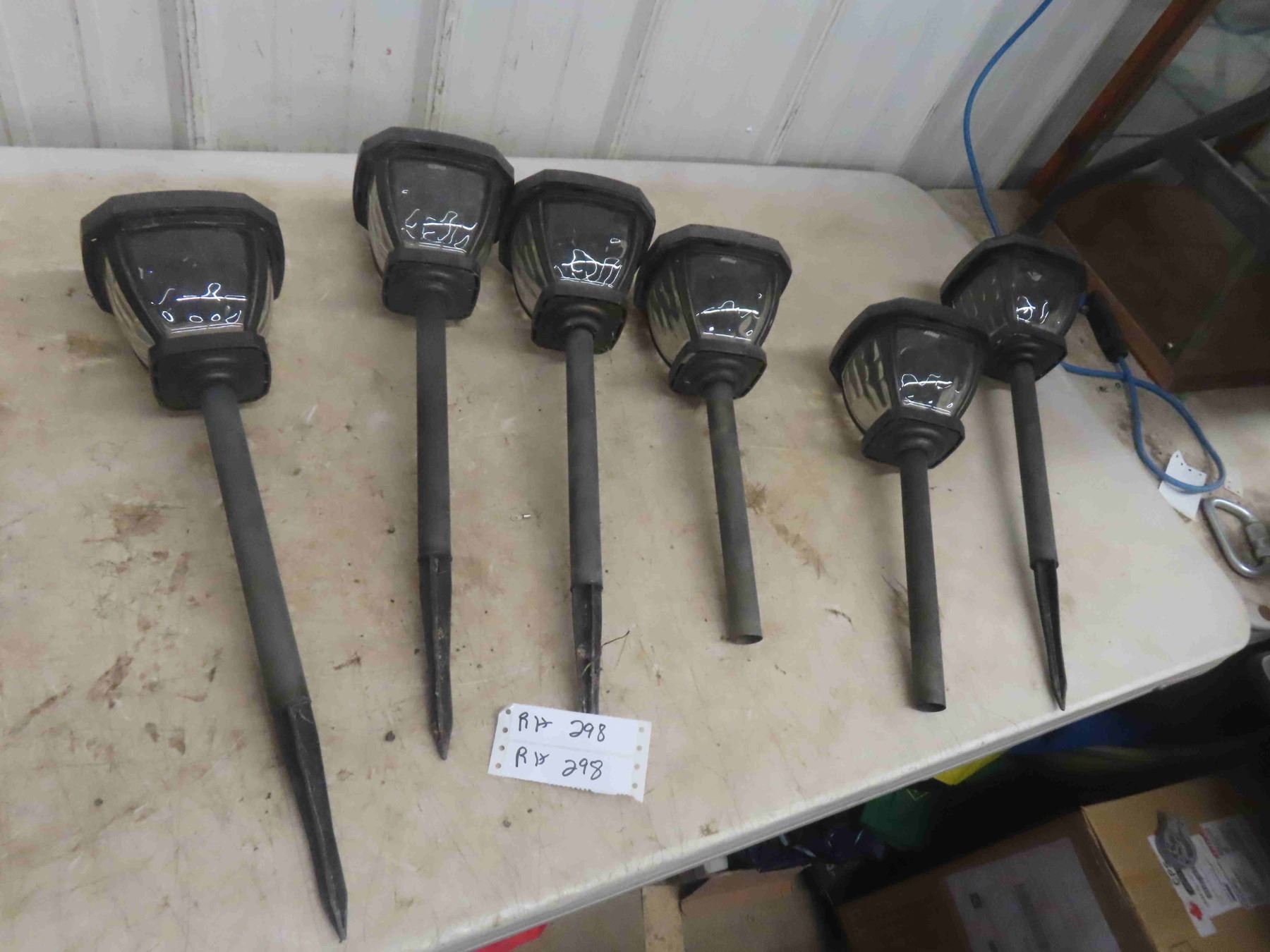 Box of Solar Lights (Approx.16) . 2 are Missing the Metal Base. Some Will Probably Need New Batteries. (Been In Storage)