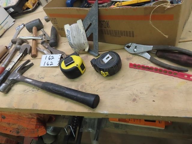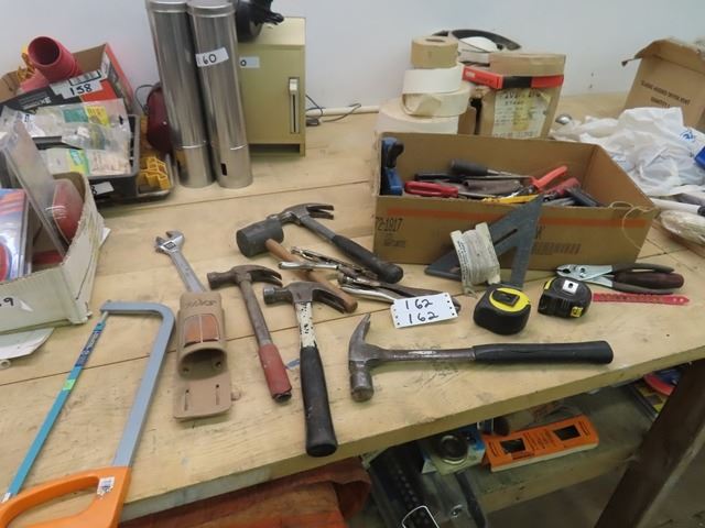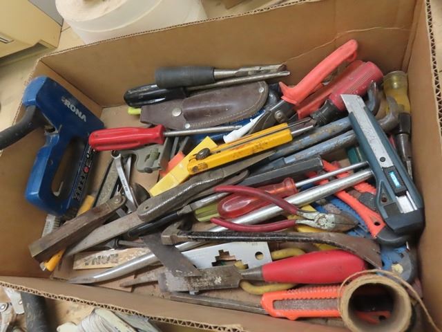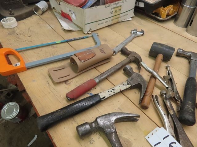 Box of Various Tools: Hack Saws, Hammers, Vice Grips, Crescent Wrenches, Tape Measures, Plus More