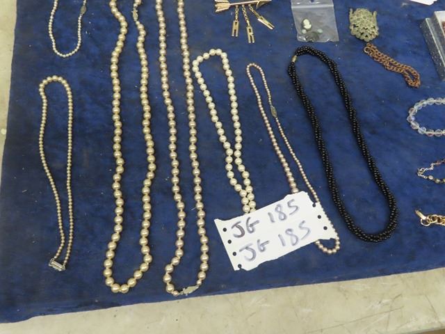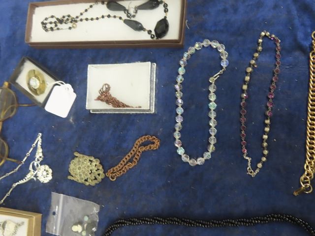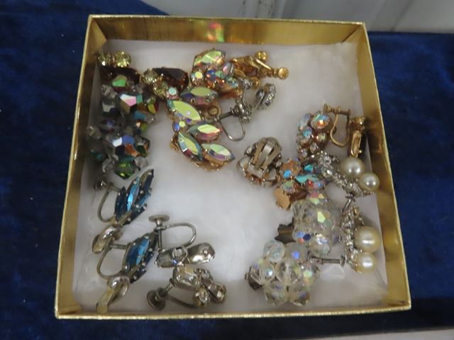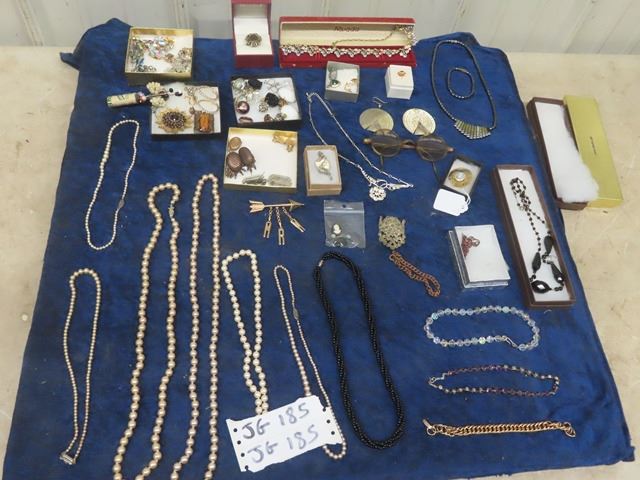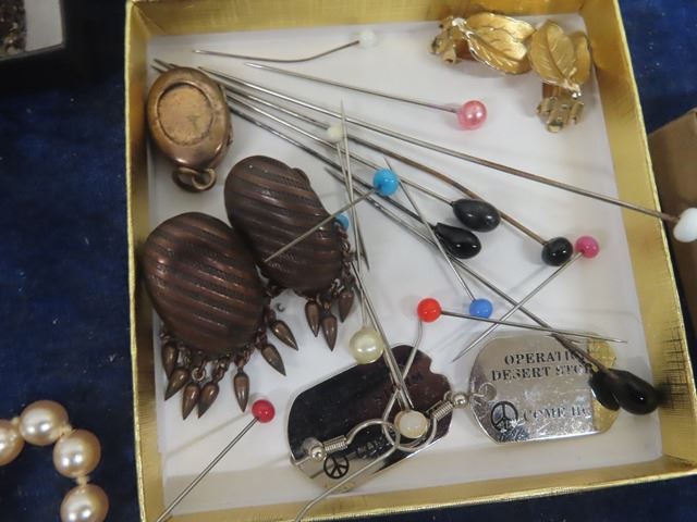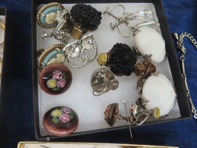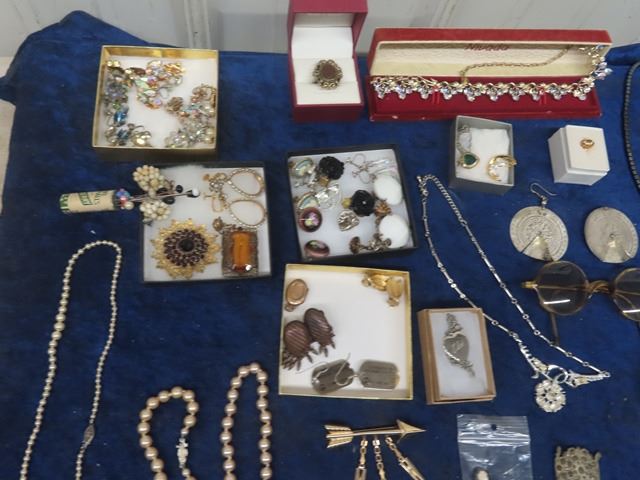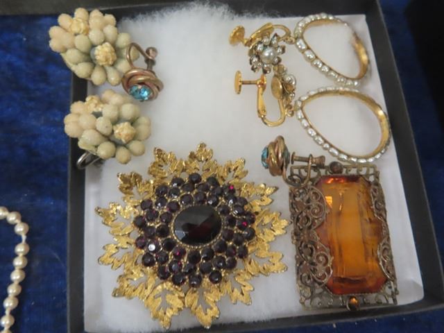 Box of Vintage Jewlery- Brooch by Marchell Boucher , Cora + Crystal, Cameo Ring, Earrings, Black Glass Necklace, Pearl Necklace plus more