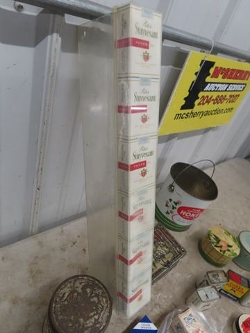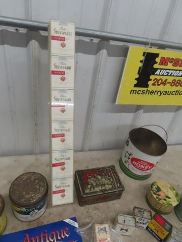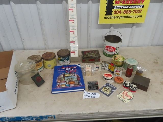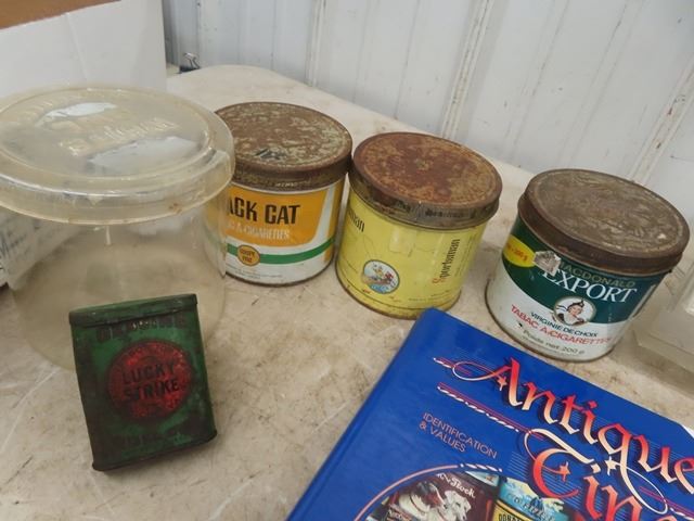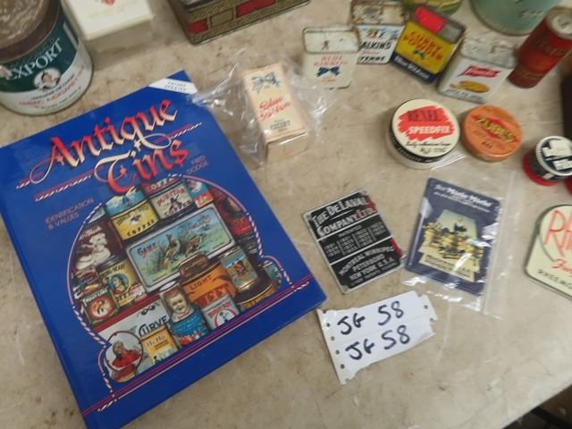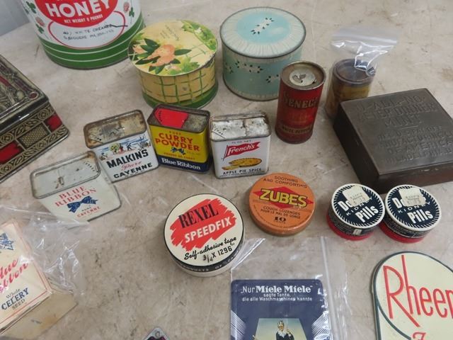 Box of Vintage Tins including 1920's Genuine Lucky Strike Roll Cut Tobacco Tin & 1936 DeLaval Plaque & other antique tins