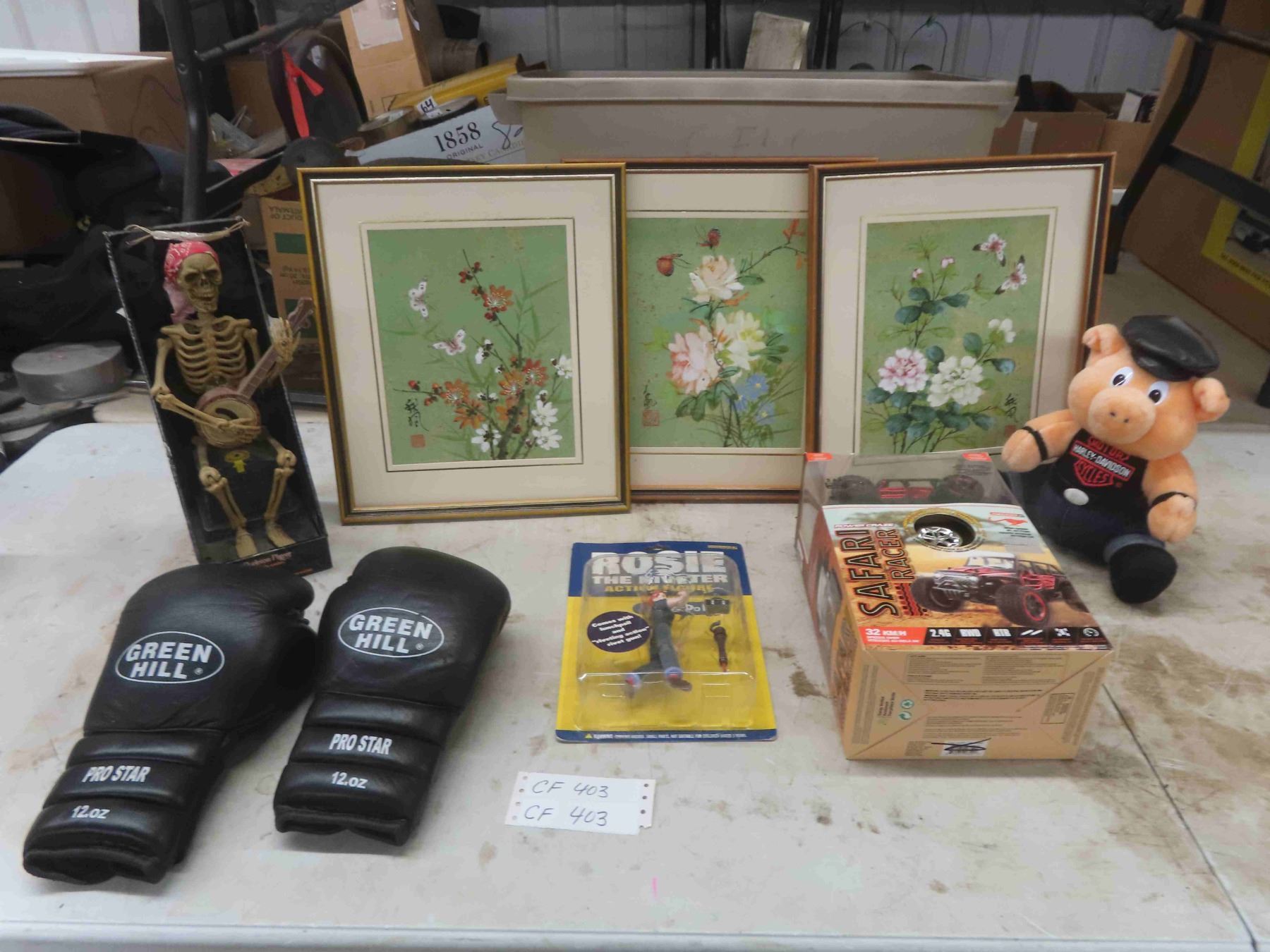 Boxing Gloves, New Skeleton Playing Banjo + Safari Racer, Rosie the Rivoter, 3 Pictures 13" x 15"