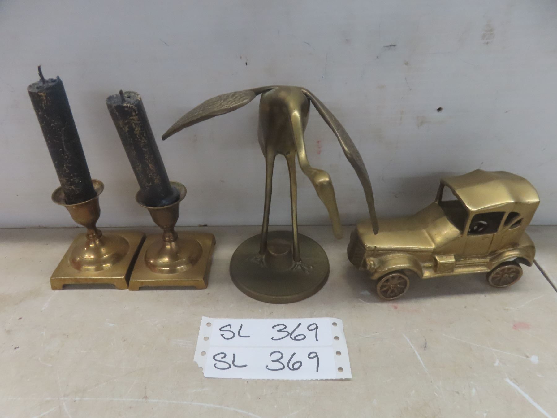 Brass Bird Crane, Model T Auto & 2 Candle Stick Holders