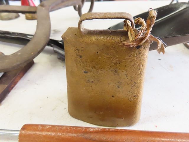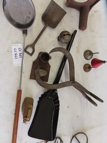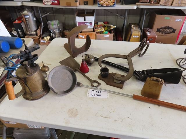 Brass Blow Torch, Oilers, Cobblers Cast Iron Mandrel, Ice Tongs, Shovels, Bells