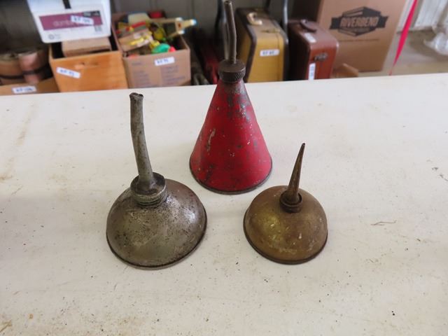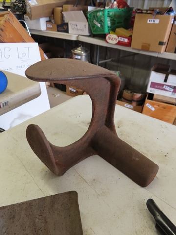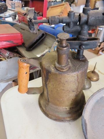 Brass Blow Torch, Oilers, Cobblers Cast Iron Mandrel, Ice Tongs, Shovels