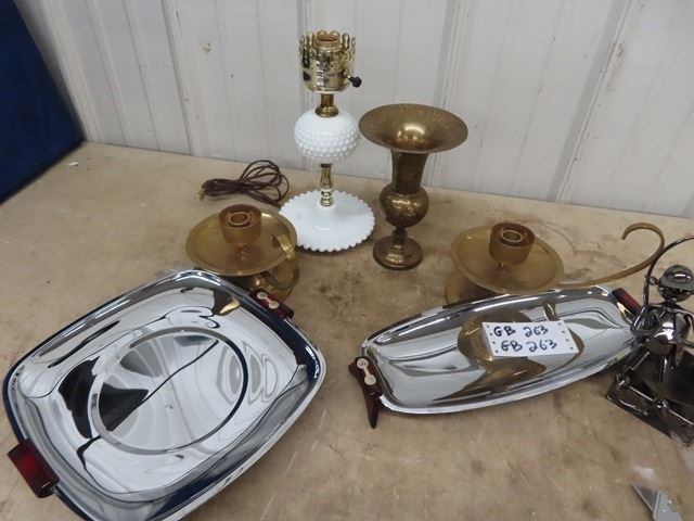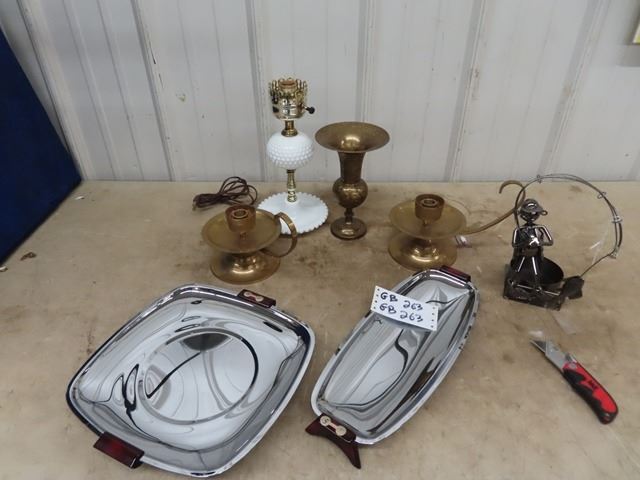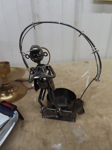 Brass Candle Holders & Vase, Serving Tray, Fisherman Ornaments & Lamp
