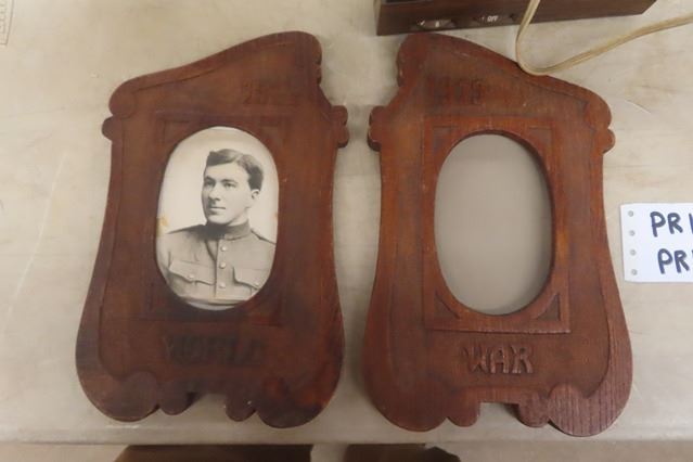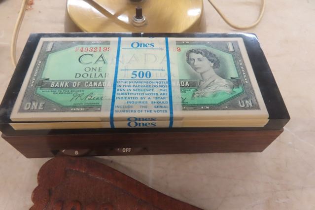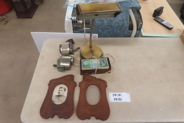 Brass Desk Lamp, Pencil Sharpeners, Cool $1 Bill Radio, WW1 Picture Frames