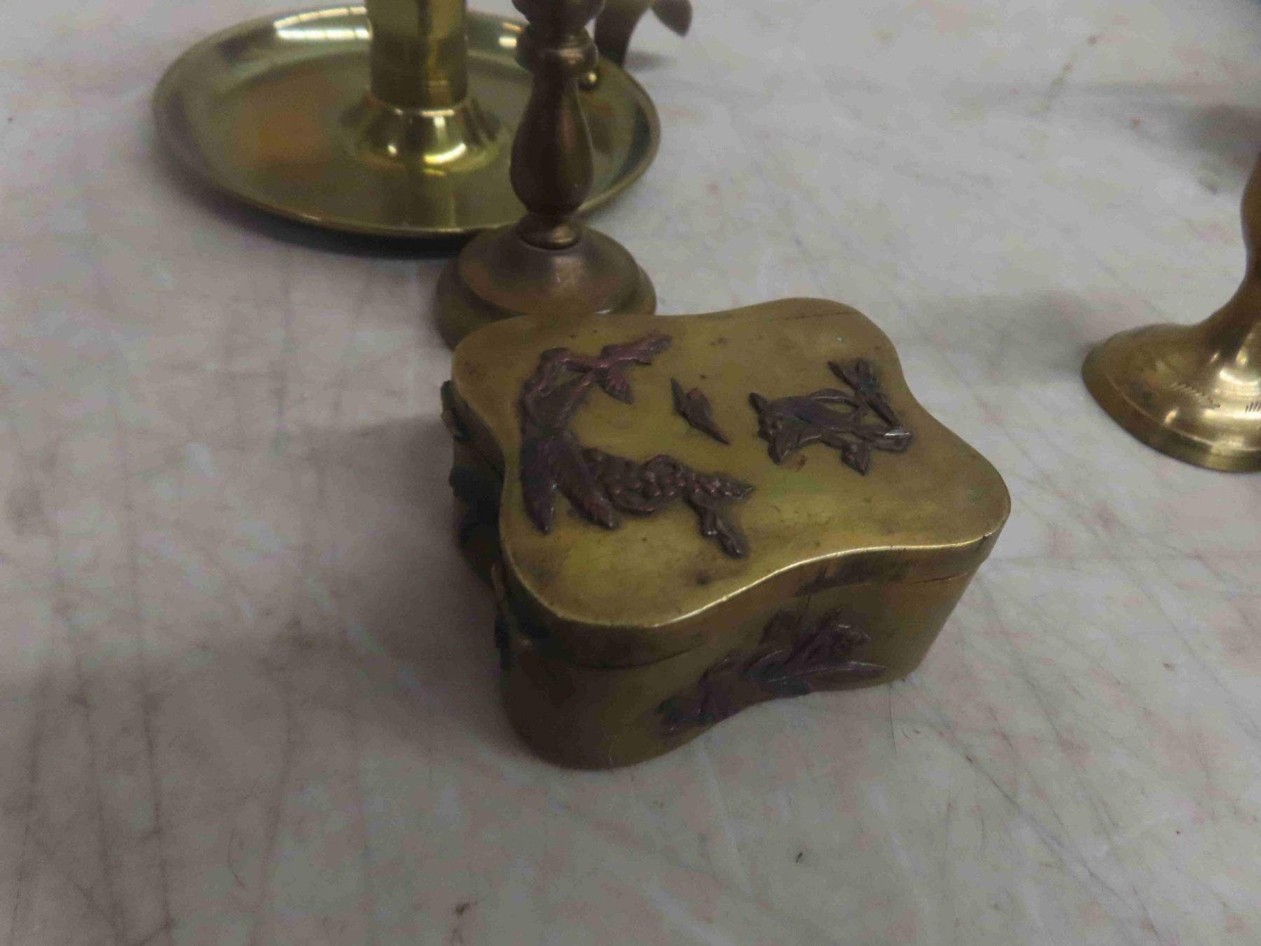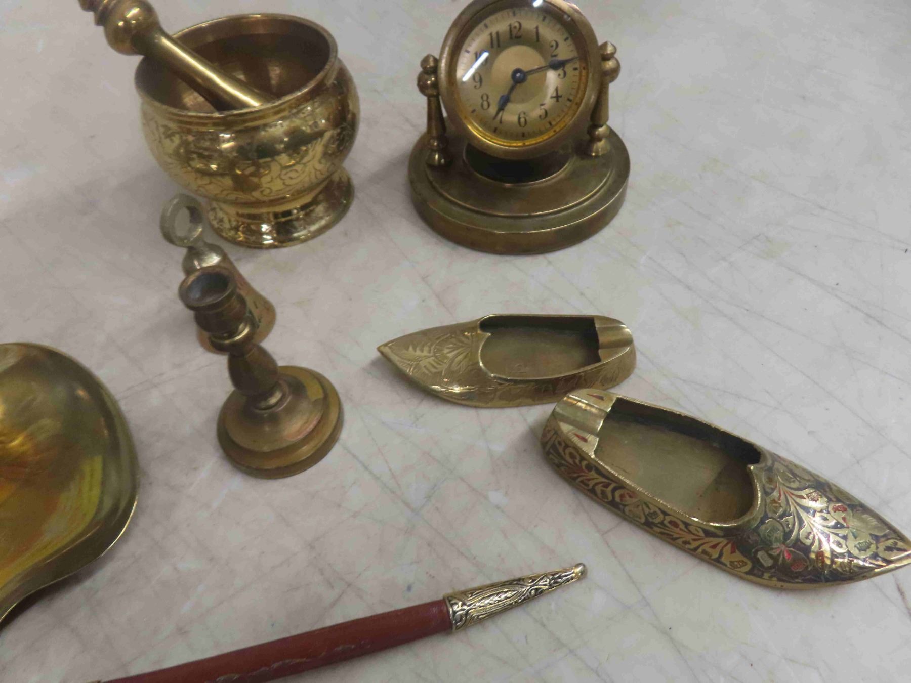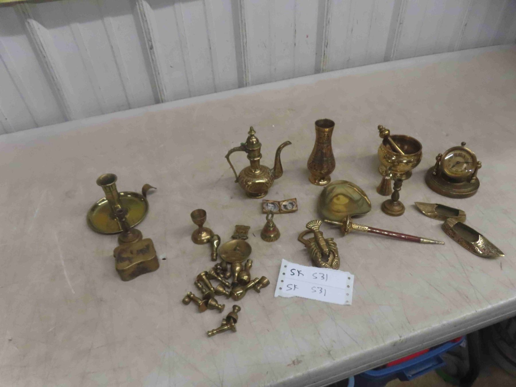 Brass Items: Clock, Mini Ornaments, Candliers, Trinklet Box, Letter