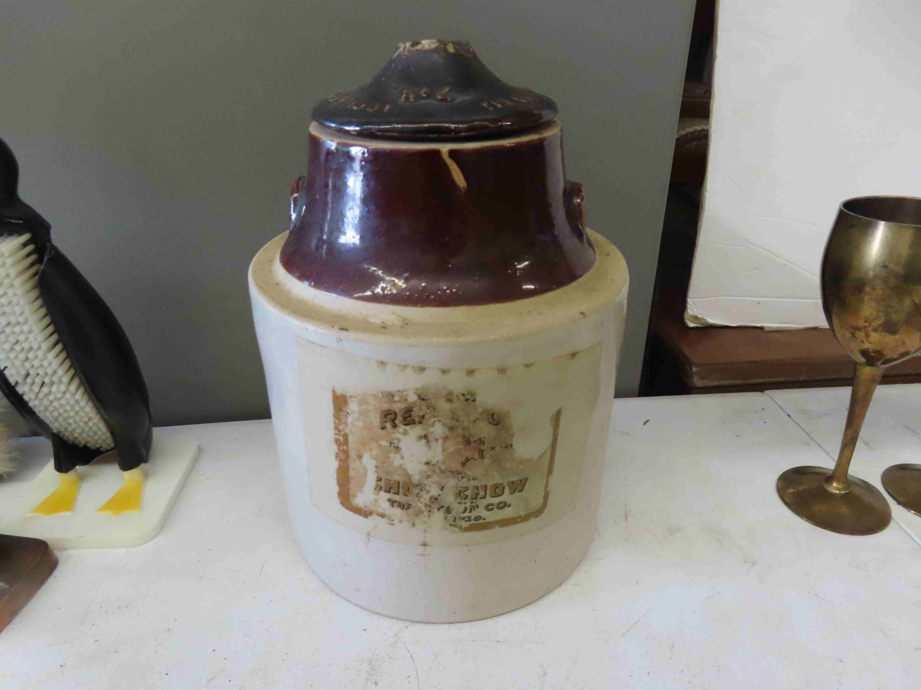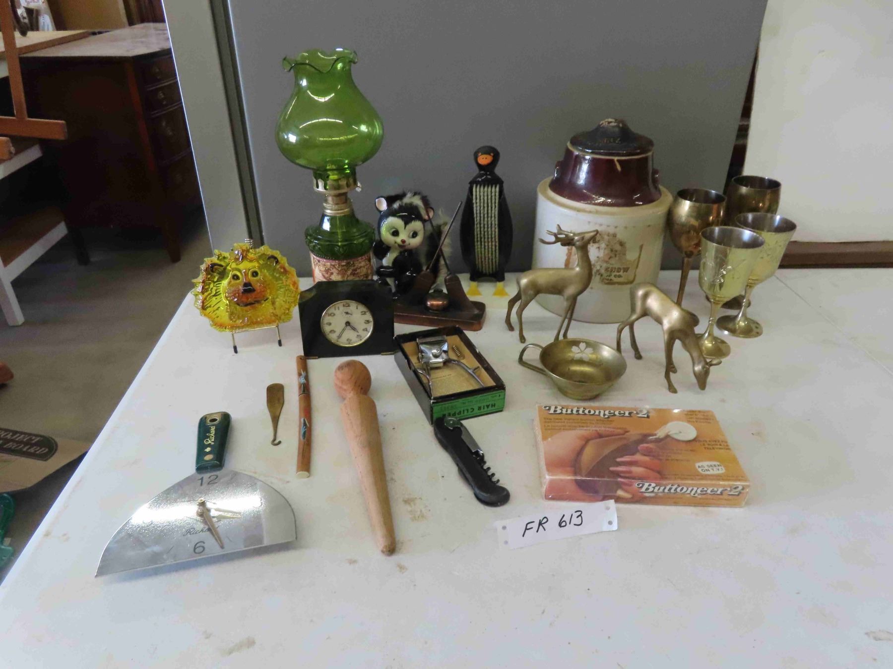 Brass Pieces, Clocks, Crock, Oil Lantern & More
