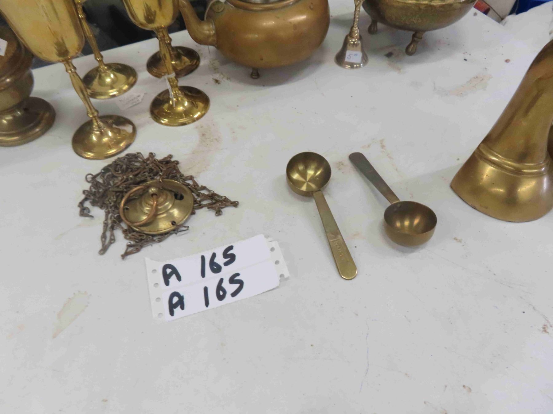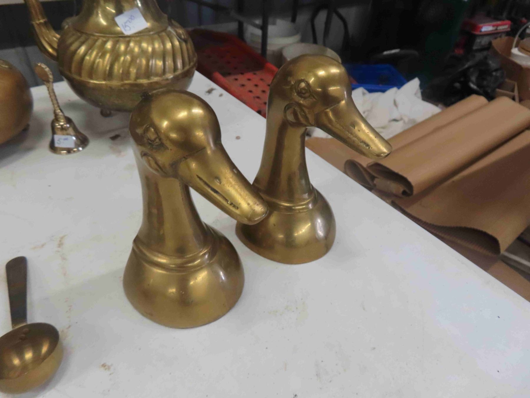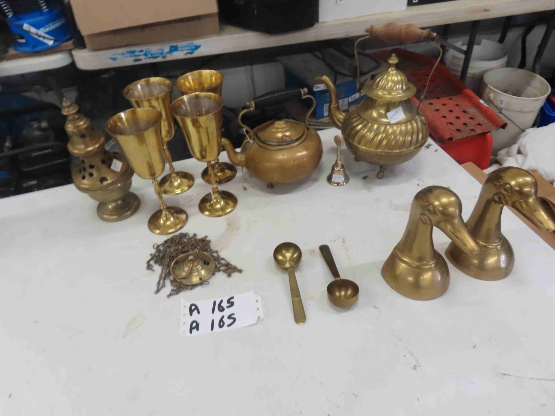 Brass Tea Pot, Goblets, Duck Book Ends, Nabob Spoons