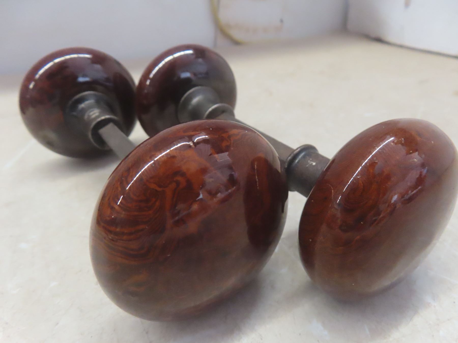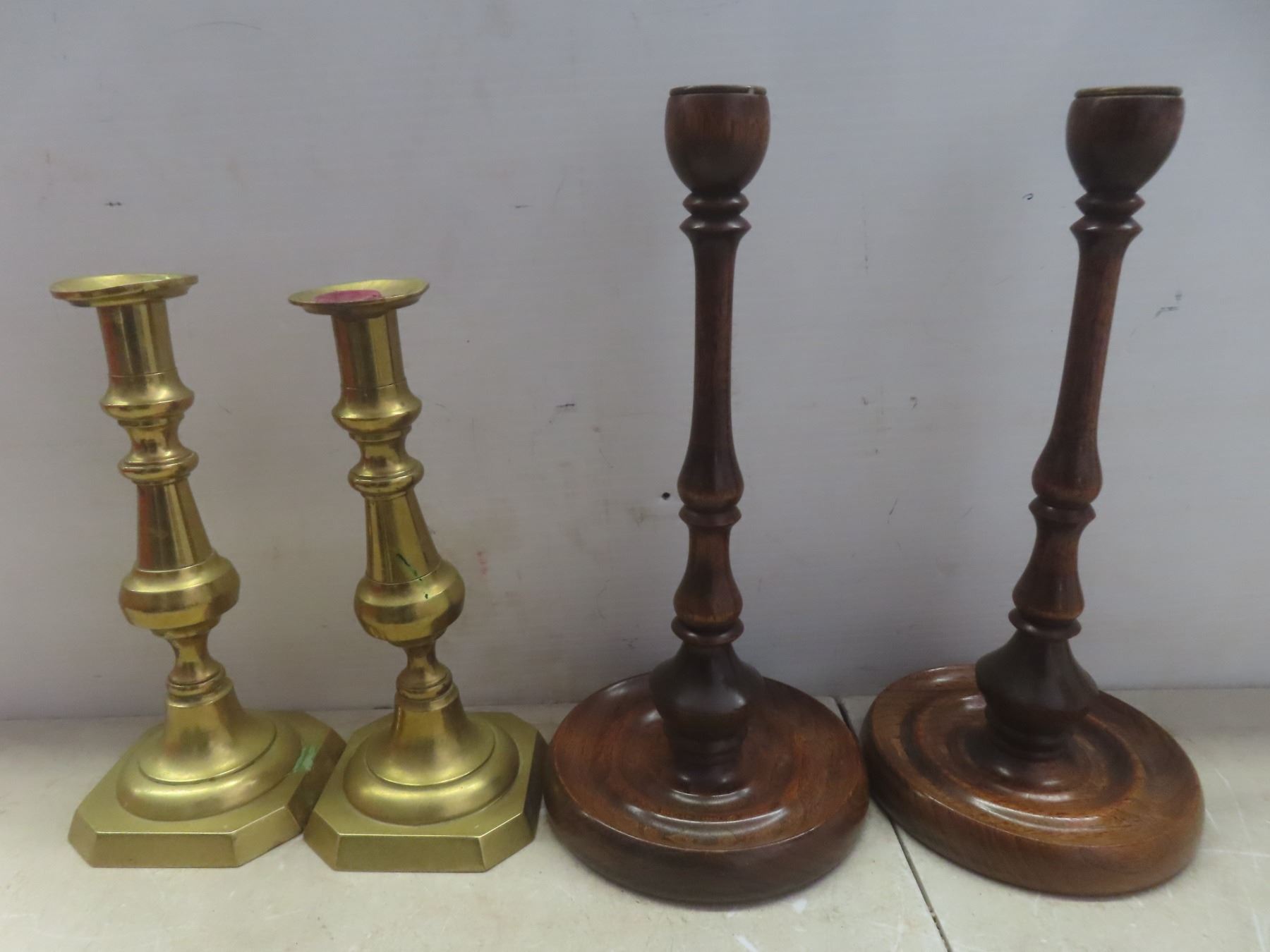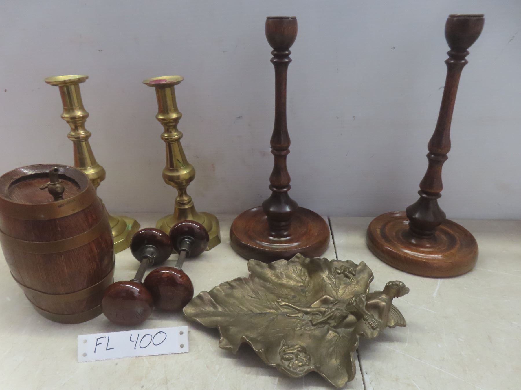 Brass and Wood Candle Sticks, Small Cask, Vint Wood Door Knobs and Brass Dish
