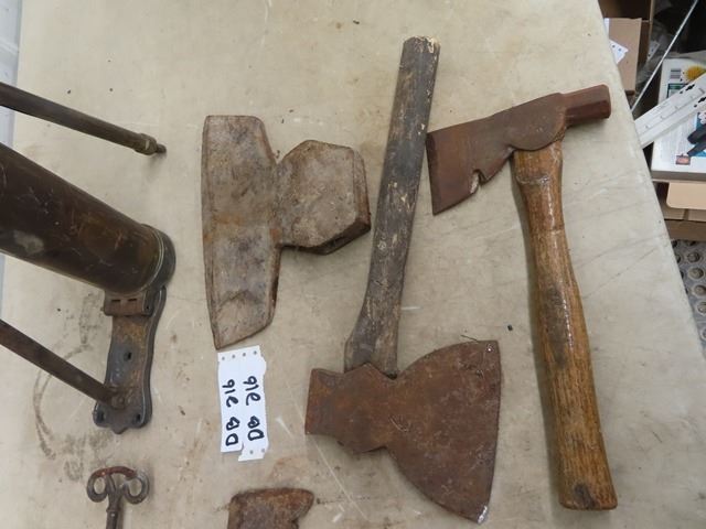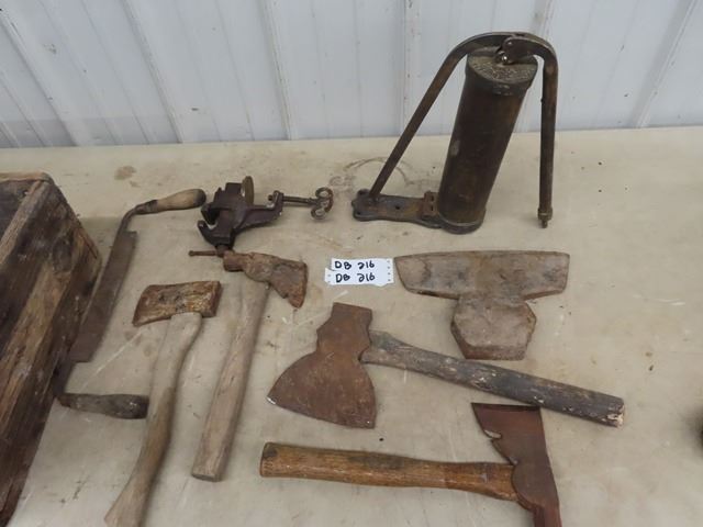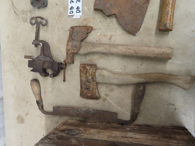 Broad Axe, Hatchet, Small Vise, Pump?, & Draw Knife