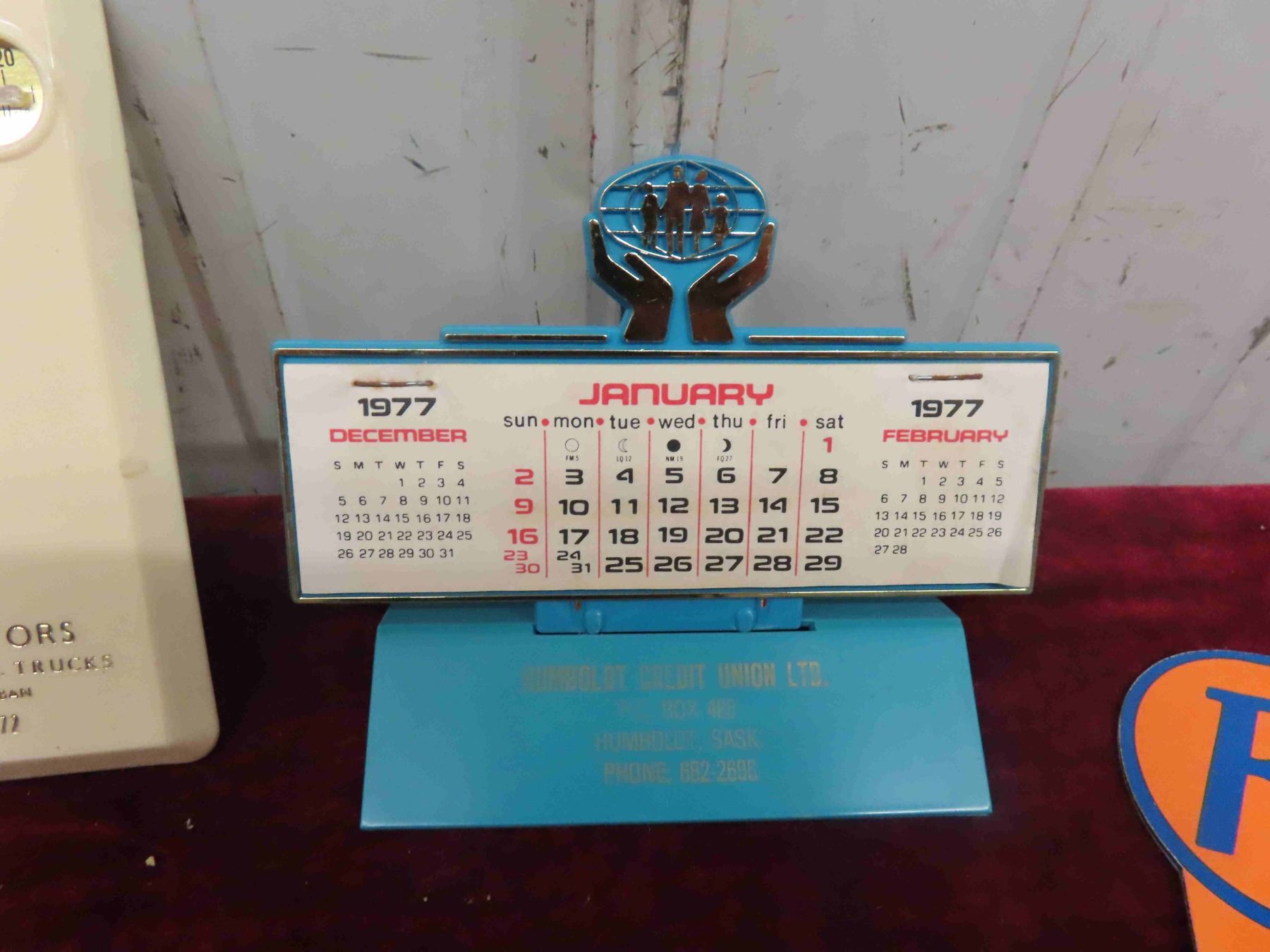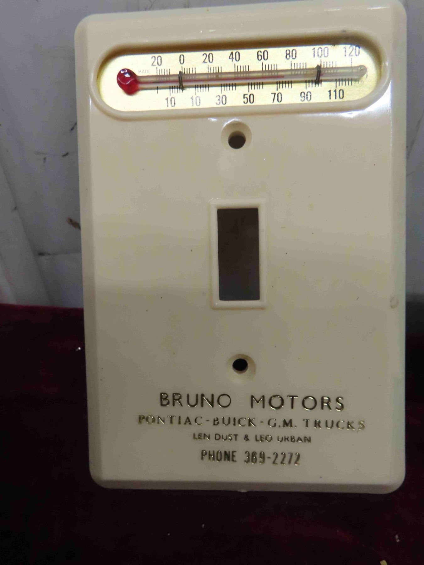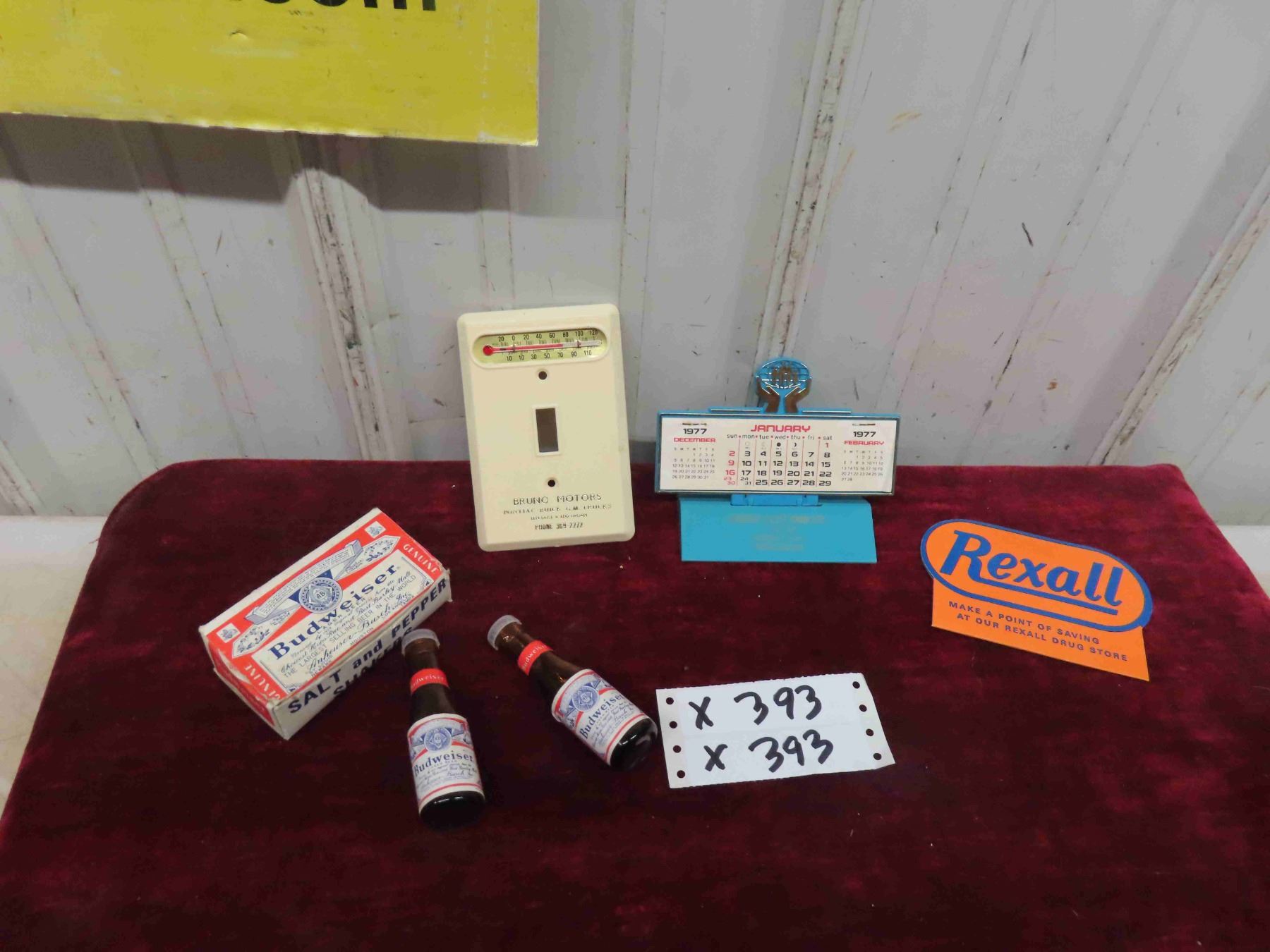 Budweiser Salt and Pepper with Box , Light Switch Cover 'Bruno Motors' with Thermostat , 1977 Desk Calender Credit Union, Rexall Sewing Kit