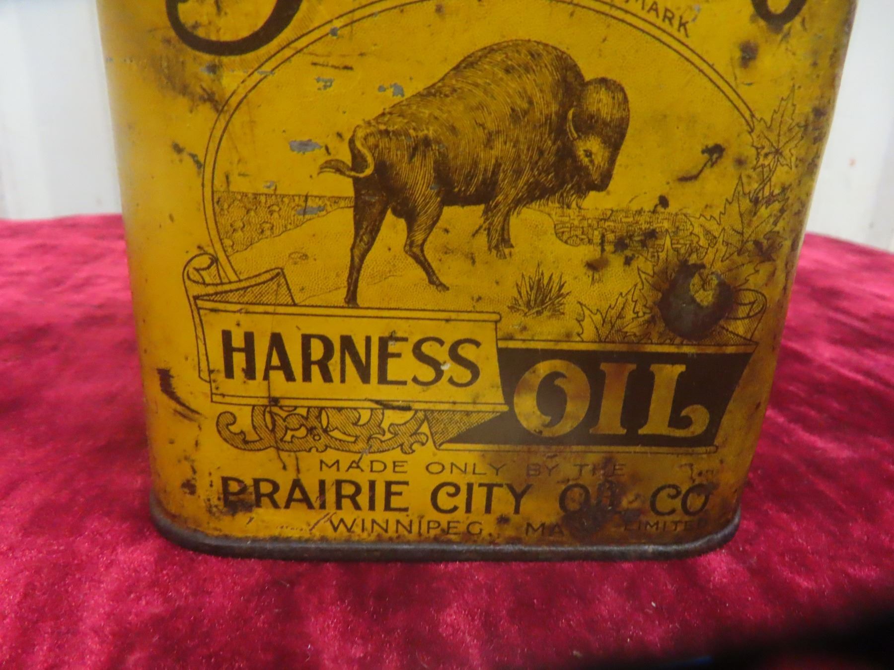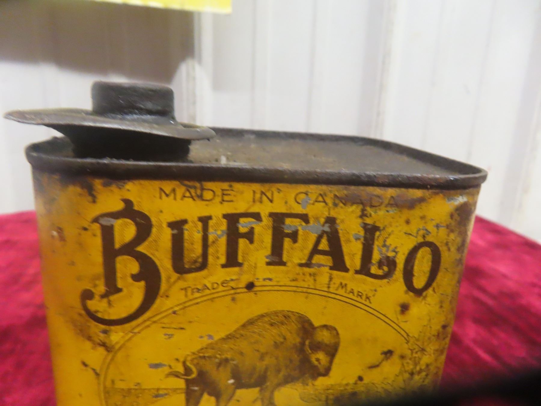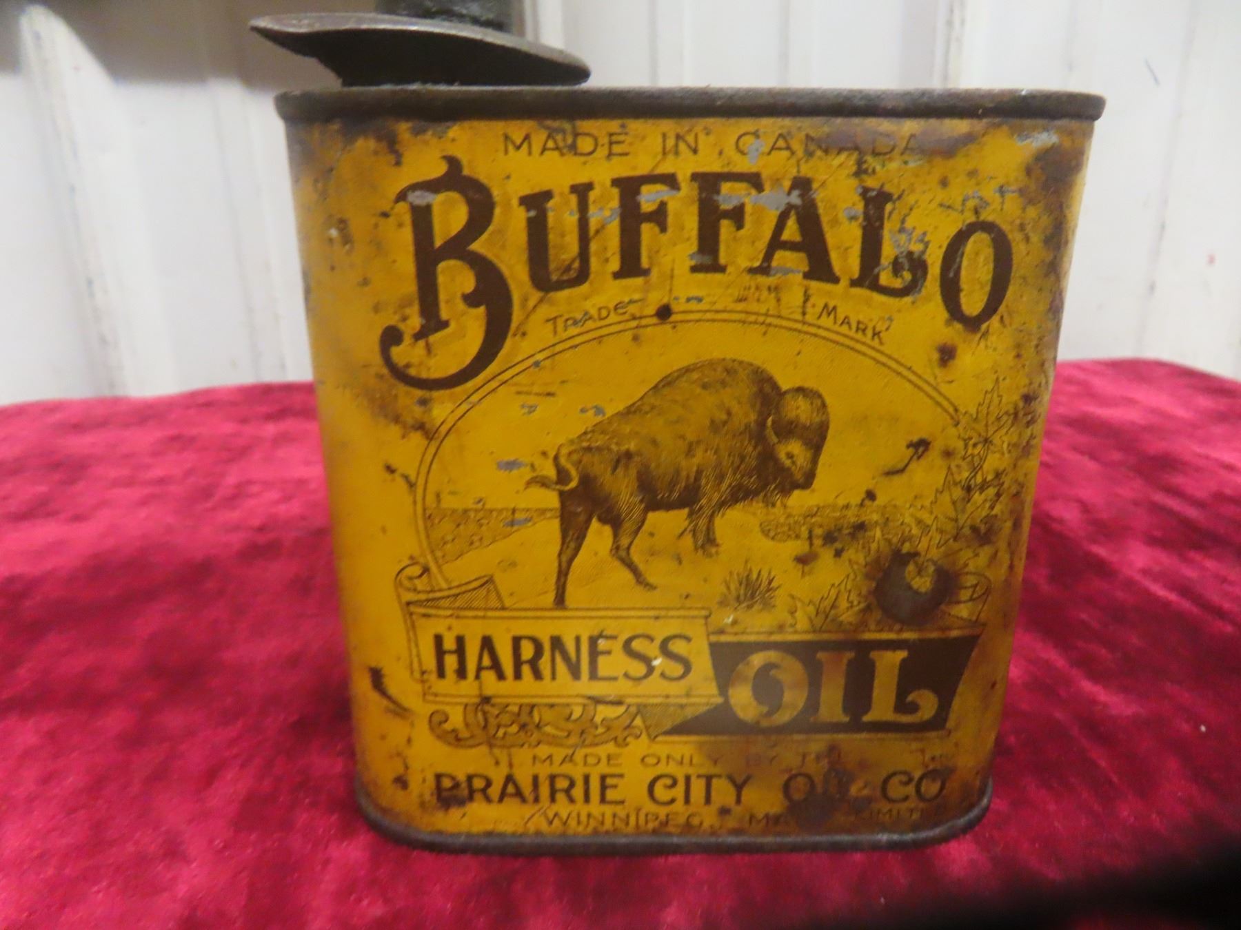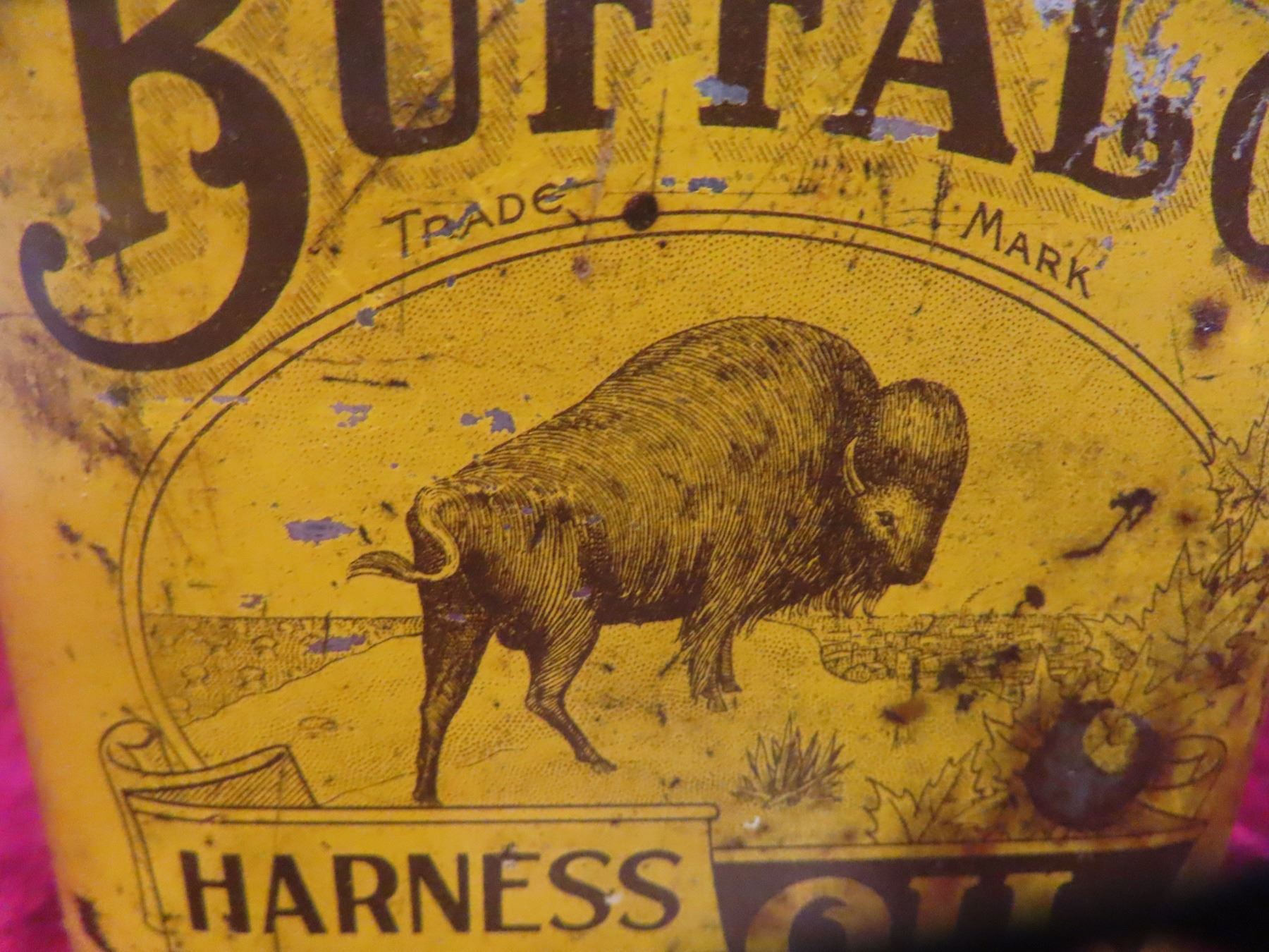 Buffalo Harness Oil Can, Prairie City Oil Co. 4 3/4"x4 3/4"x3 3/4"