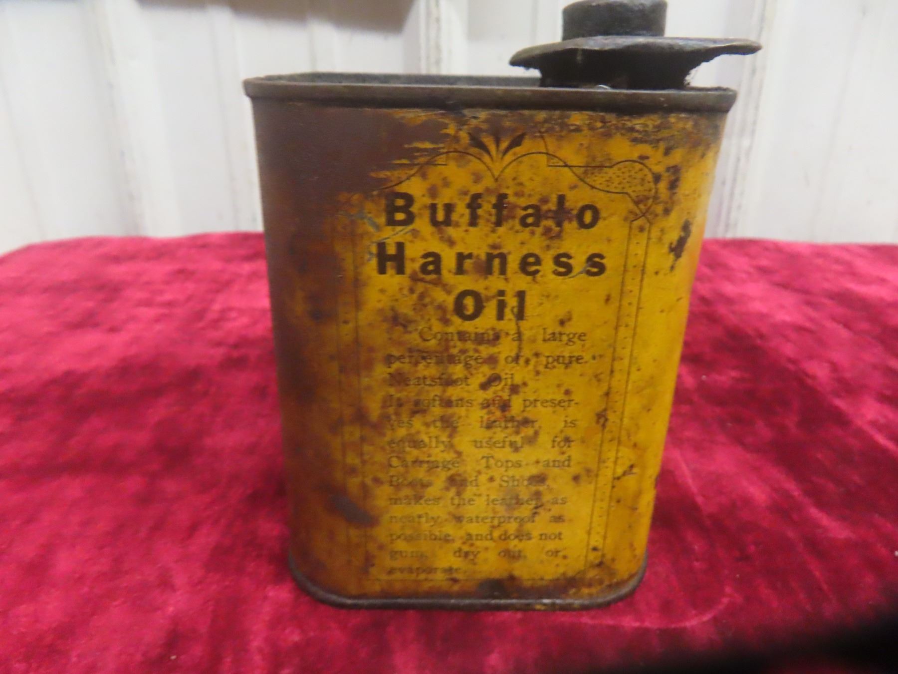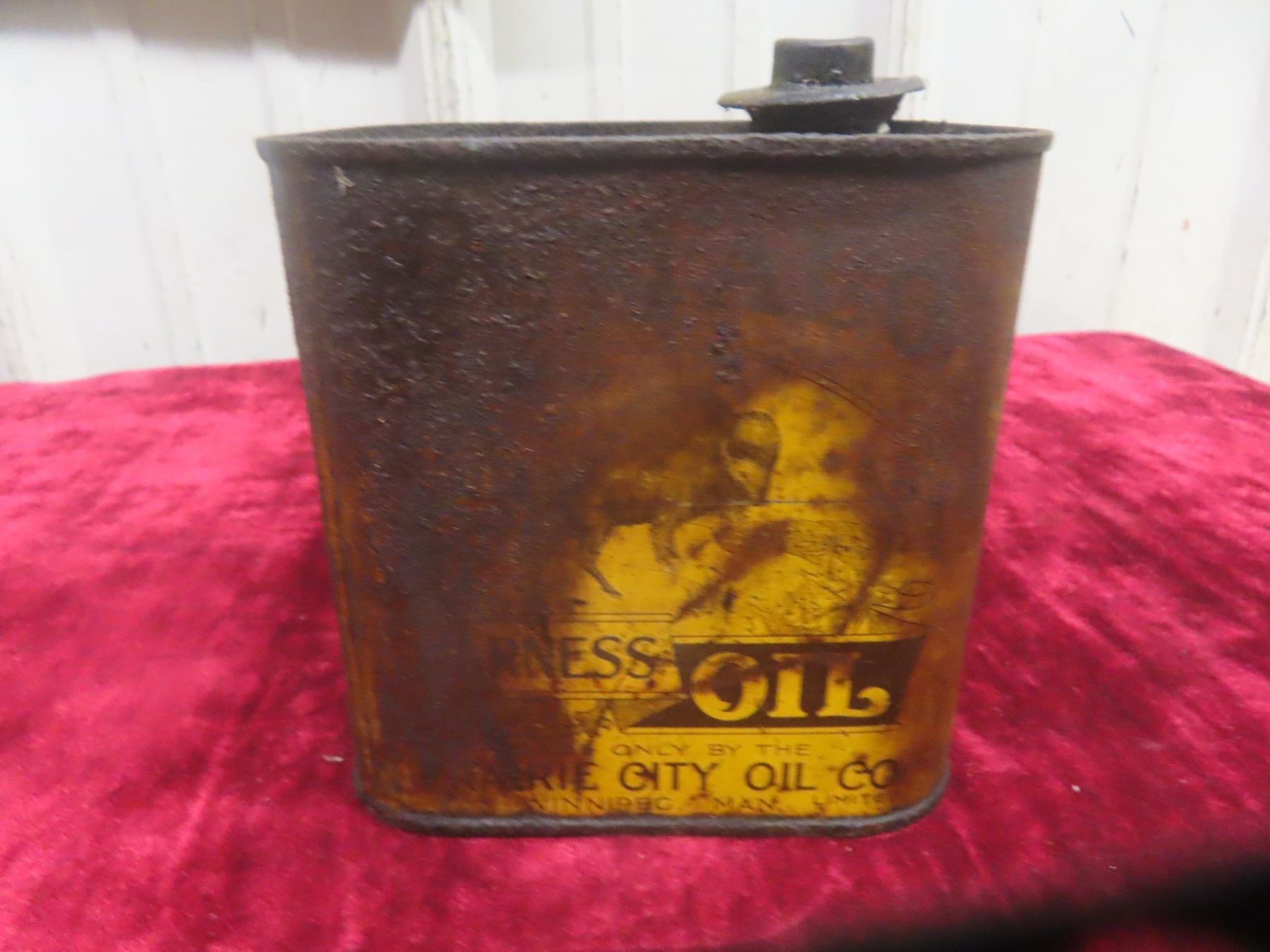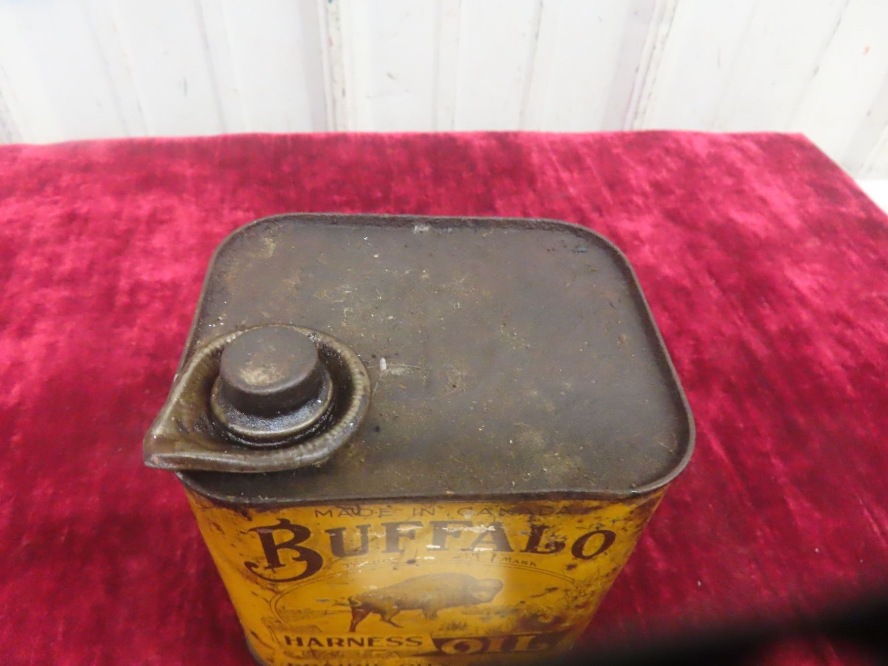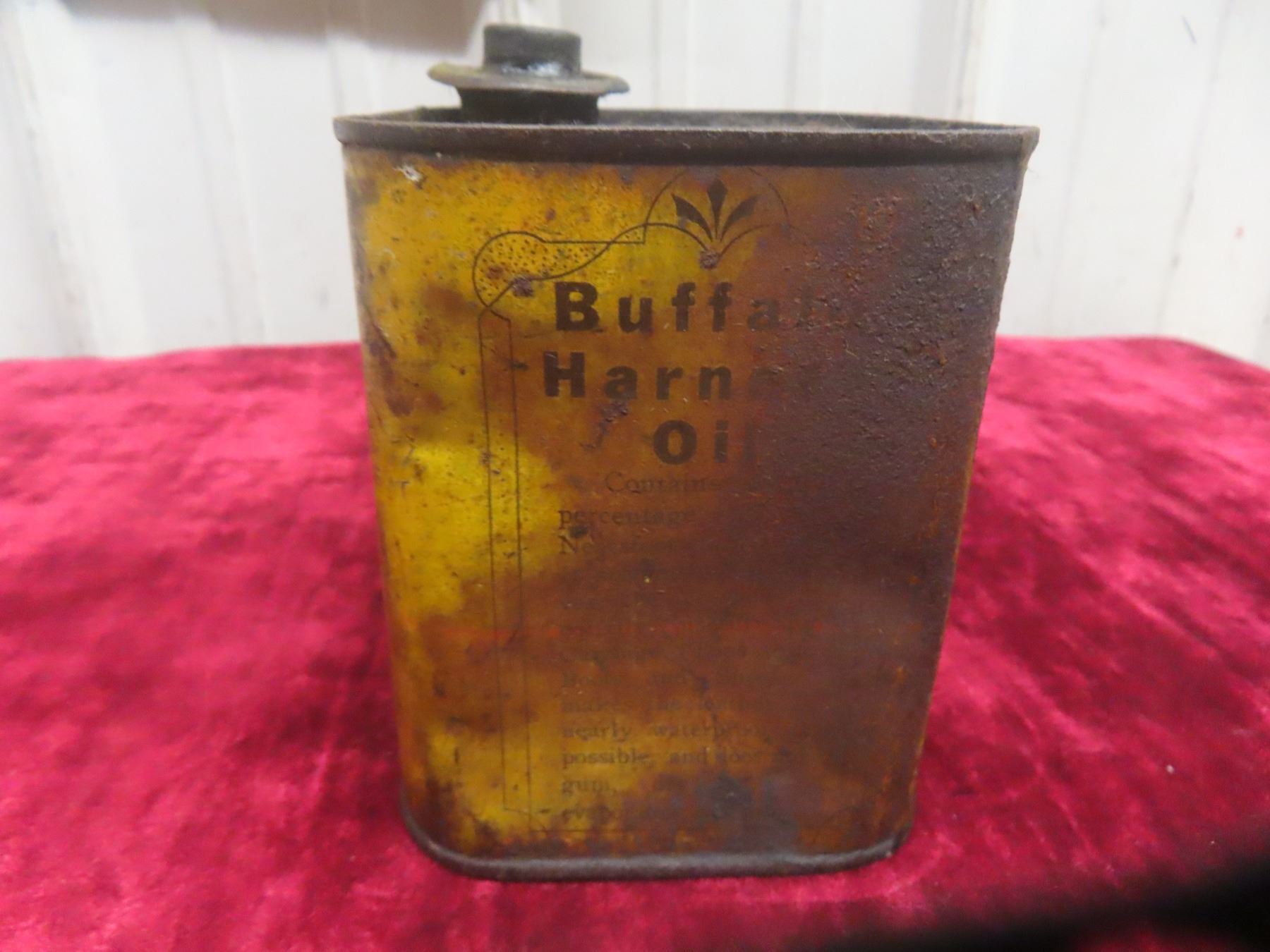 Buffalo Harness Oil Can, Prairie City Oil Co. 4 3/4"x4 3/4"x3 3/4"