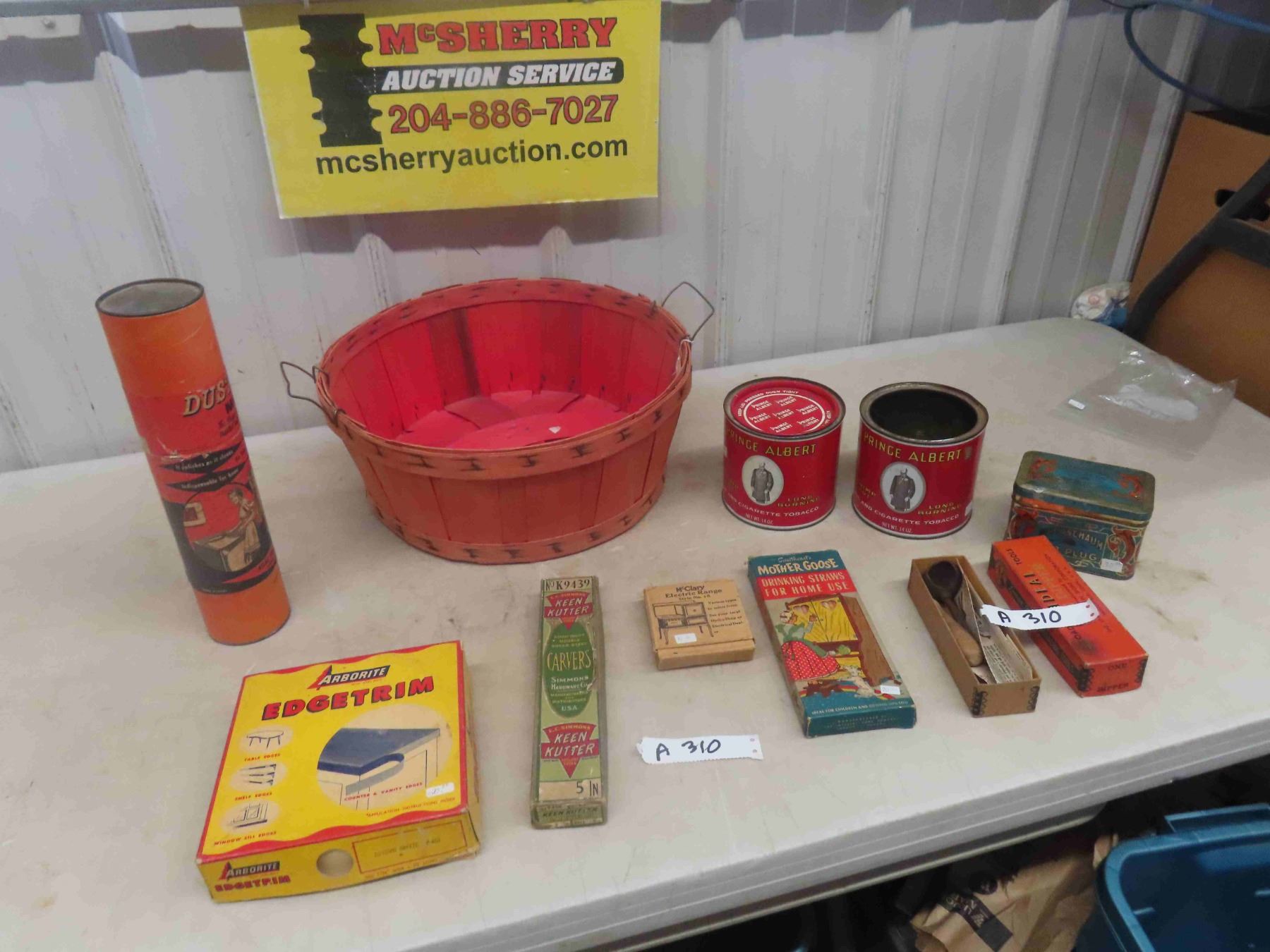 Bushell Basket, Prince Albert Tin, Meerschaum Tobacco Tin, Lead Dipper, Mother Goose Straws, plus more