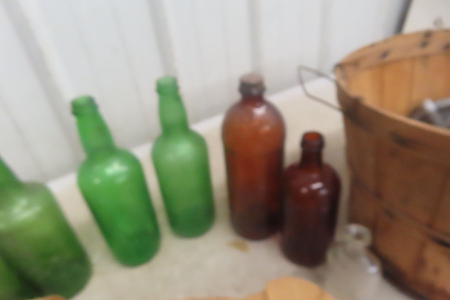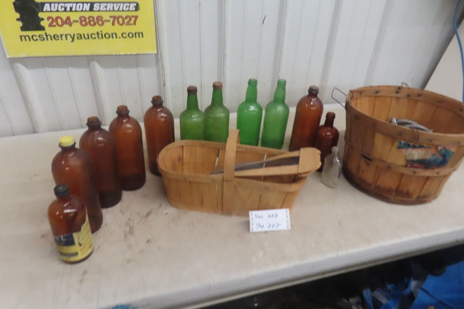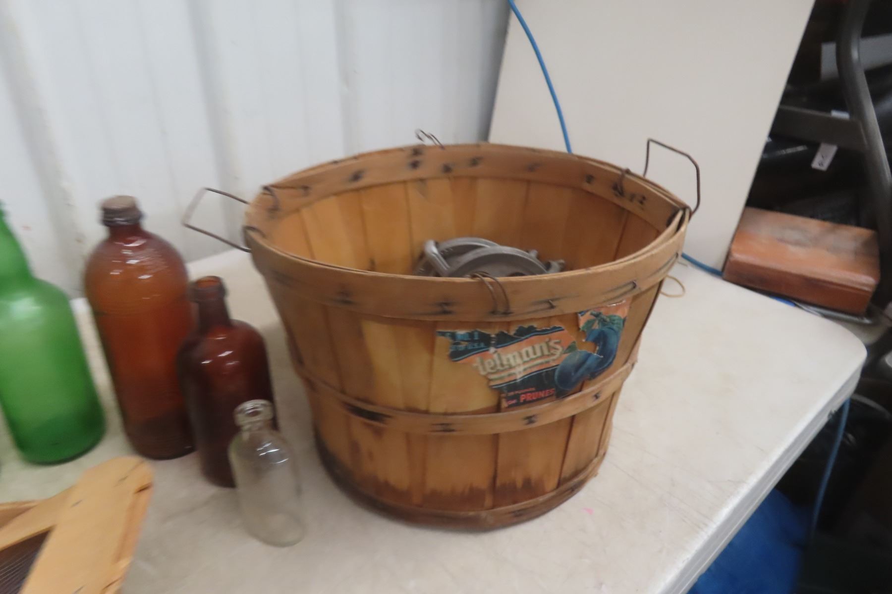 Bushell Baskets/Various Older Bottles/Clothes Line Pulley