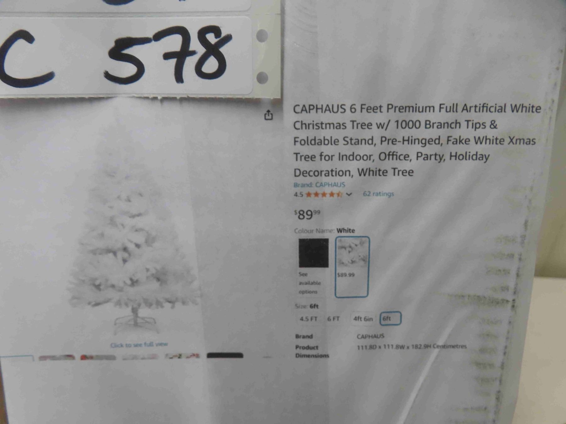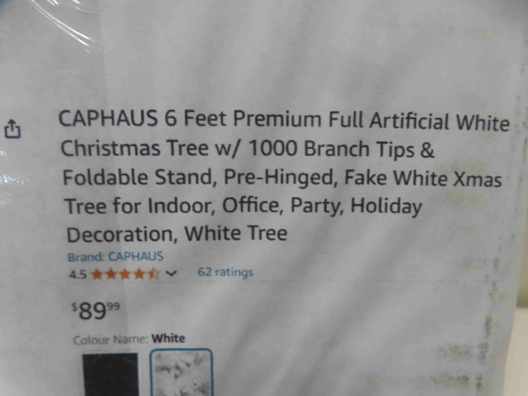 CAPHAUS 6 Feet Premium Full Artificial White Christmas Tree w/ 1000 Branch Tips & Foldable Stand, Pre-Hinged, Fake White Xmas Tree for Indoor, Office, Party, Holiday Decoration, White Tree - New or Store Return