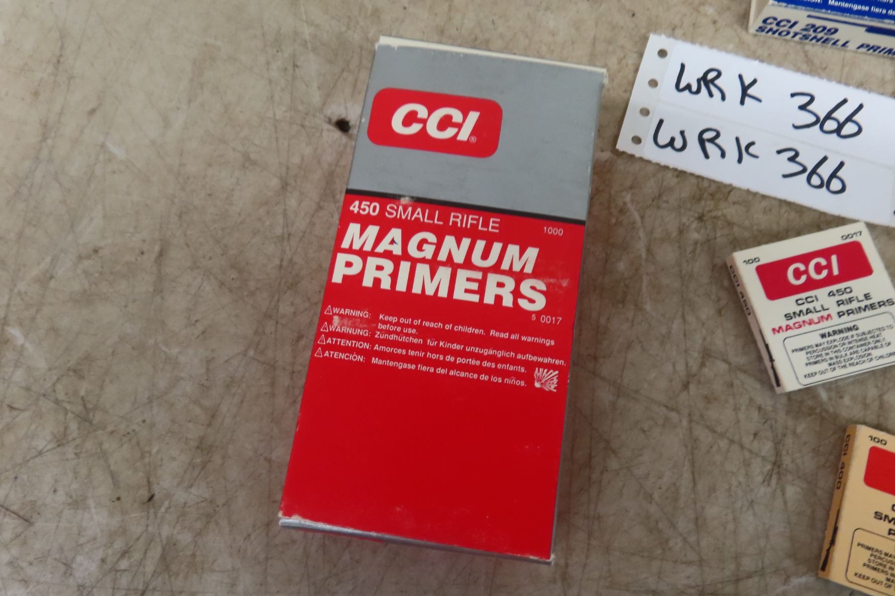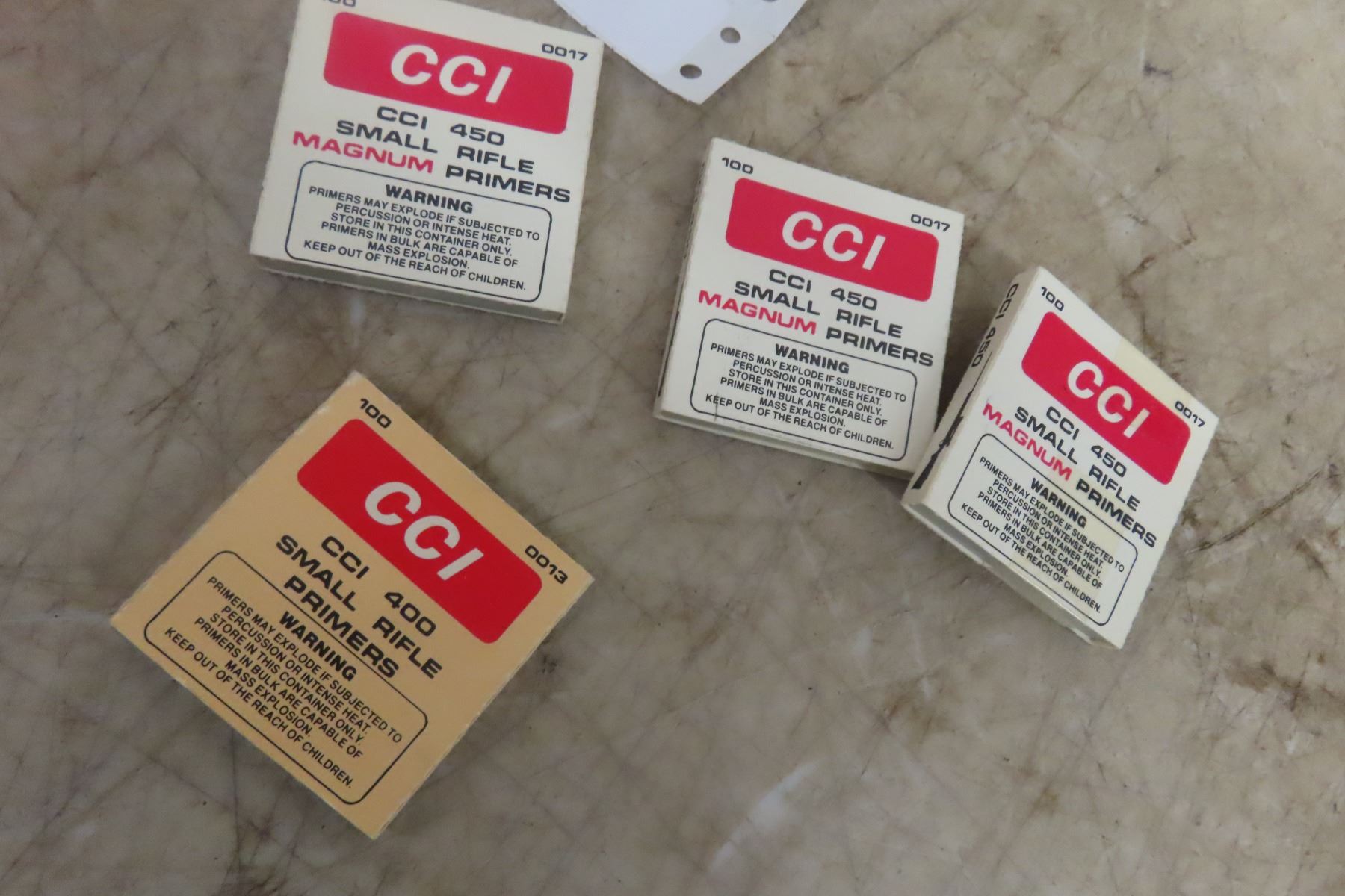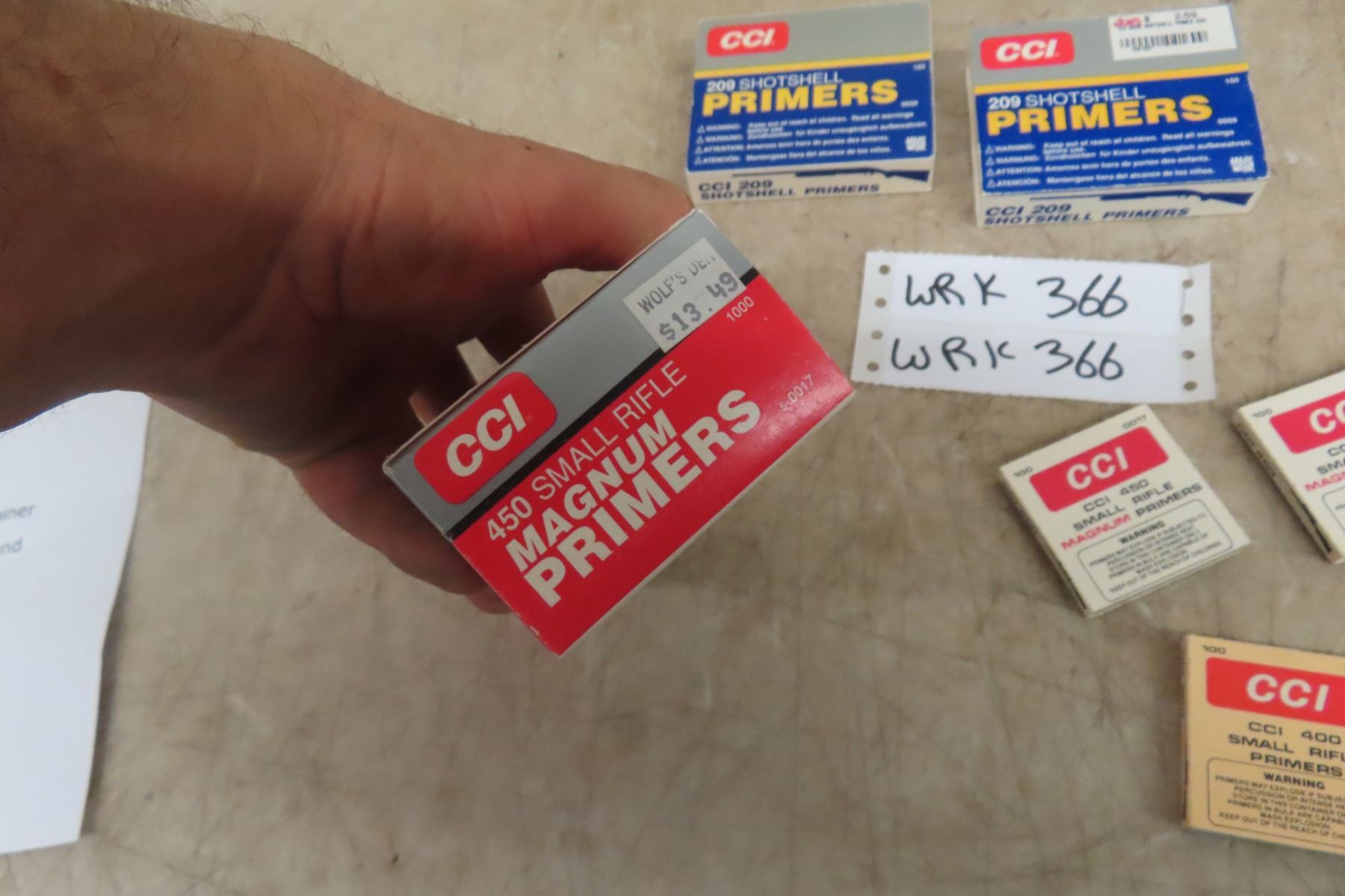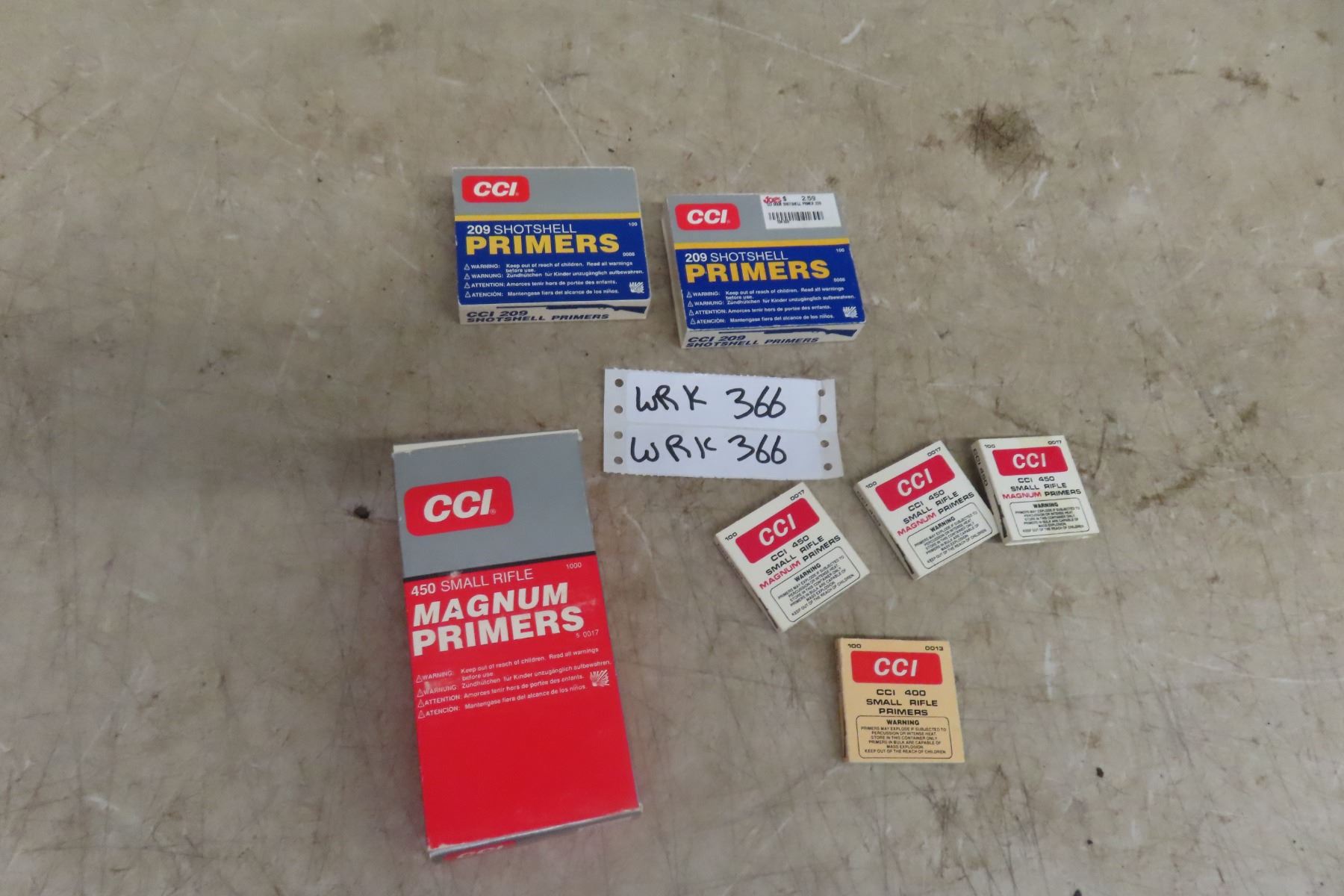 CCI Small Rifle Magnum Primers (1000), CCI 4505 Small Rifle Magnum Primers (300), CCI400 Small Rifle Primers (41) , CCI 209 Shotshell Primers (170)***Use at Own Risk**** **** Must Have Pal, MUST PRESENT PAL WHEN PAYING INVOICE. WE DO NOT AND WILL NOT SHIP AMMO. IF YOU WIN AMMO YOU WILL BE RESPONSIBLE TO PAY FOR IT AND RESELL IT UNDER YOUR OWN CONSIGNMENT.
