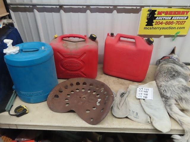 (CJ) 2 Gas Cans, Water Jug, Metal Implement Seat & Welding Gloves
