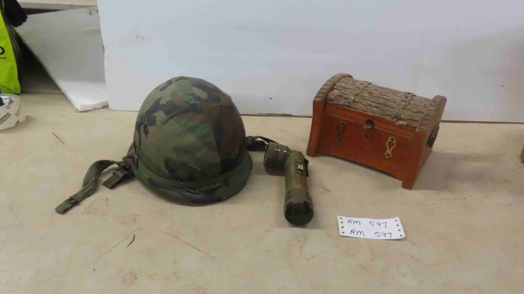 Camo Army Helmet with Lining, Flashlight, Wood Treasure Box, Plus