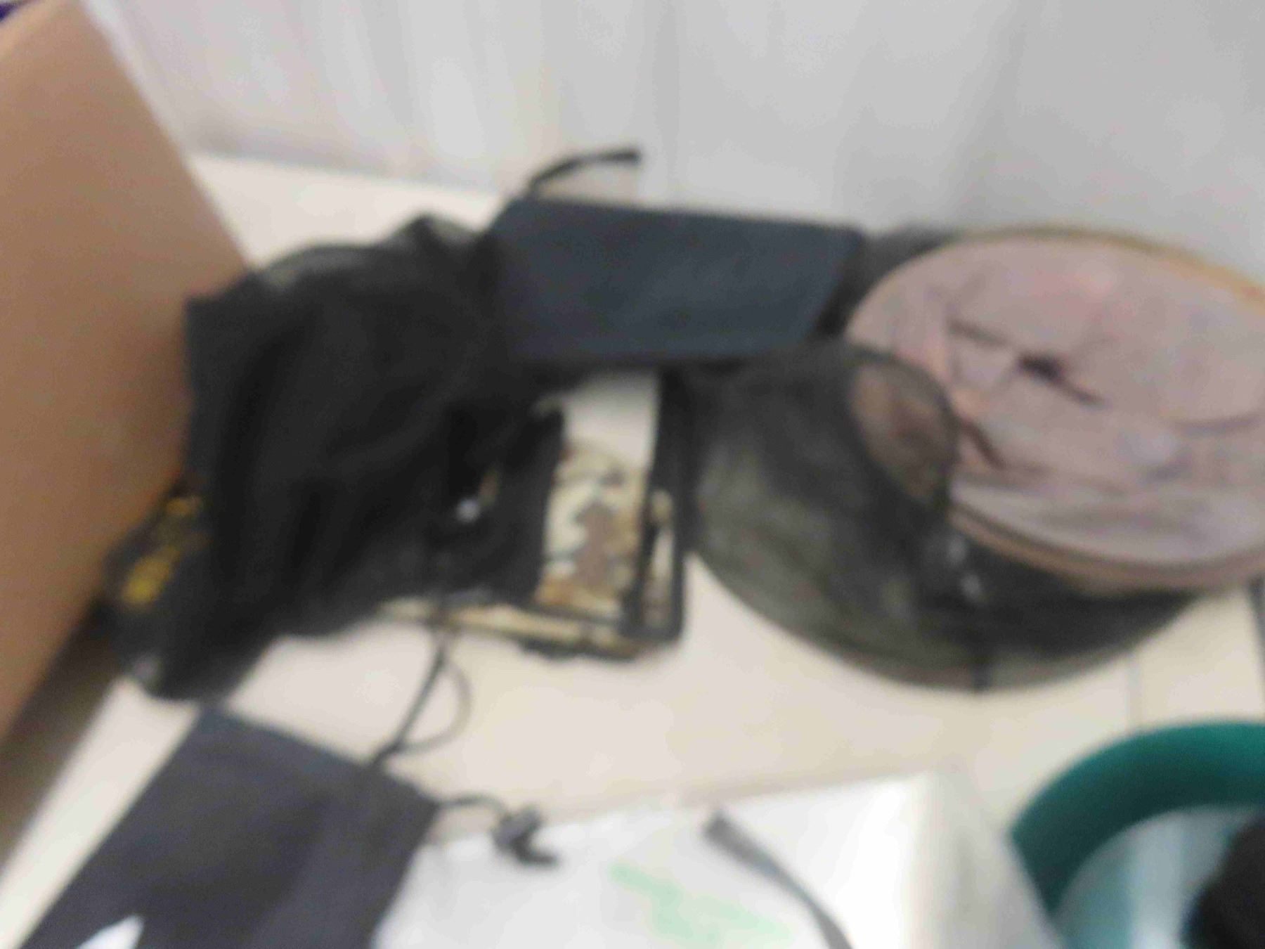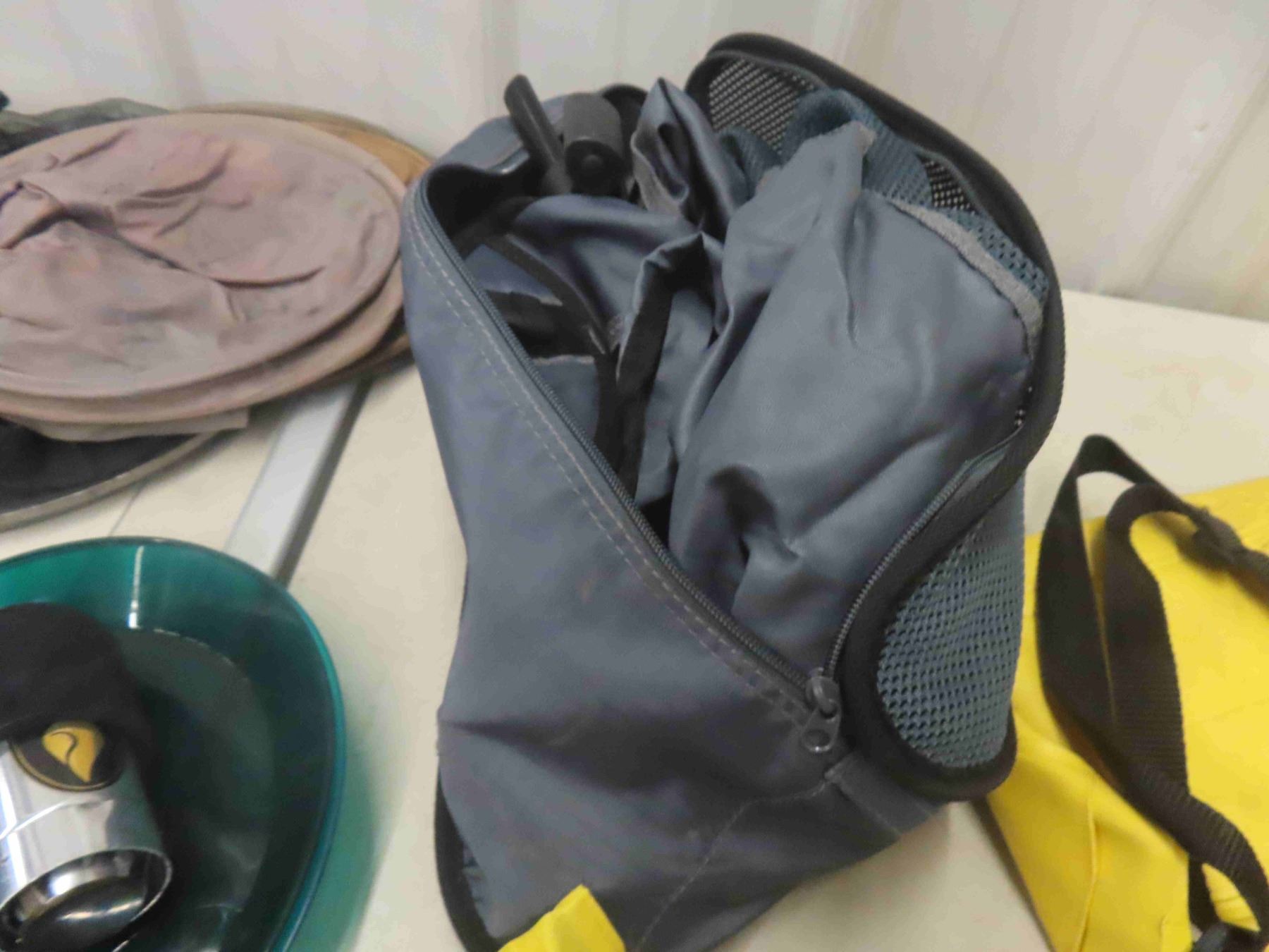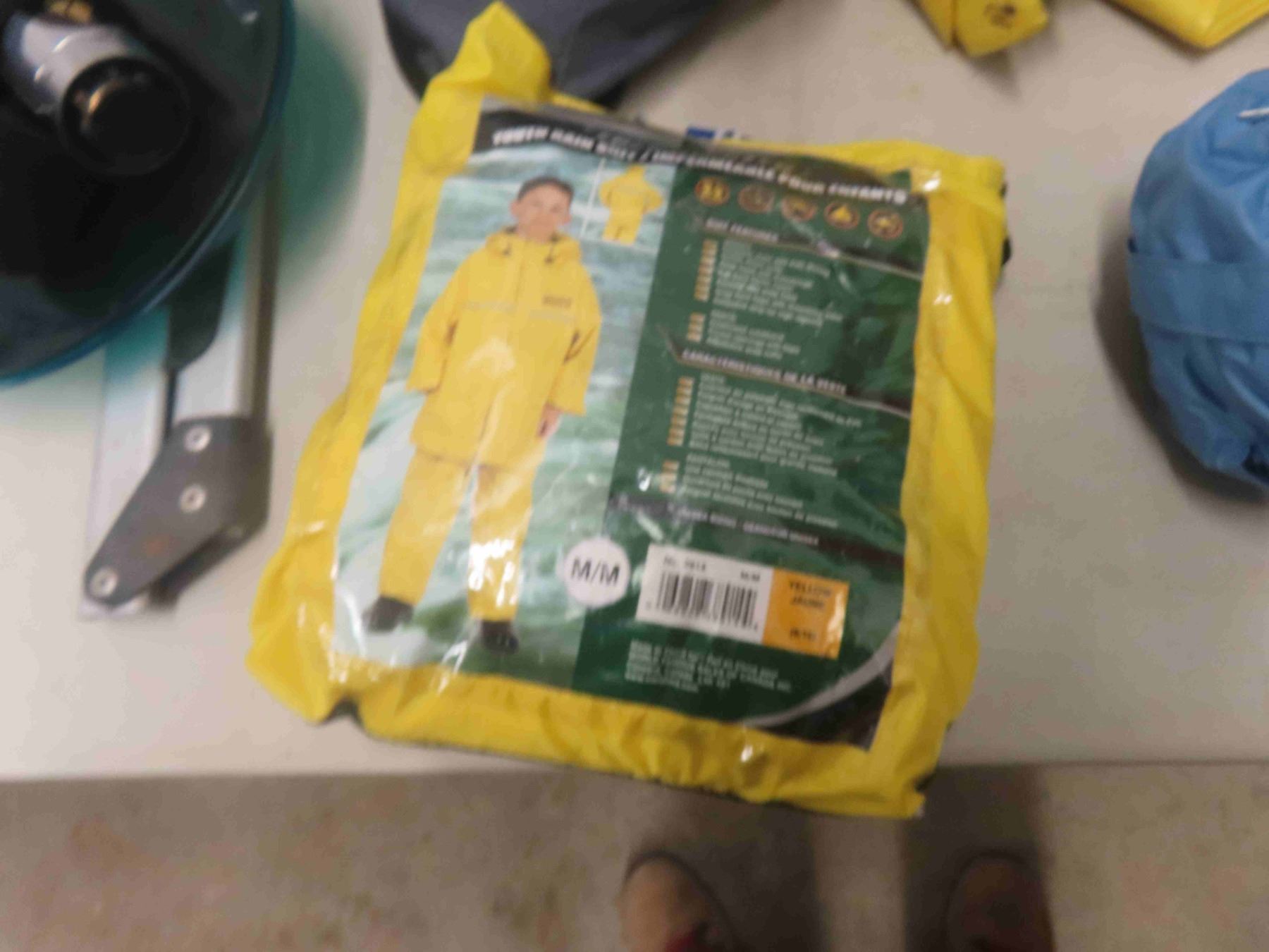 Camping Items: NOS Mosquito Shield, Rain Suit, Folding Stool,