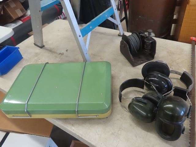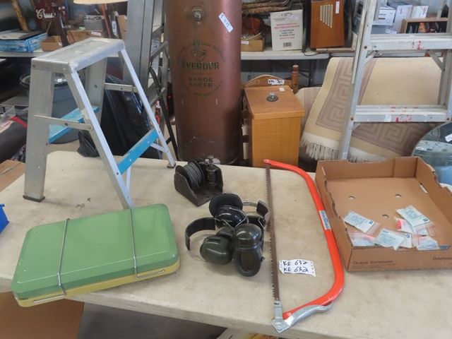 Camping Stove, Step Ladder, Ear Protection, Wire, Saw & Canvas Tarp