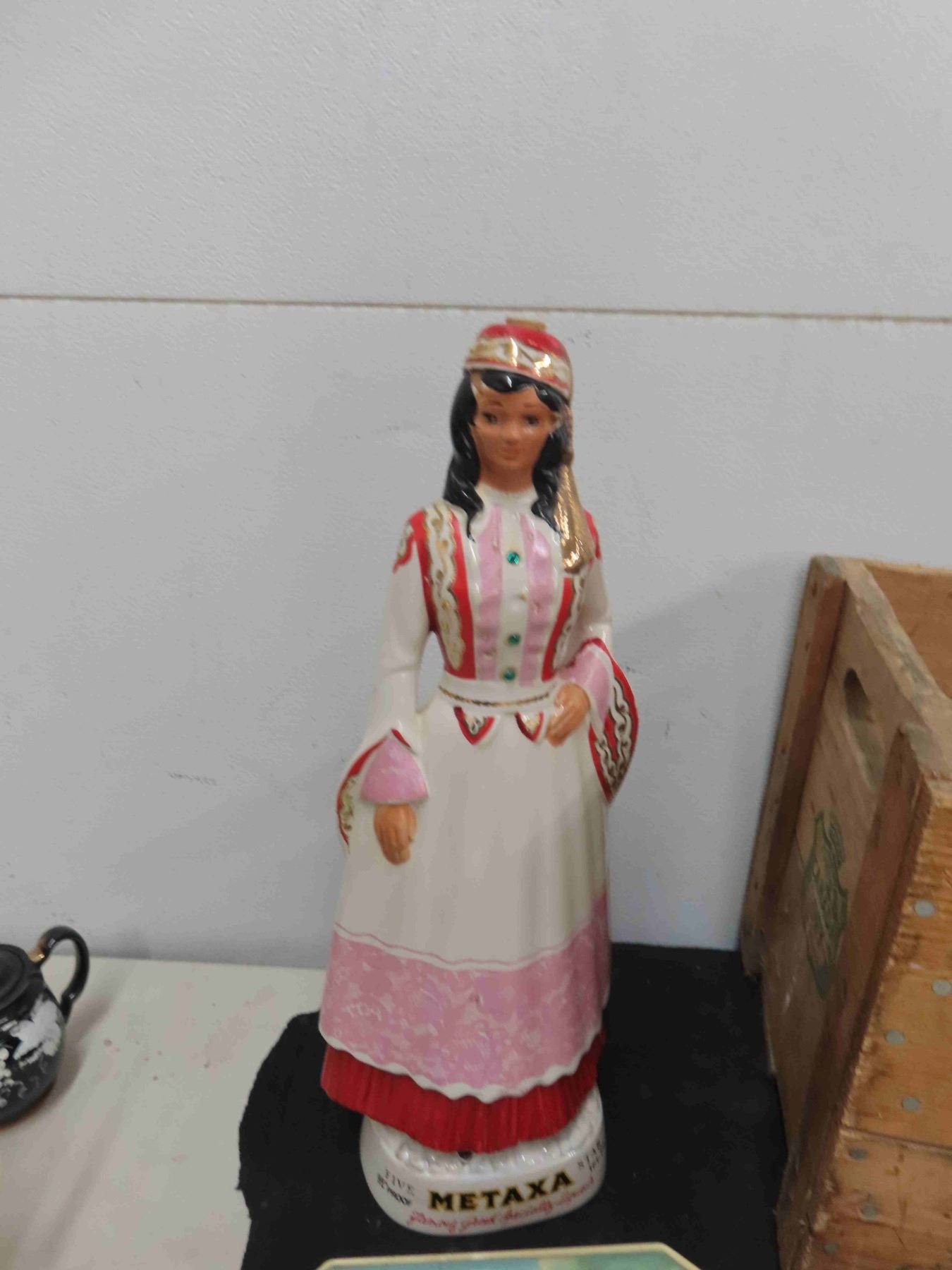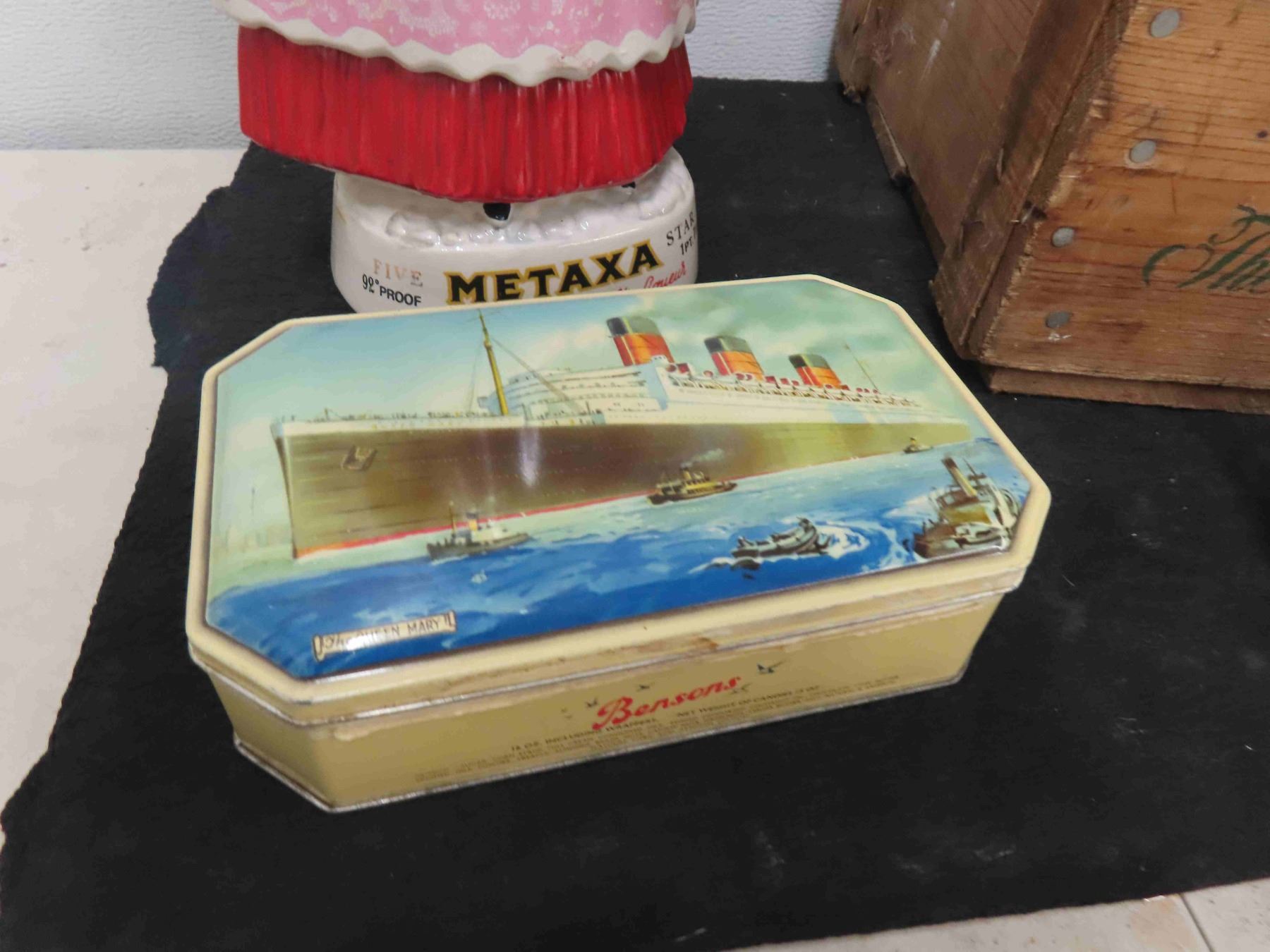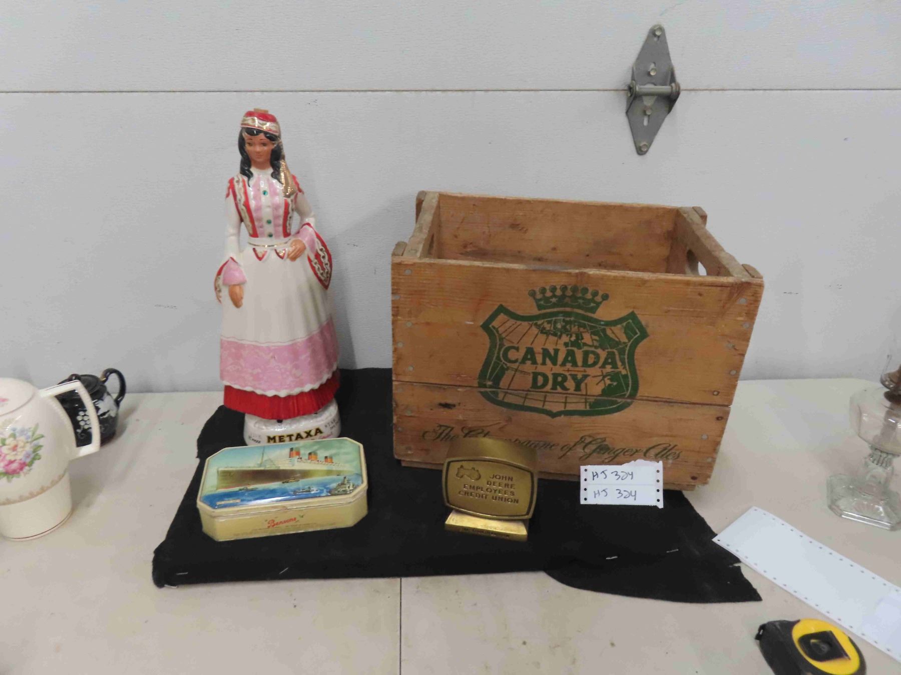 Canada Dry Pop Crate , John Deere Employees Credit Union Brass Display, Metaxa Decanter, Benson Tin
