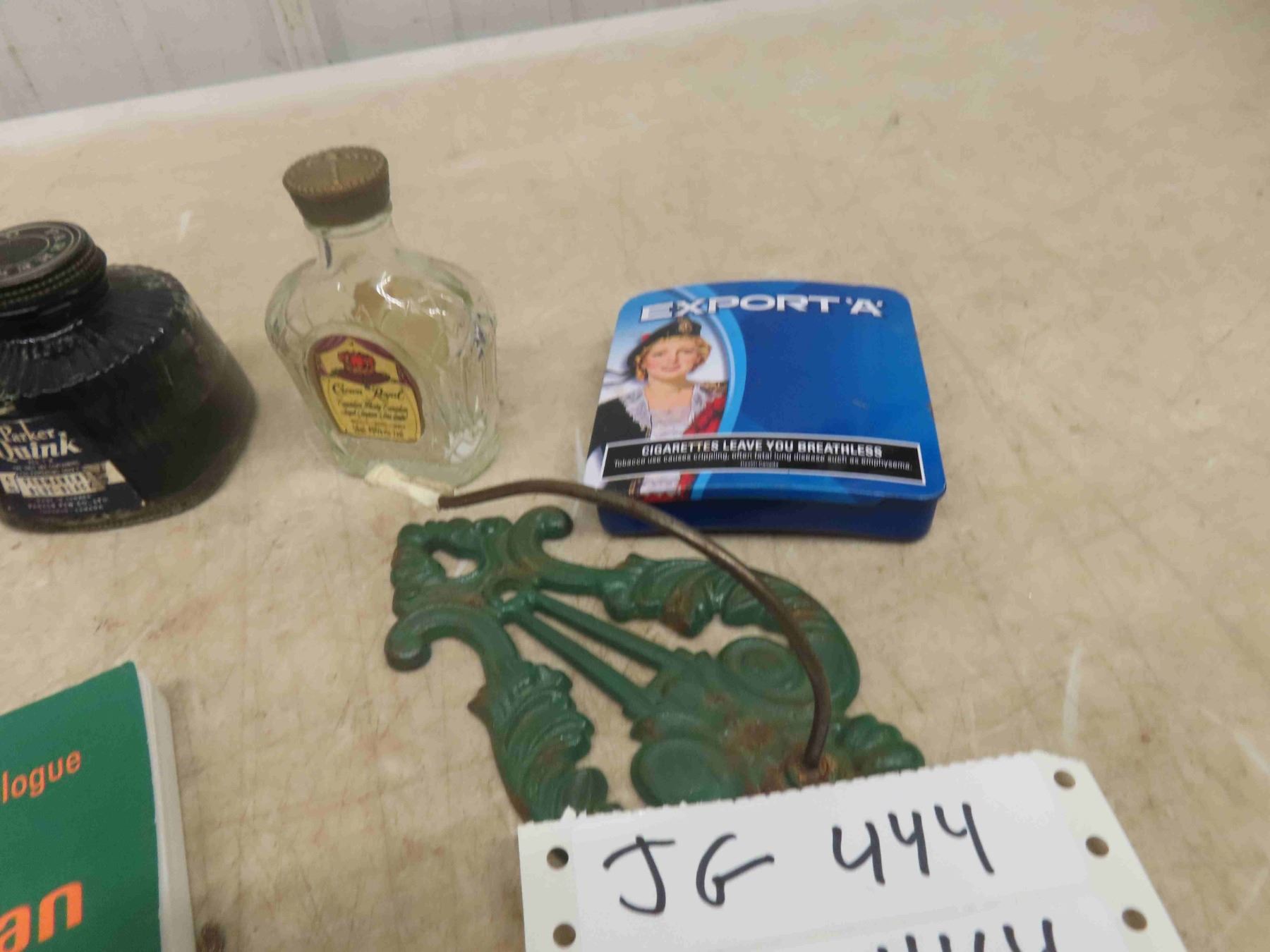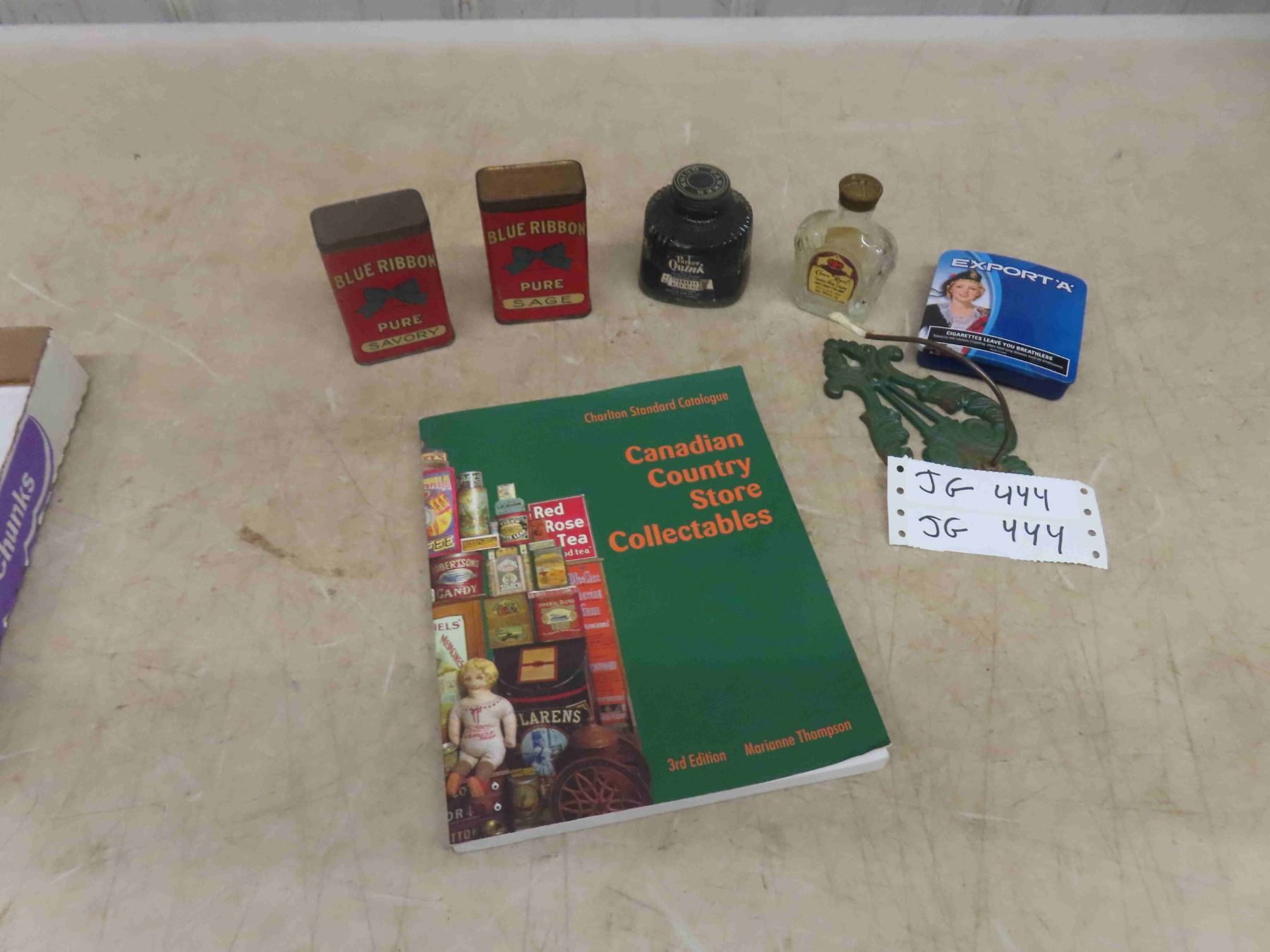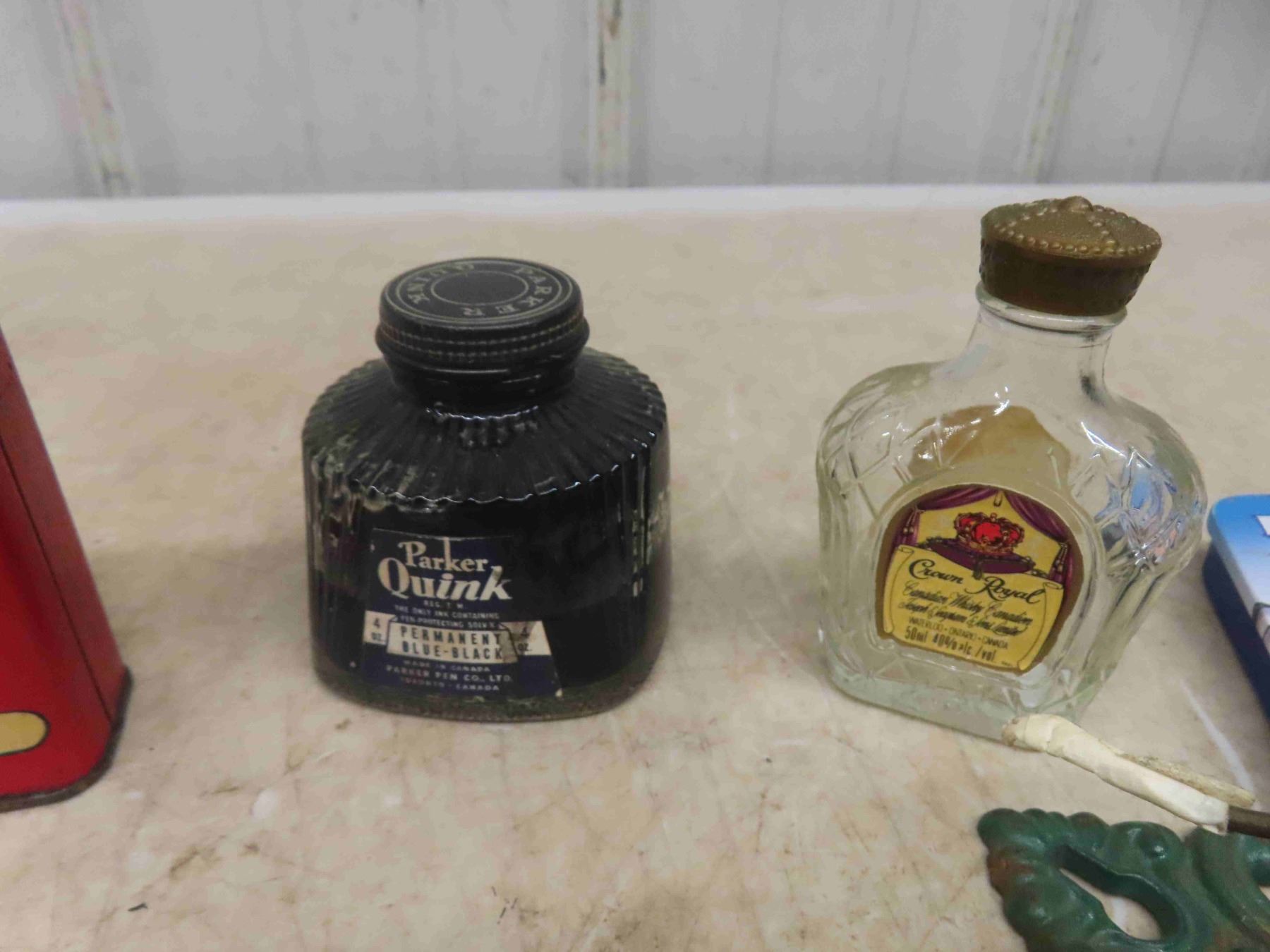 Canadian Country Store Collectibles Book , 3 Tins Small Crown Royal Bottle, Bottle of Parker Quick Ink, Metal Bill Hook