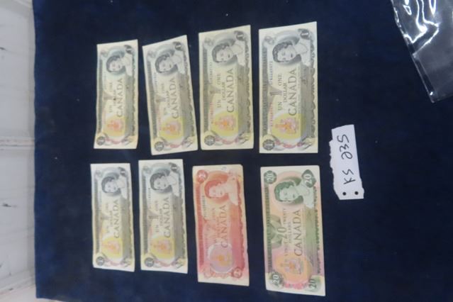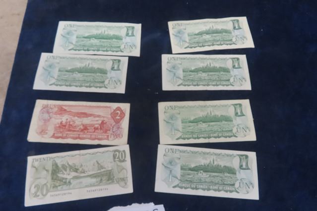 Canadian Money Bills; 1979 $20, 1974 $2, (6) 1973 $1