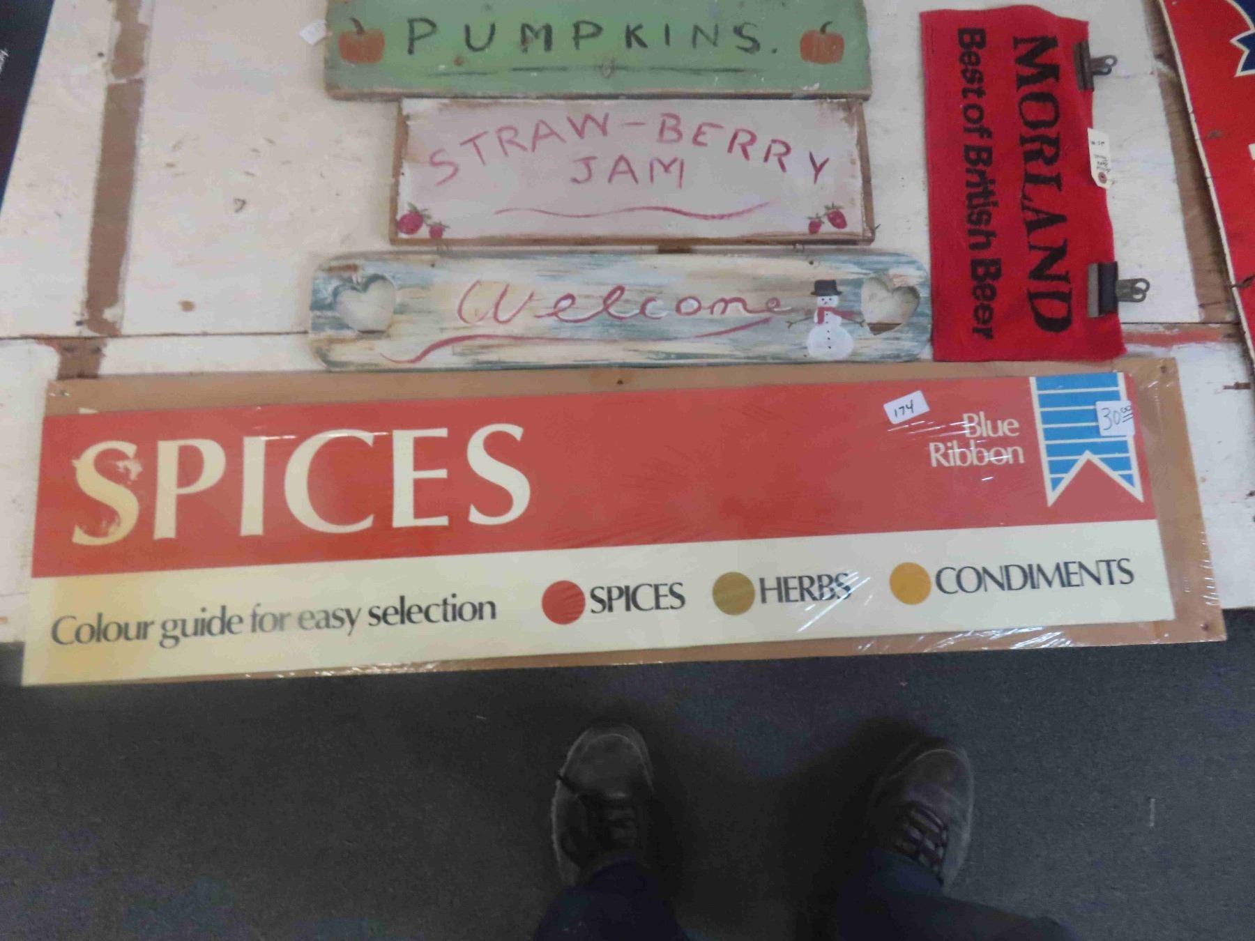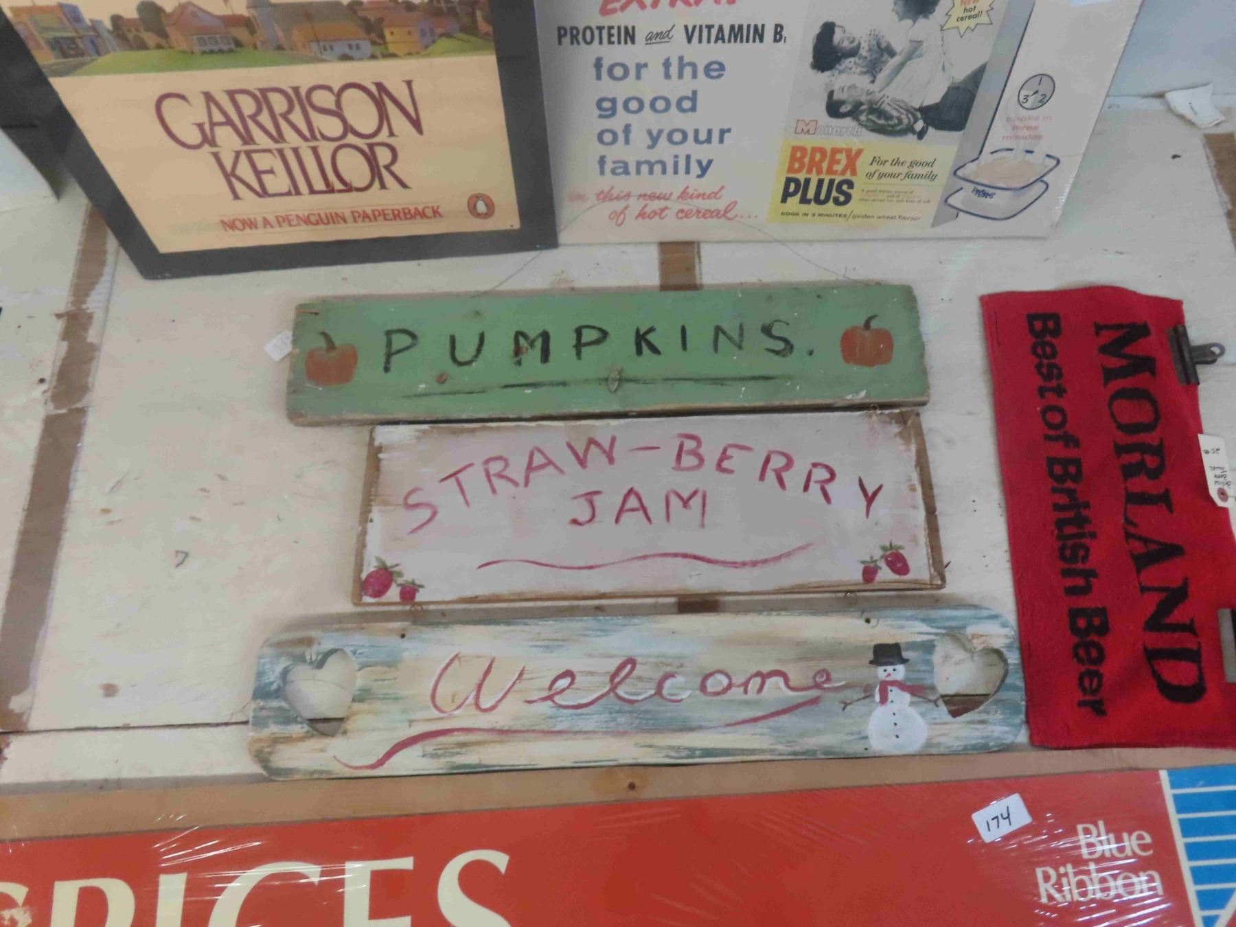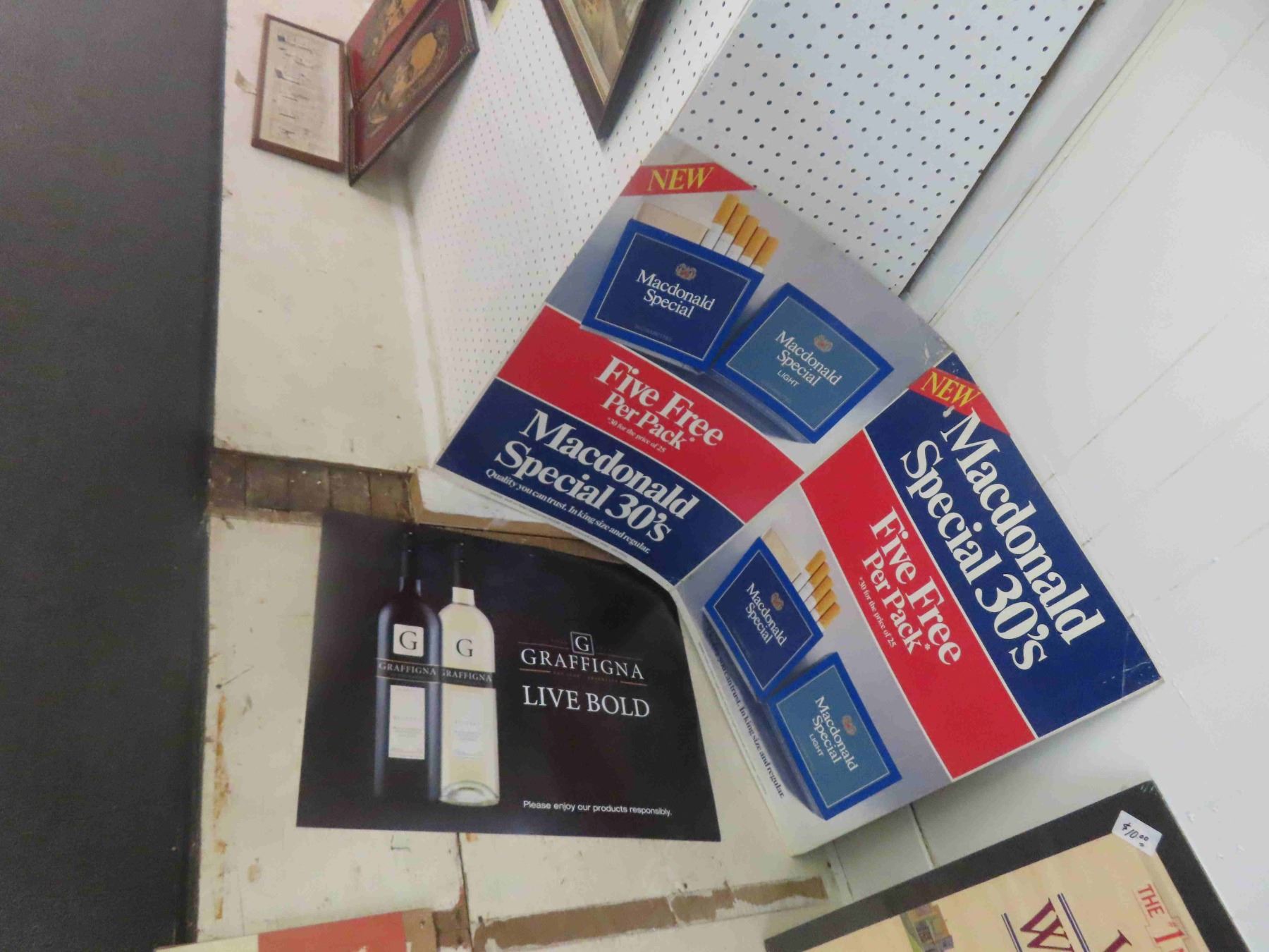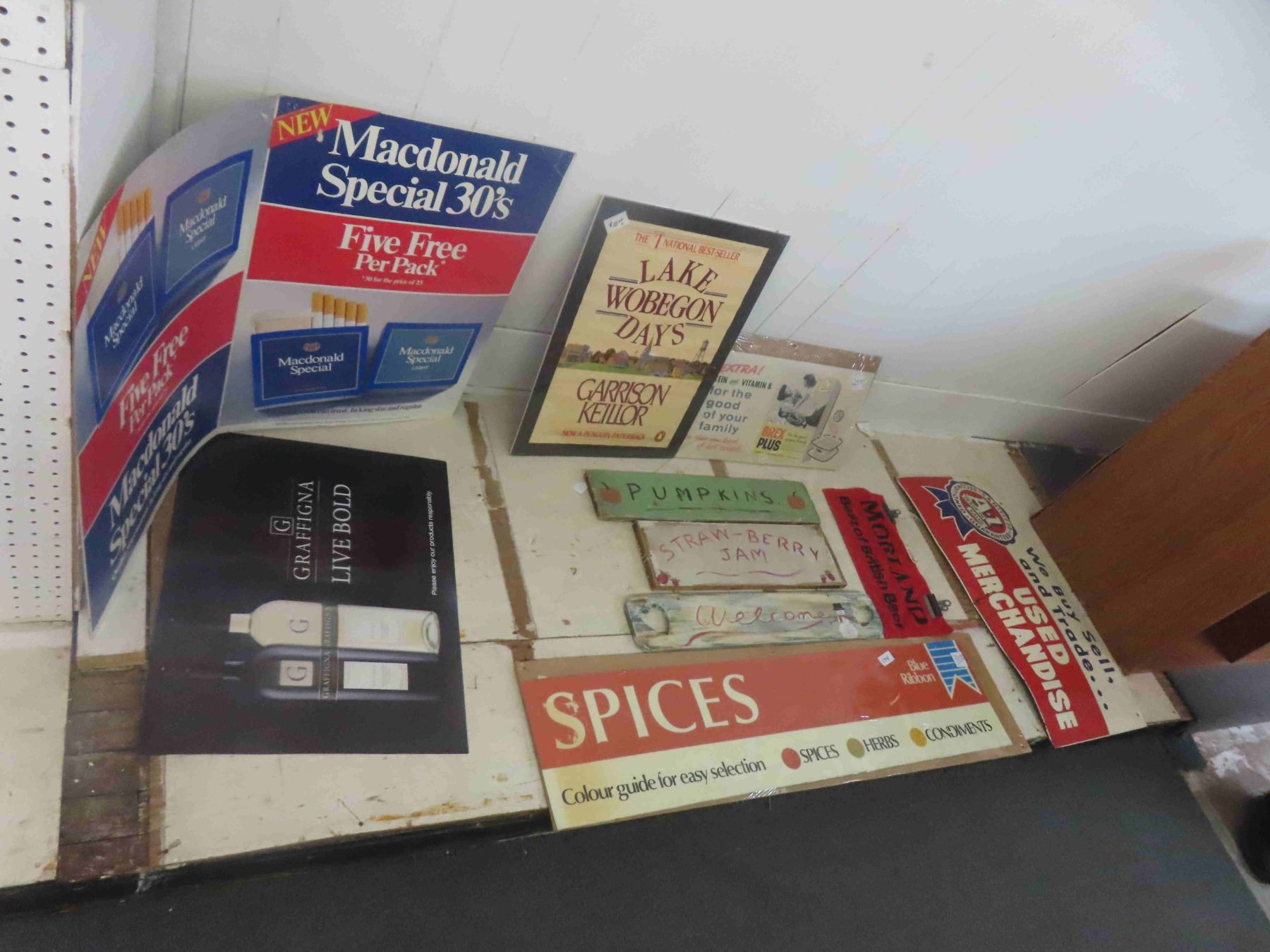 Cardboard McDonald Cigarette Sign, 3 Painted Garden Sign, plus others