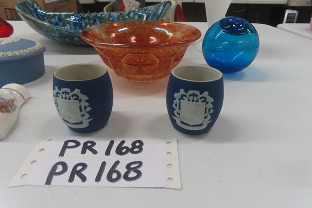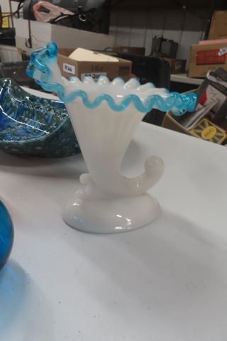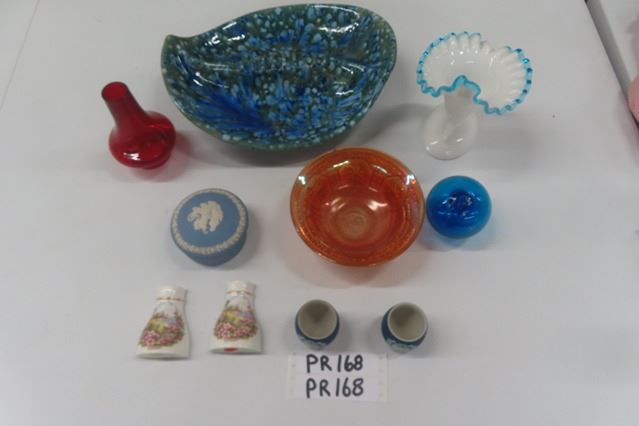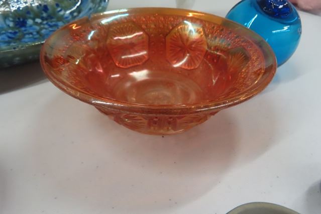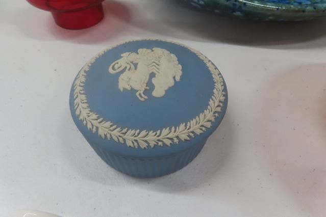 Carnival Glass Bowl, Fenton Vase, Wedgewood Dish + Other Colored Glass