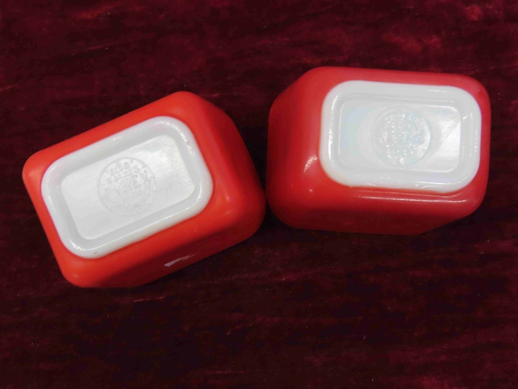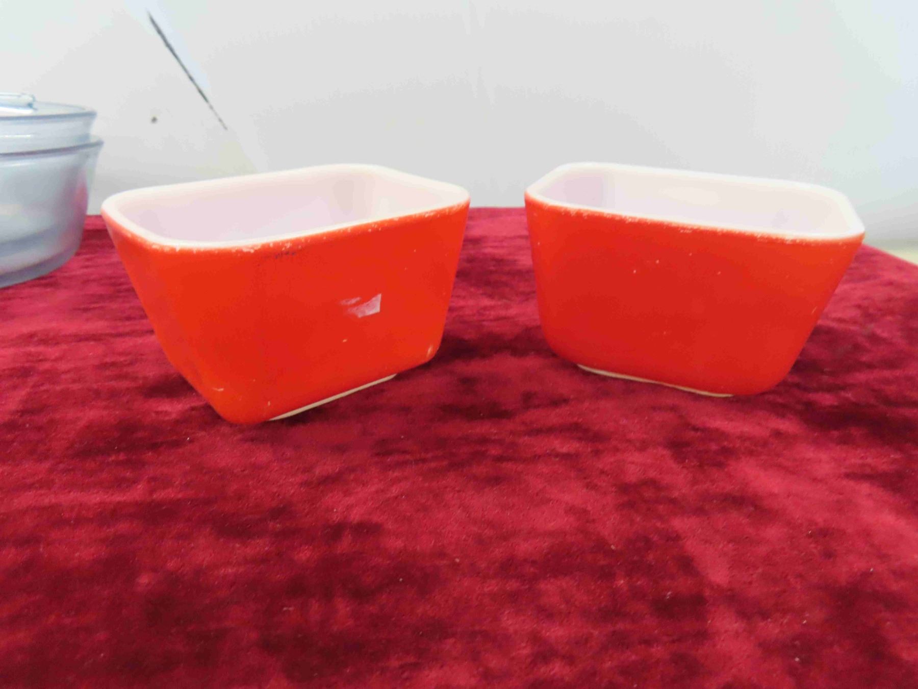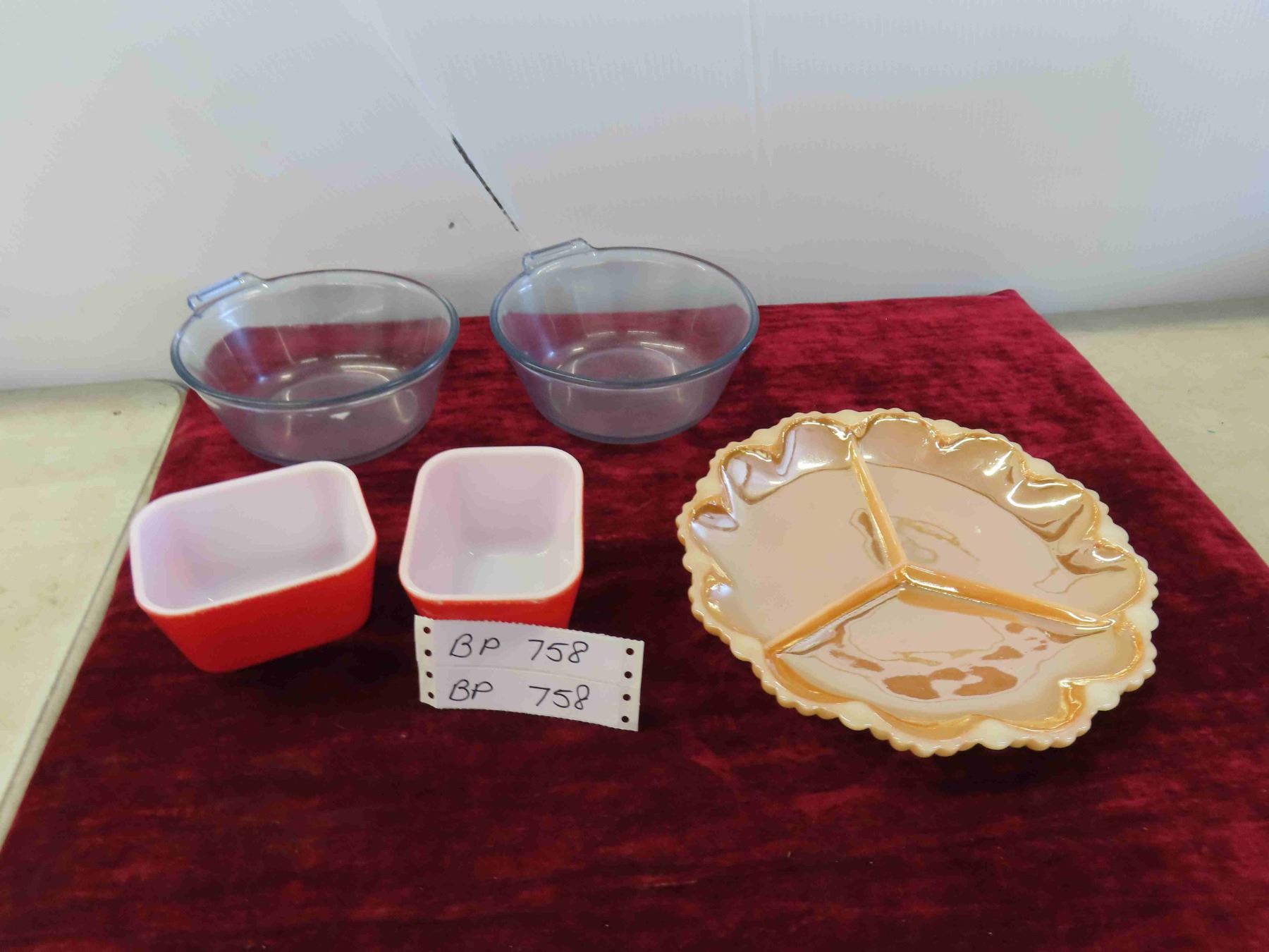 Carnival Serving Dish , 2 Red Pyrex Refrigerator Dishes, 2 Pyrex Bowls