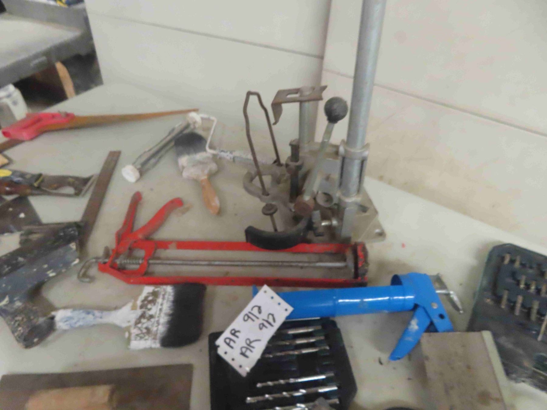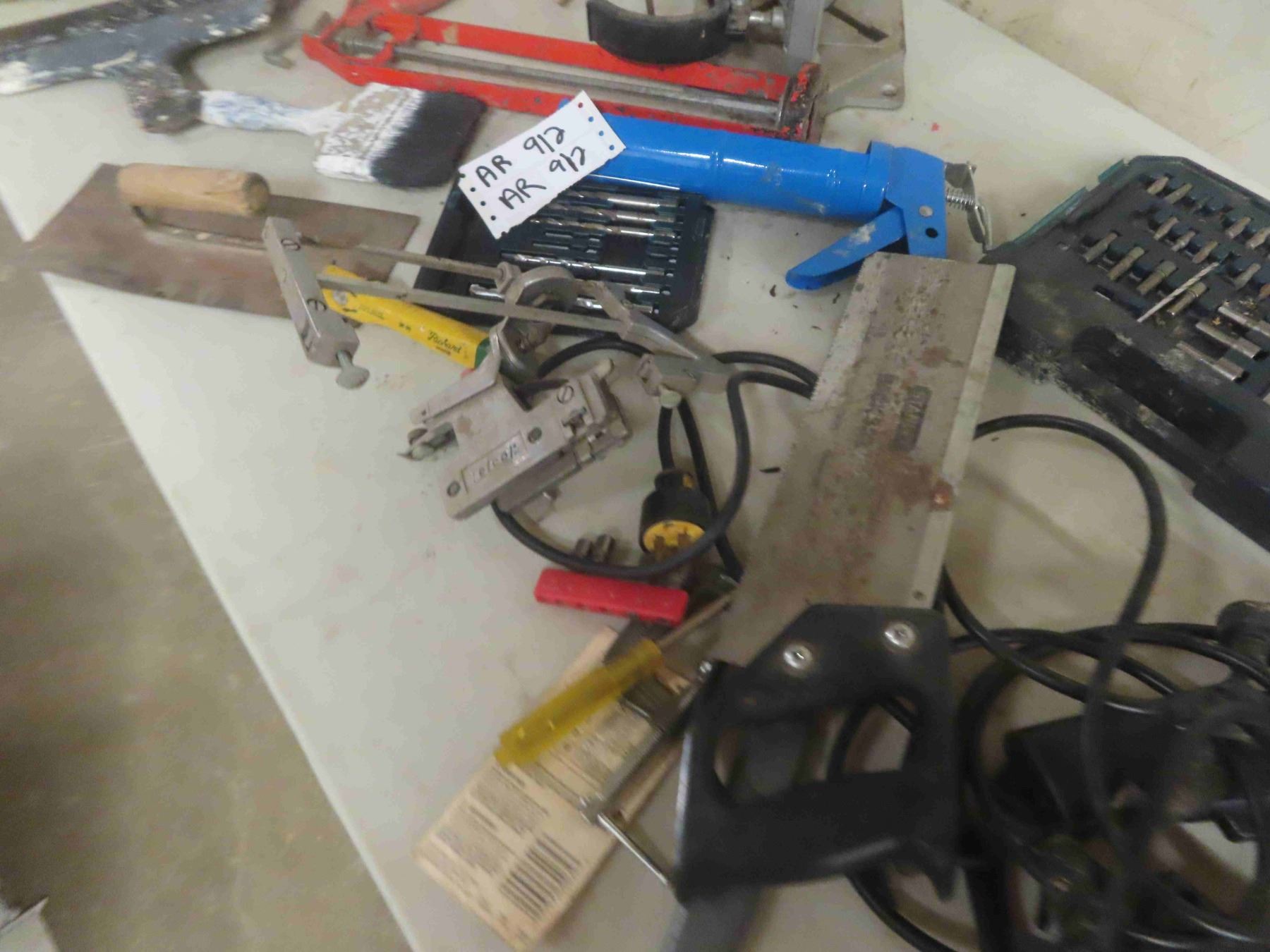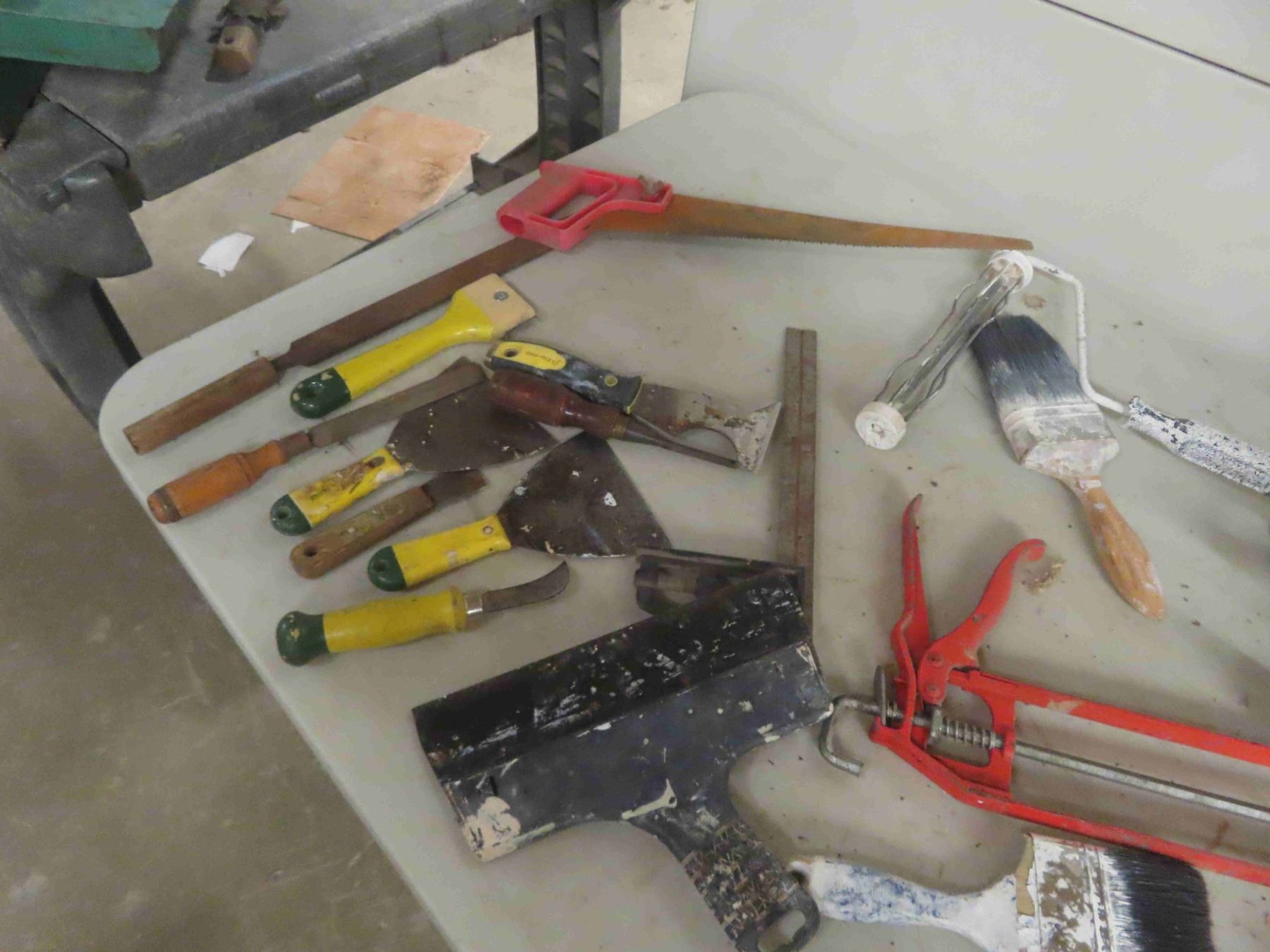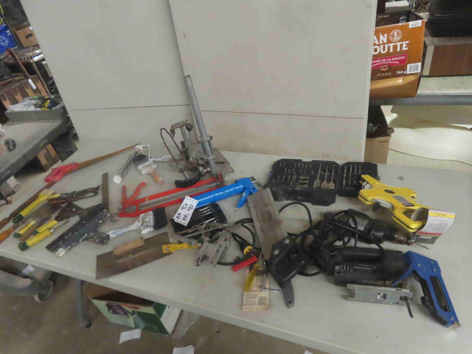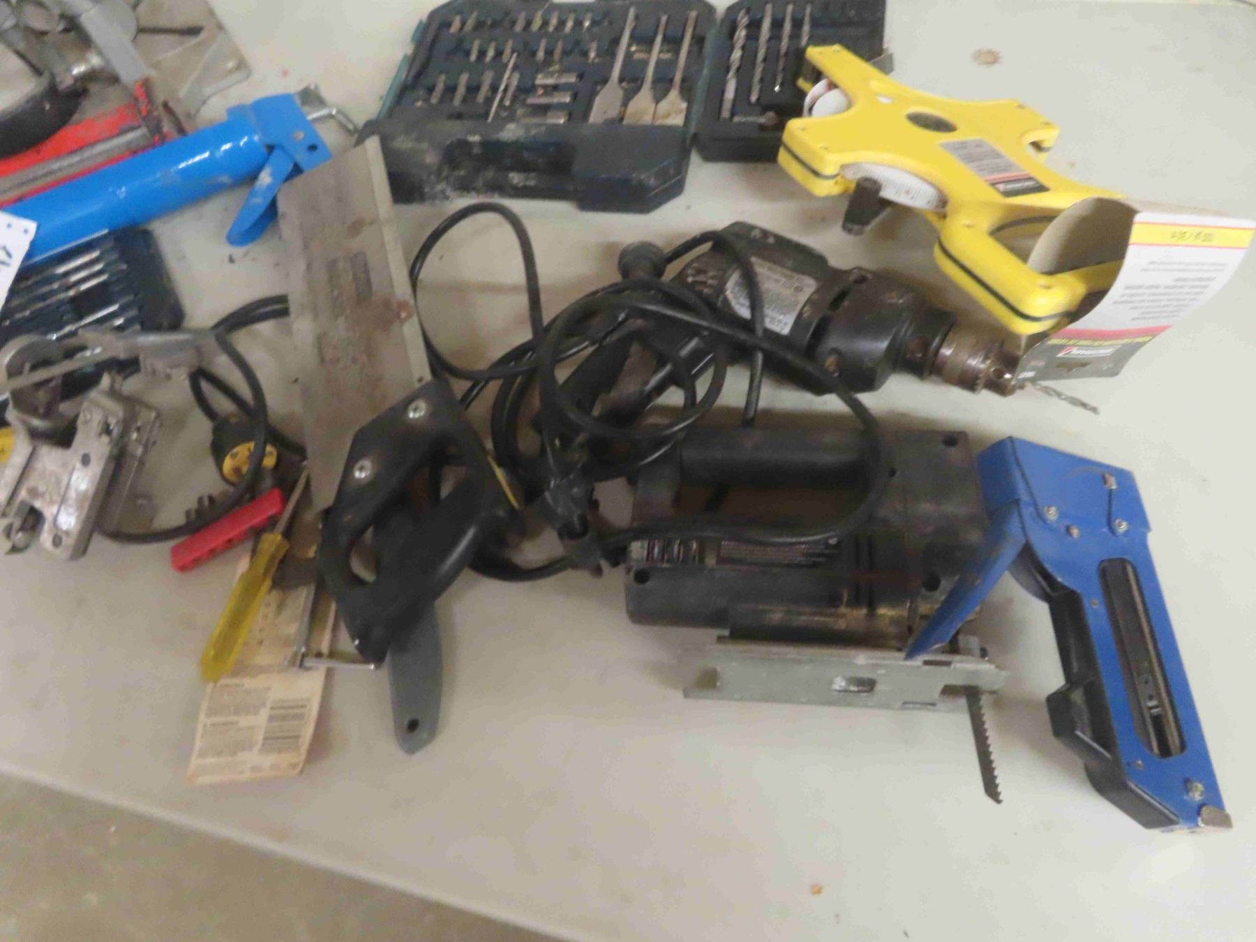 Carpentry OddsnEnds of Tools ; Power Jig Saw, Drill, Drill Bits, 100' Tape Measure, Scraper Saw, Caulking, plus more