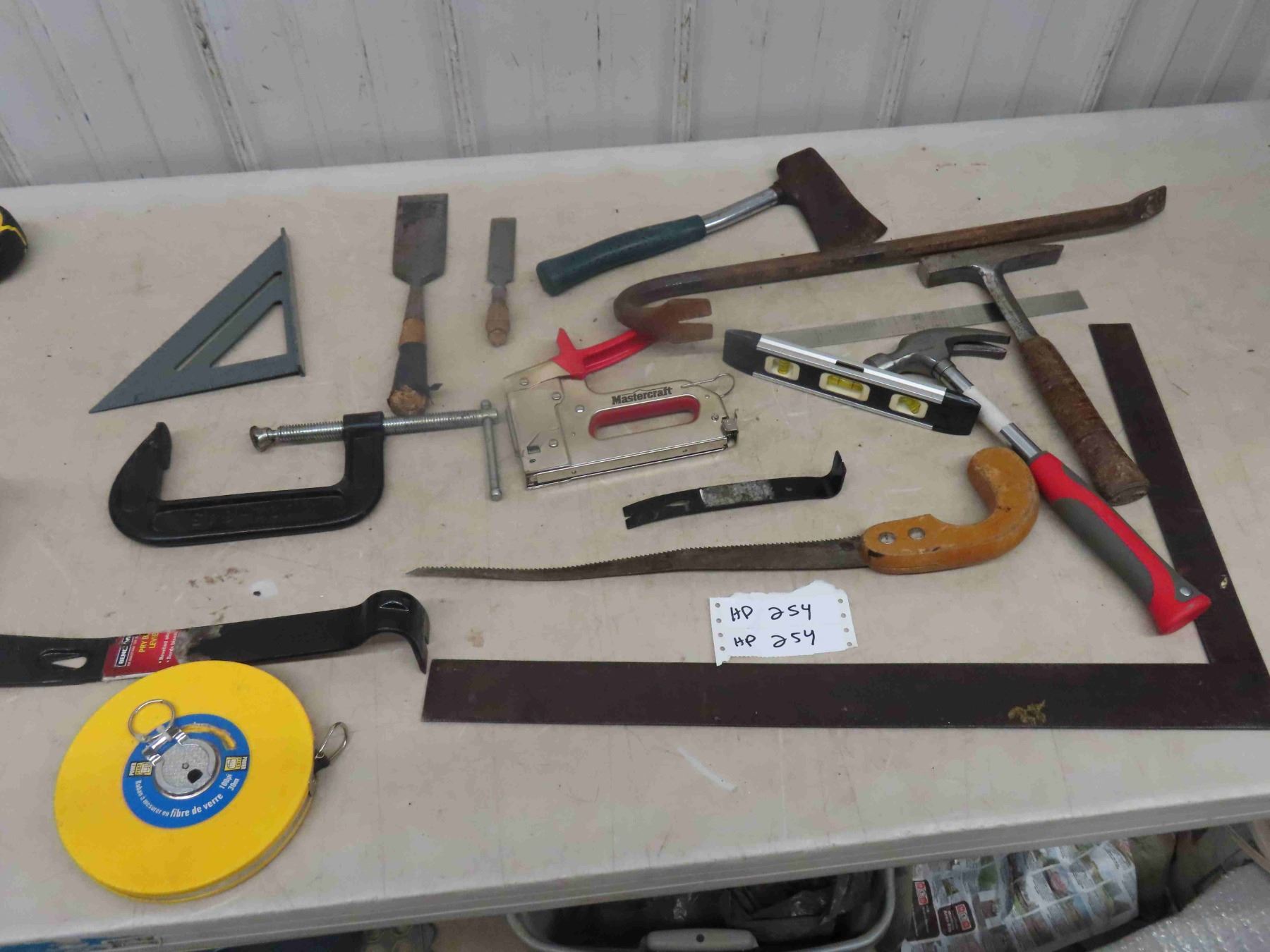 Carpentry Tools ; Square, Tape Measure, Wrecking Bar, Hatchet, Stapler, Hammer, plus more