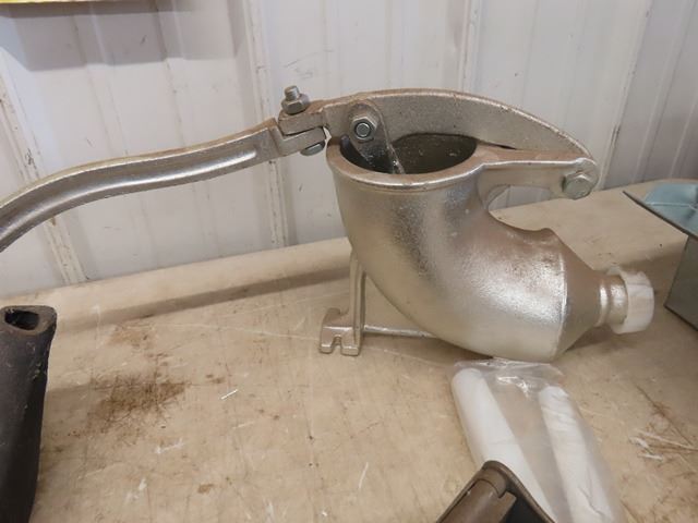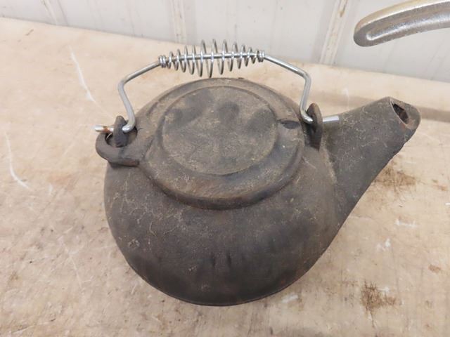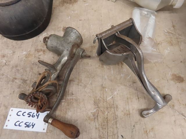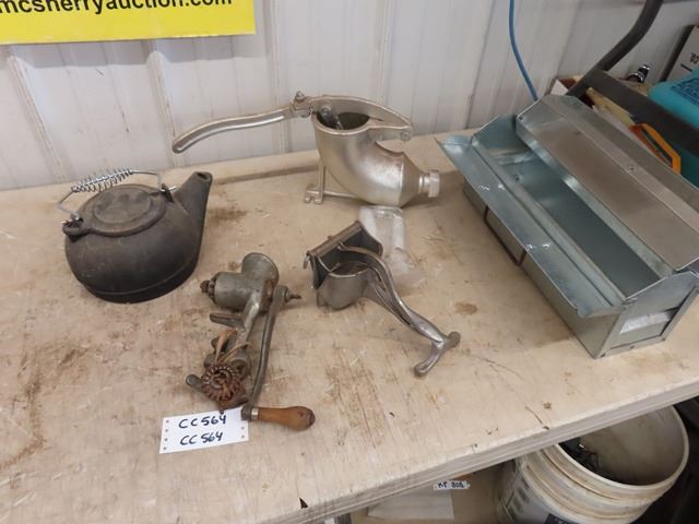 Cast Iron Tea Pot, Sausage Stuffer, Galvanized Tool Box, Meat Grinder, Press