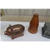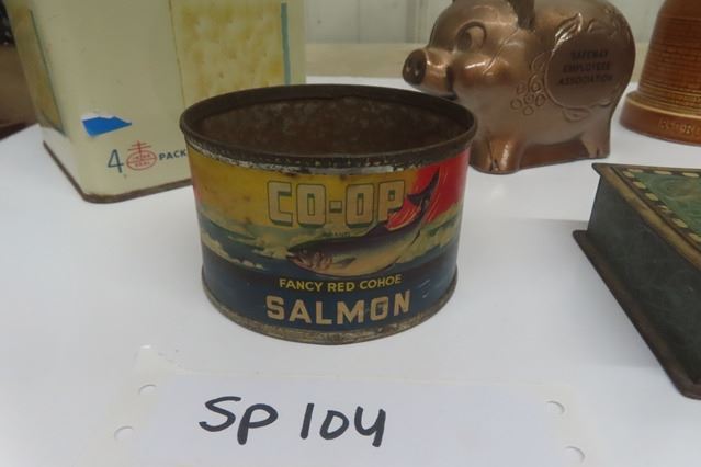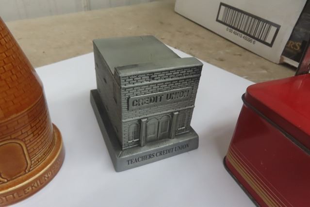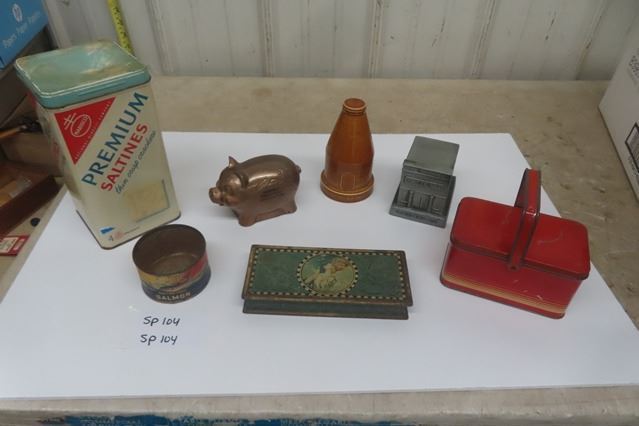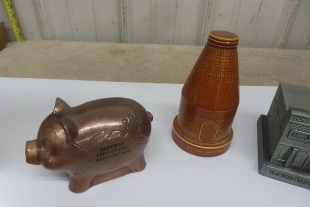 Cast Metal Credit Union Bank, Safeway Metal Pig Bank, Bottle Kiln Bank, Cracker TIn, Basket Tin +