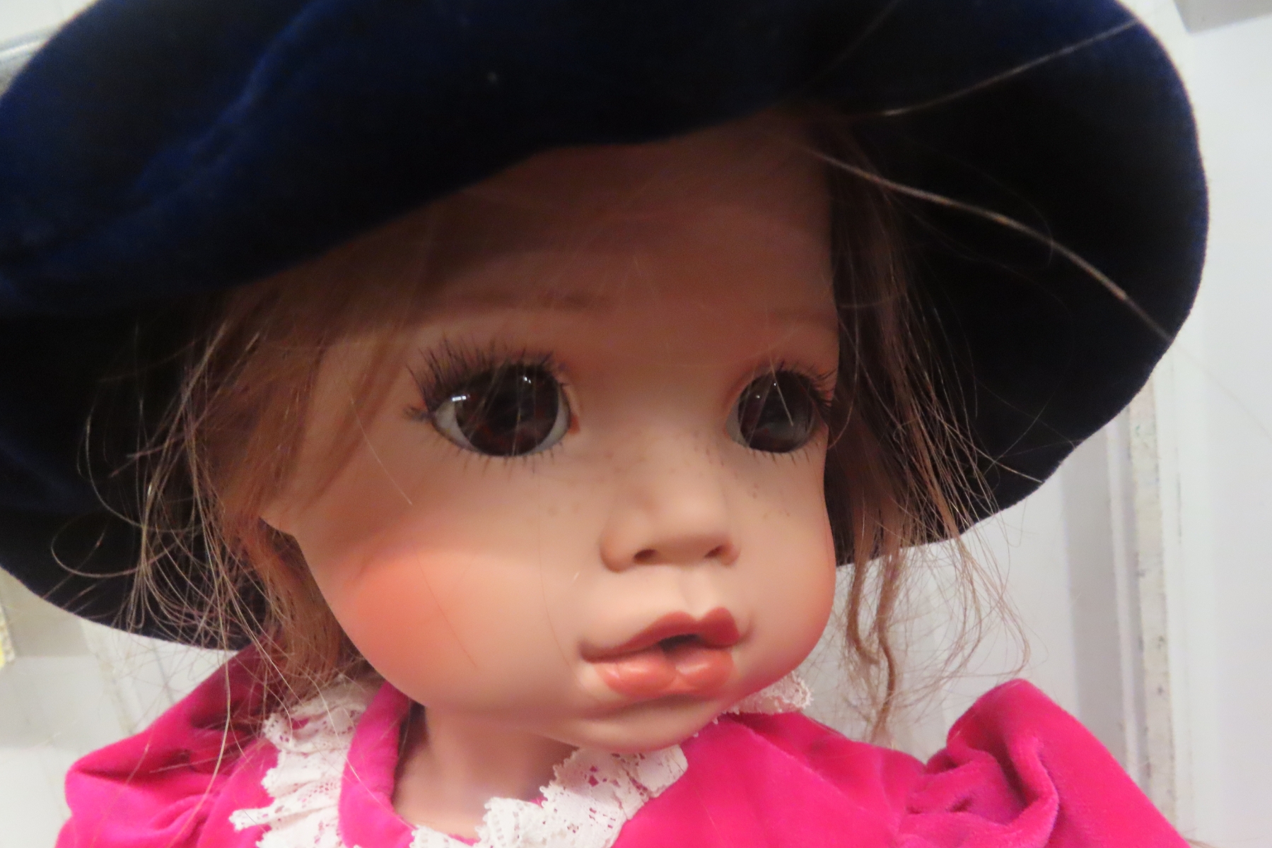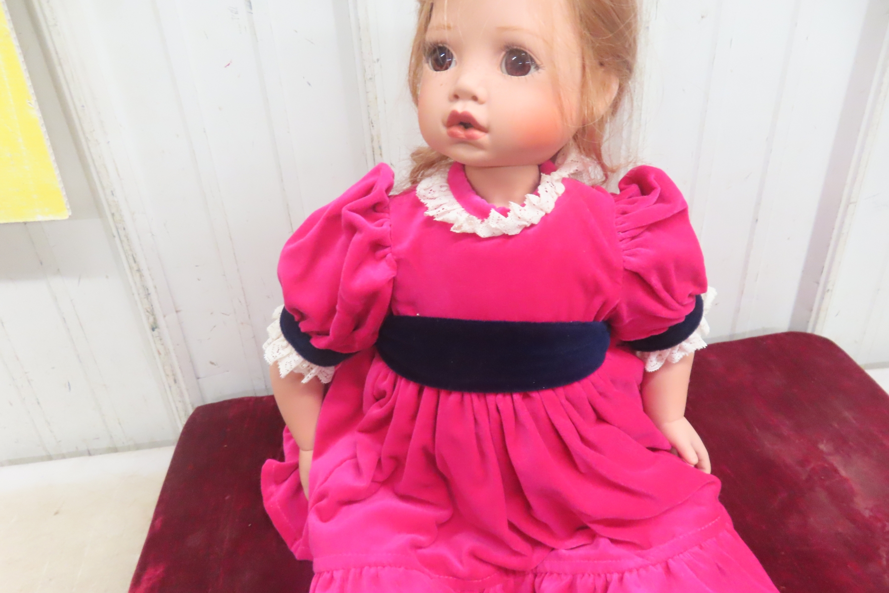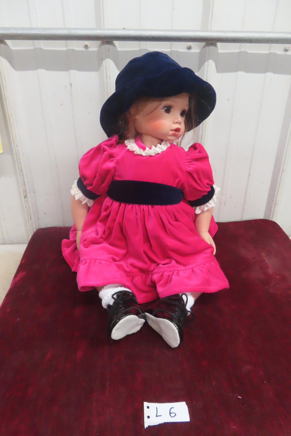 Celia Doll Company 22" Doll Wearing Pink Velvet Dress With Navy Velvet Trim and Matching Hat. Vinyl Head and Limbs With Realistic Inset Eyes. Includes Black Patent Shoes and Socks.