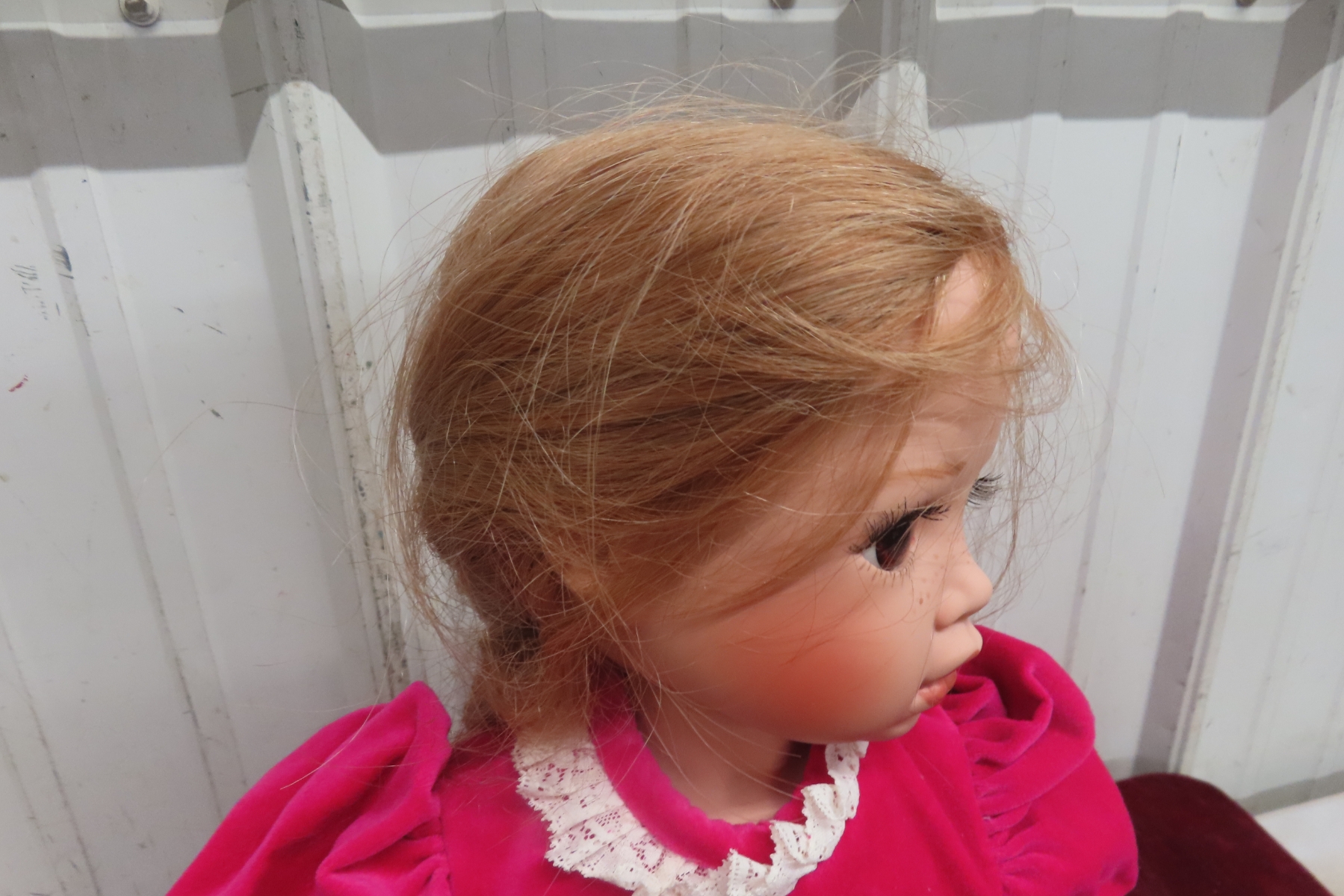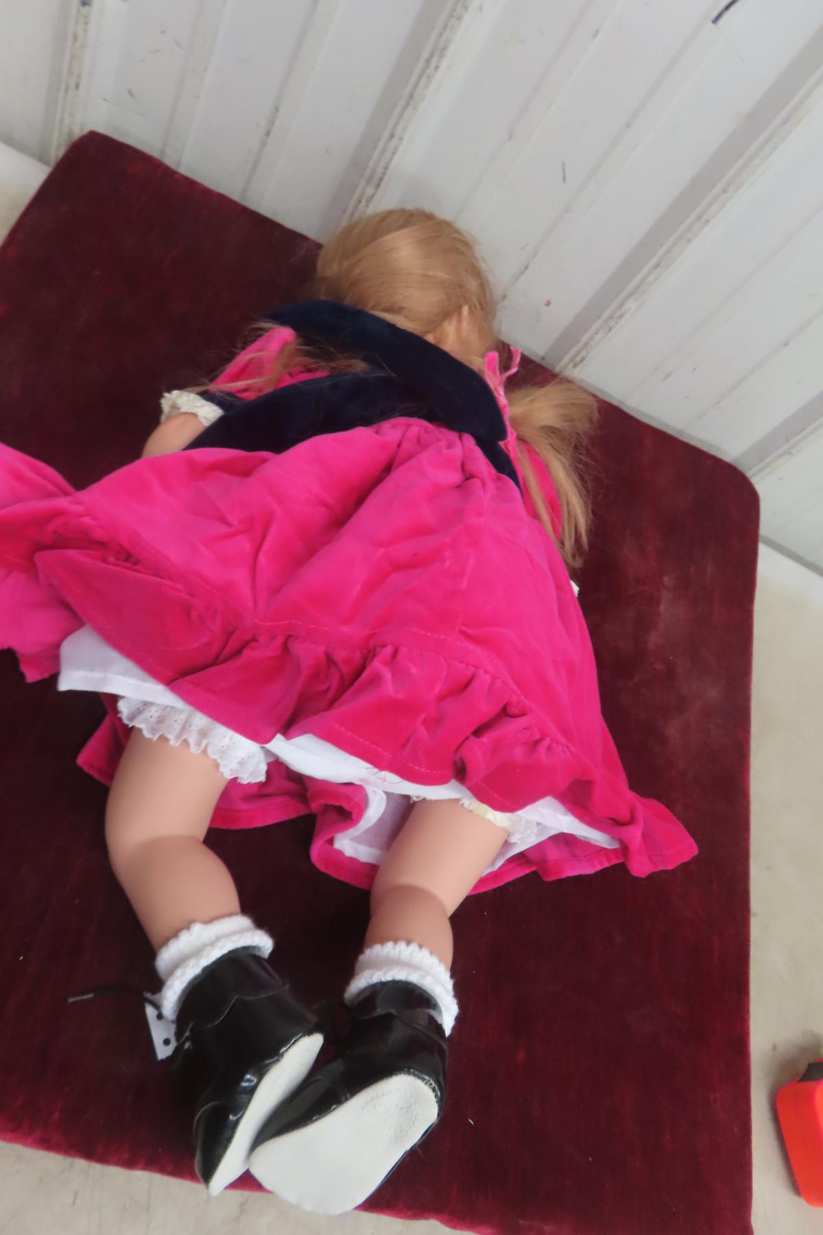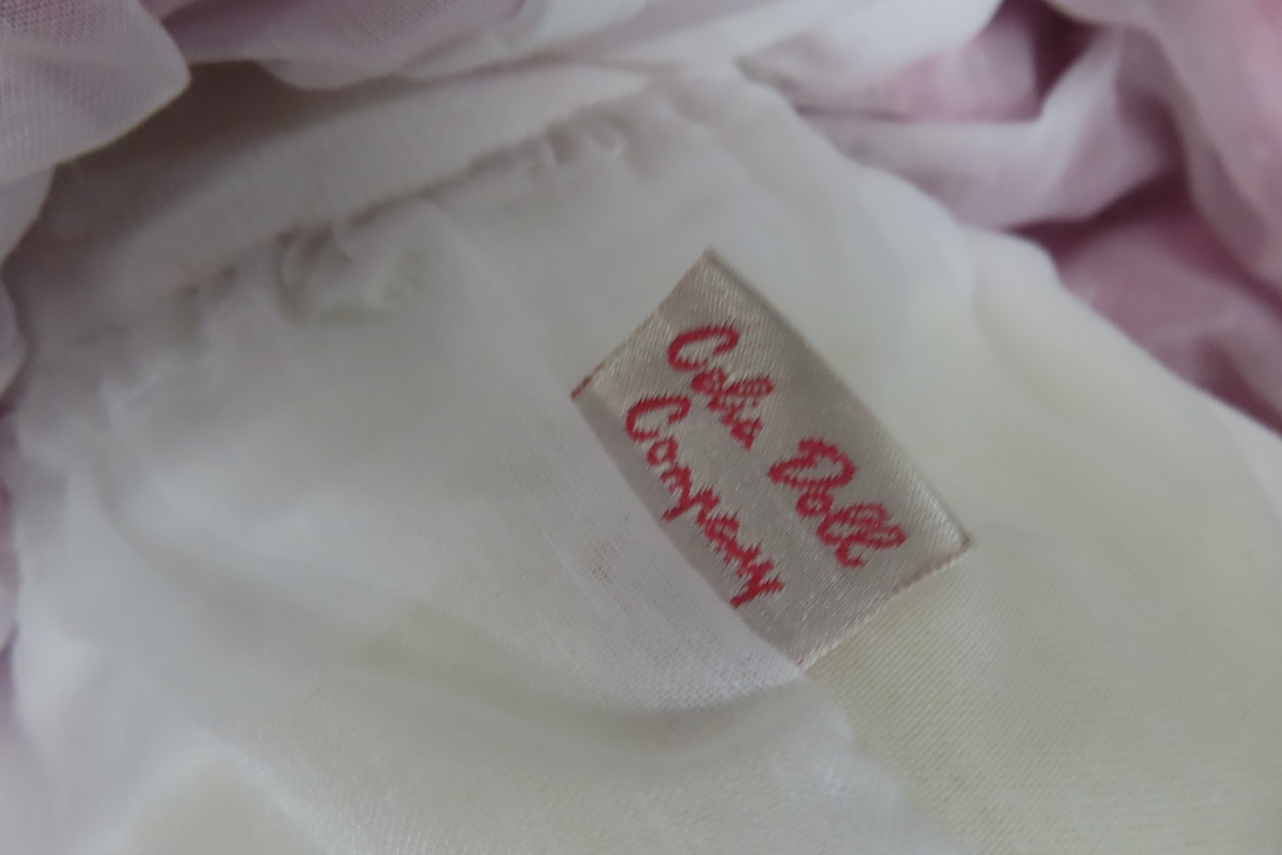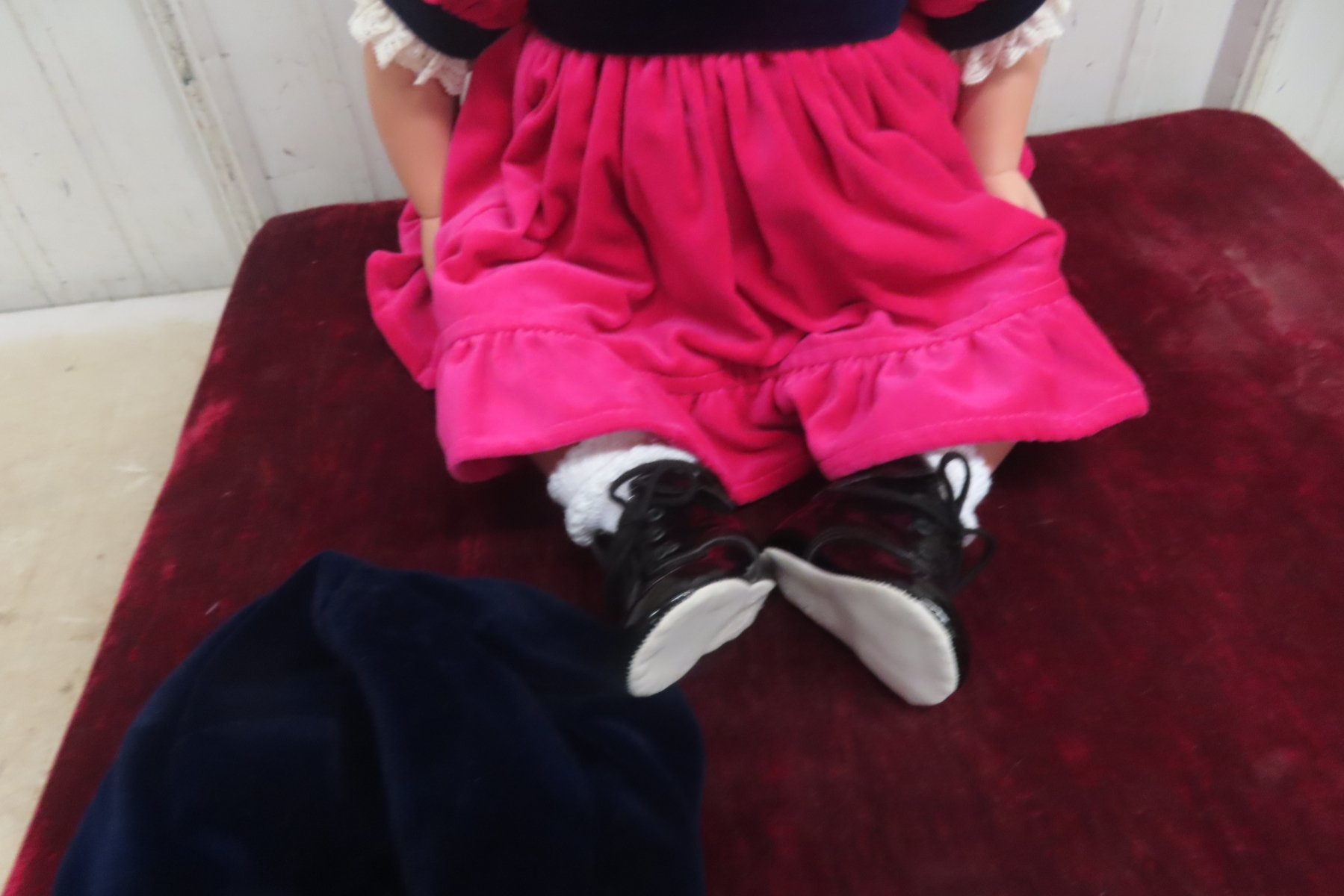 Celia Doll Company 22" Doll Wearing Pink Velvet Dress With Navy Velvet Trim and Matching Hat. Vinyl Head and Limbs With Realistic Inset Eyes. Includes Black Patent Shoes and Socks.
