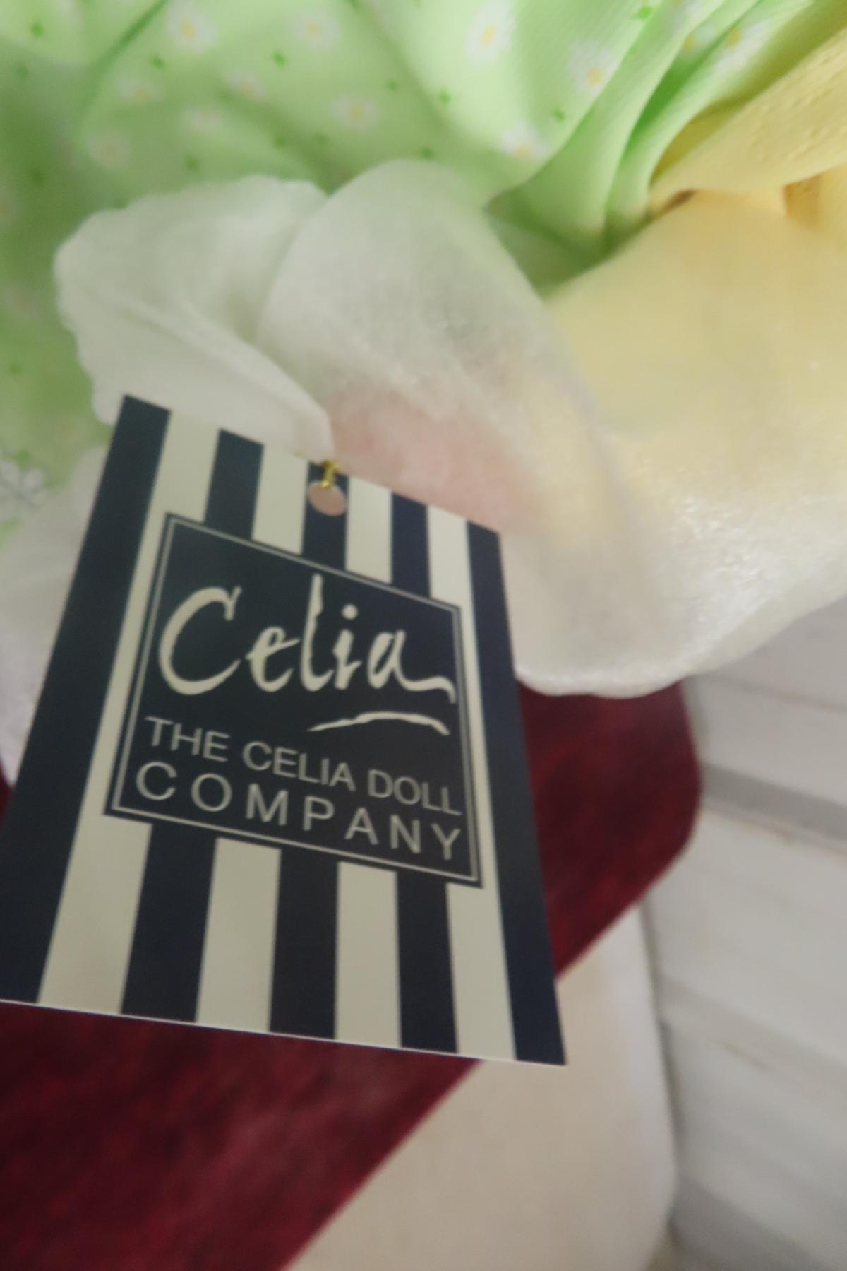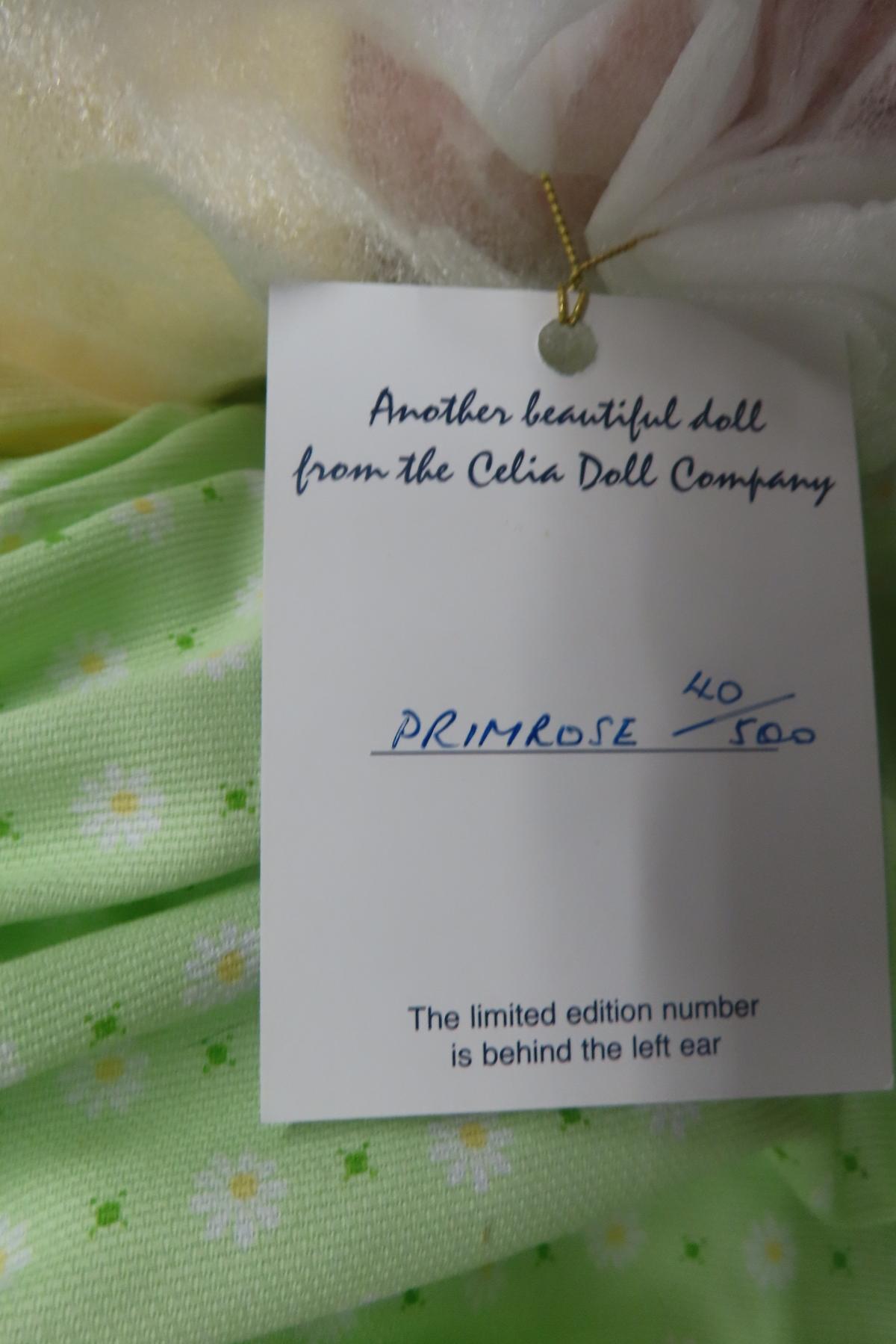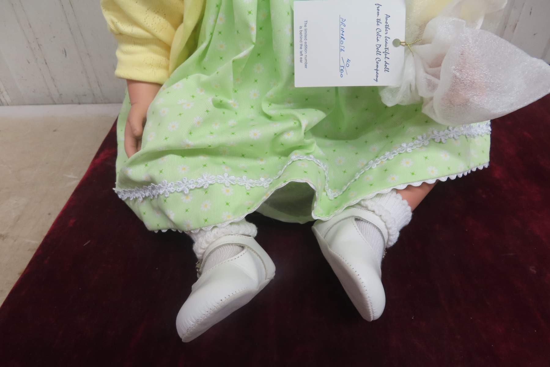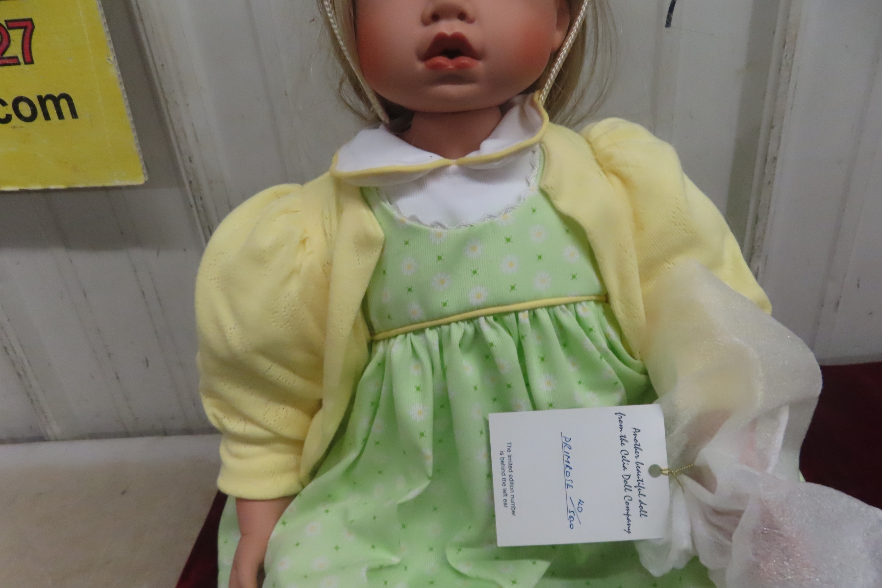 Celia Doll Company “Primrose” Doll, Limited Edition No. 40/500, Wearing Green Dress and Yellow Cardigan. Approximately 22" Tall With Original Hang Tags.