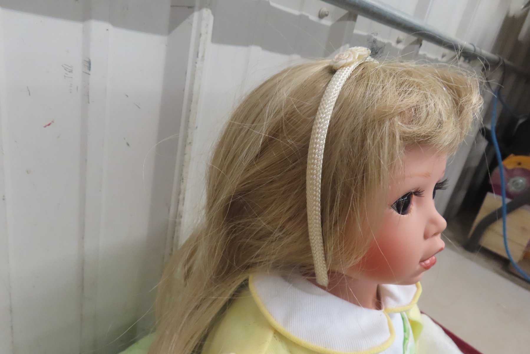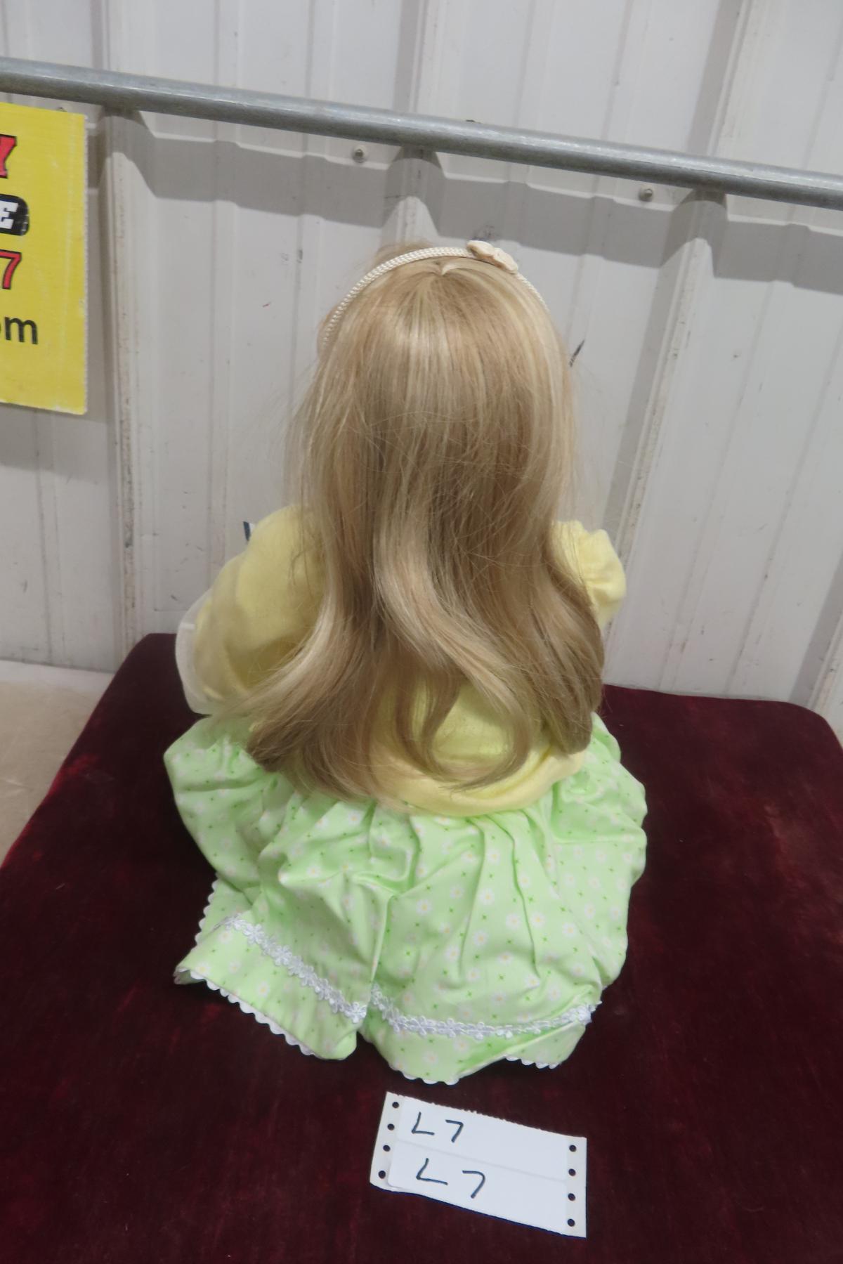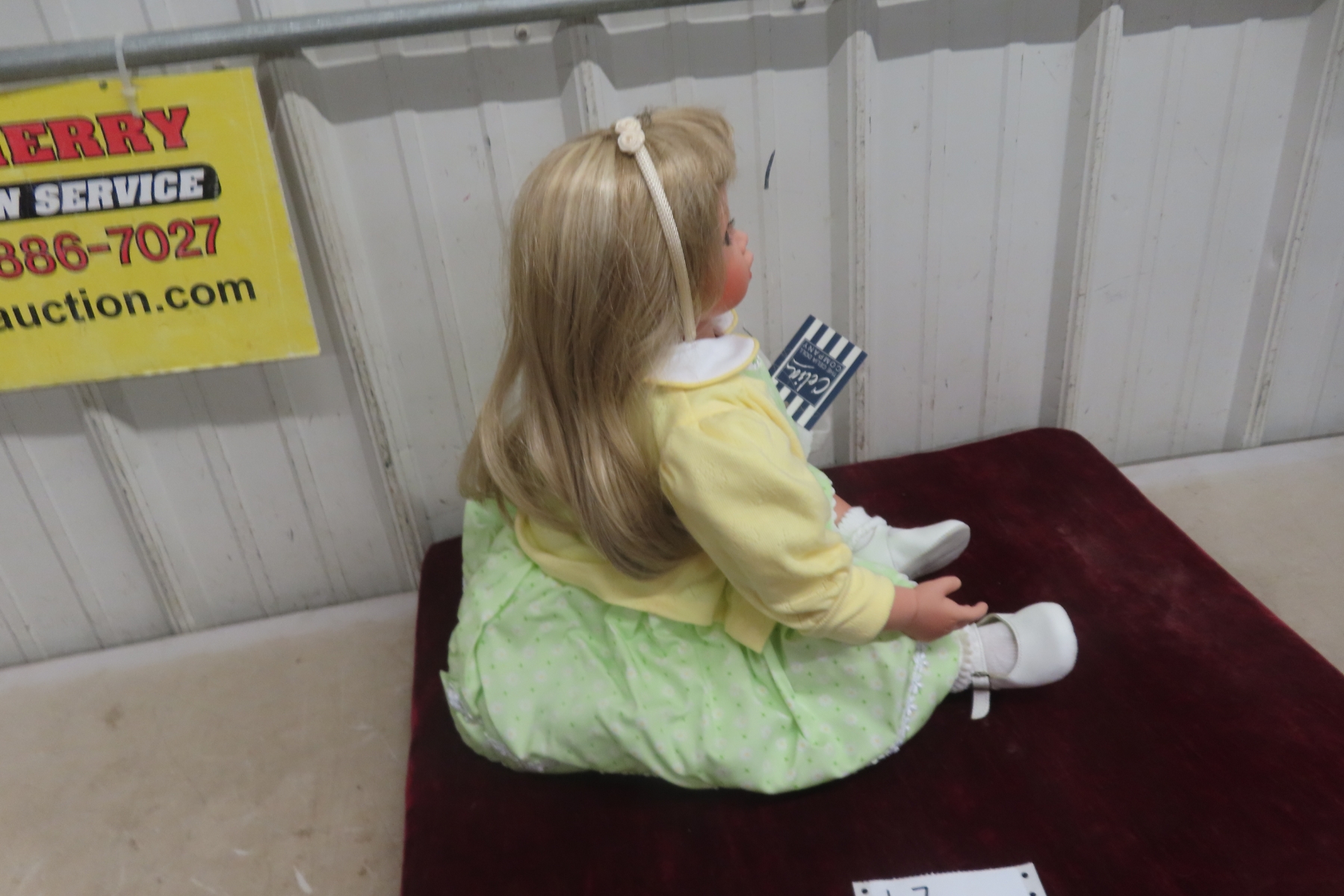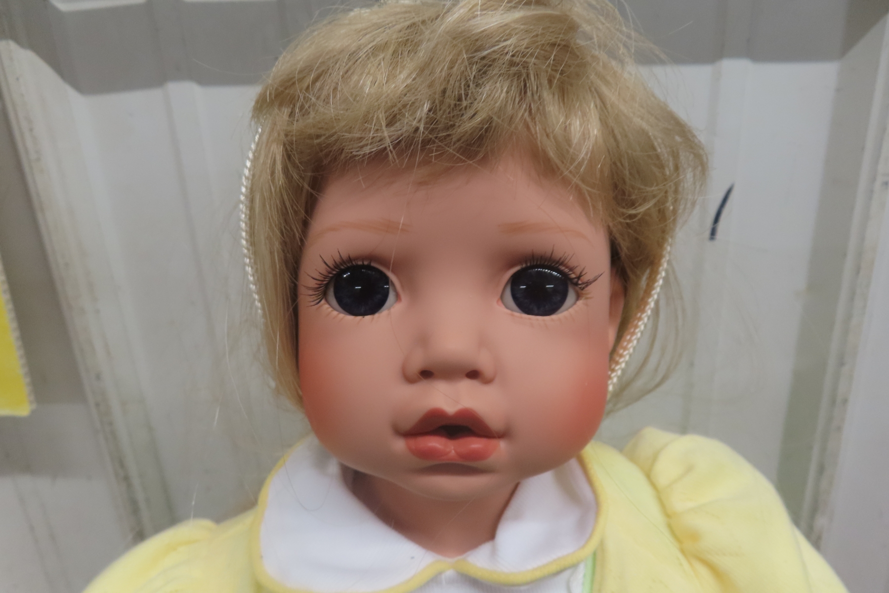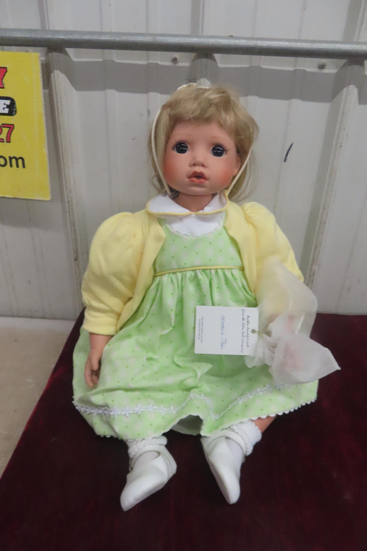 Celia Doll Company “Primrose” Doll, Limited Edition No. 40/500, Wearing Green Dress and Yellow Cardigan. Approximately 22" Tall With Original Hang Tags.