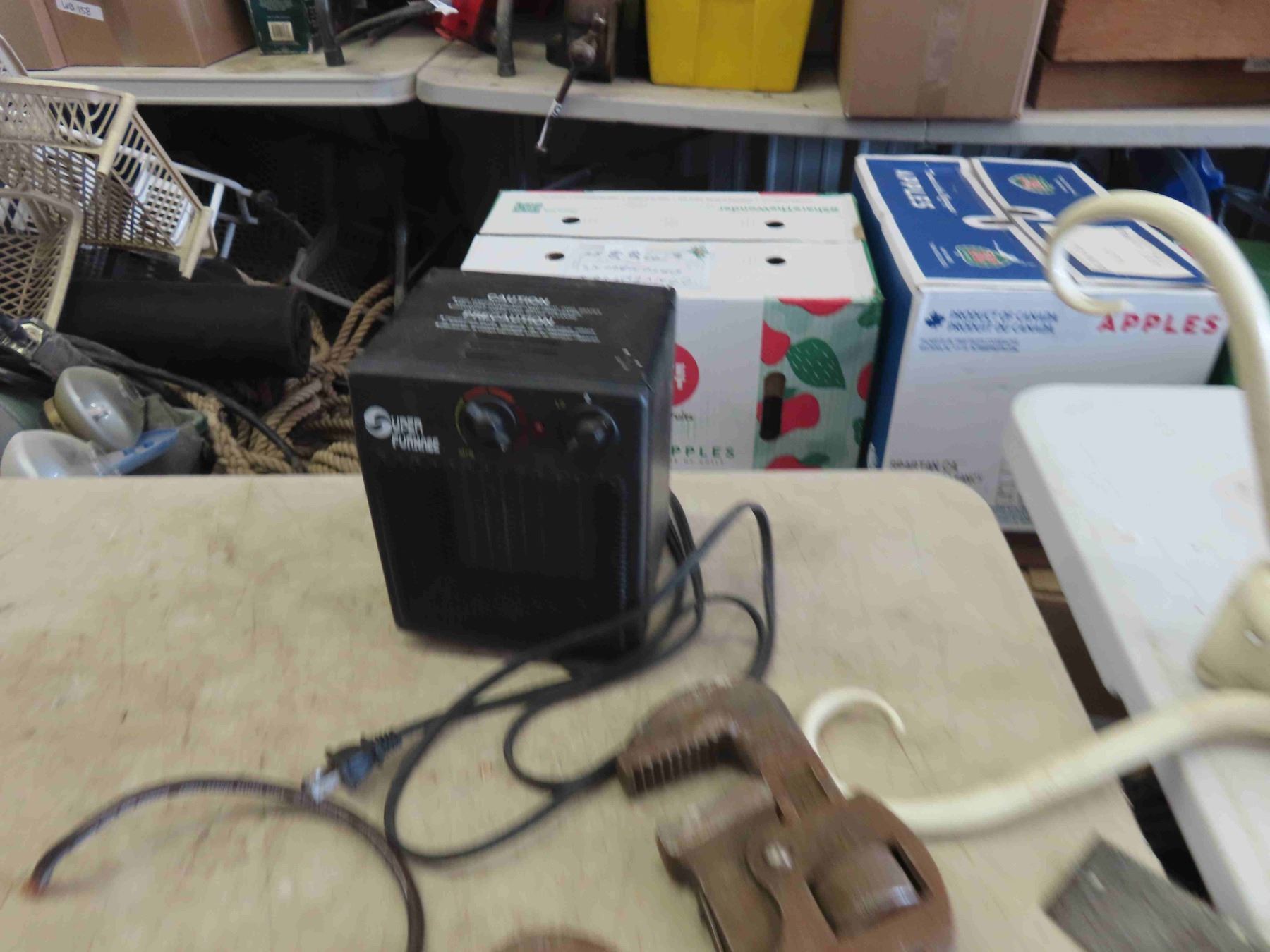 Ceramic Electric Heater, Pipe Wrench, Hooks, Shelf Brackets, Odds n Ends of Tools,