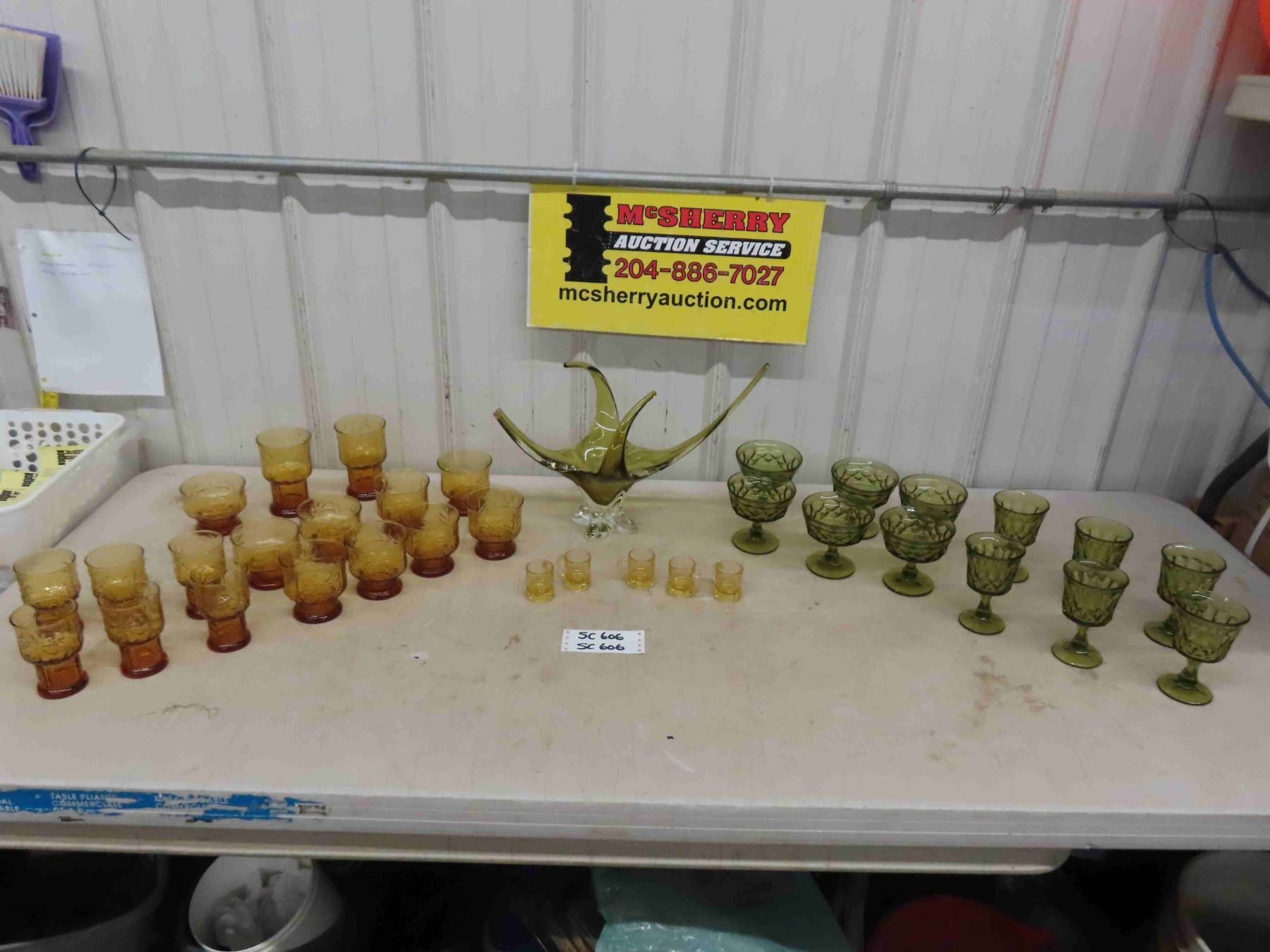 Chalet Glass Centerpiece - Green, Has Damage & Amber Daisy Embossed Glasses, Green Ice Cream Glasses, 6 Green Stemware Glasses