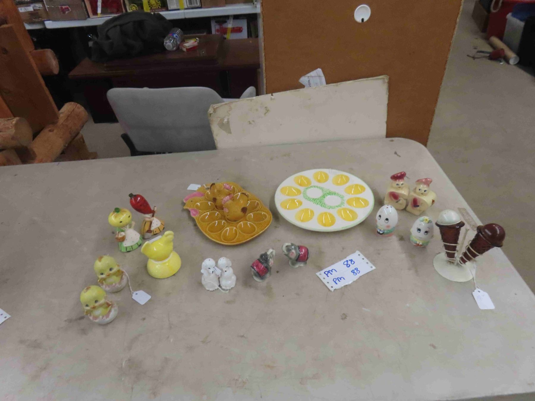 Character Salt + Pepper Shakers, Deviled Egg Server - Vintage